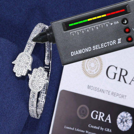 925 Sterling Silver 10.11CT Moissanite two prominent Hamsa 7" Bangle Bracelet - M300049