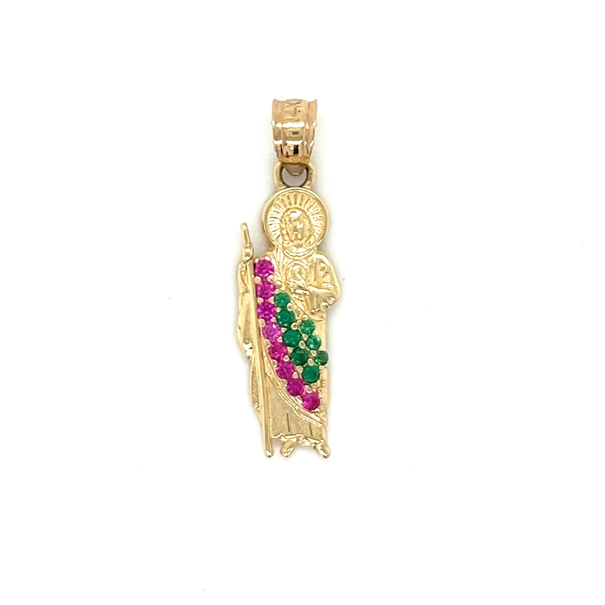 Explore el atractivo seductor del colgante San Judas de oro de 14 quilates de 1". Con un tamaño de 1" x 0,2" y un peso de aproximadamente 1,5 g , este colgante cuenta con una presencia extraordinaria y cautivadora, adornado con impresionantes piedras redondas de circonita cúbica en varios colores.