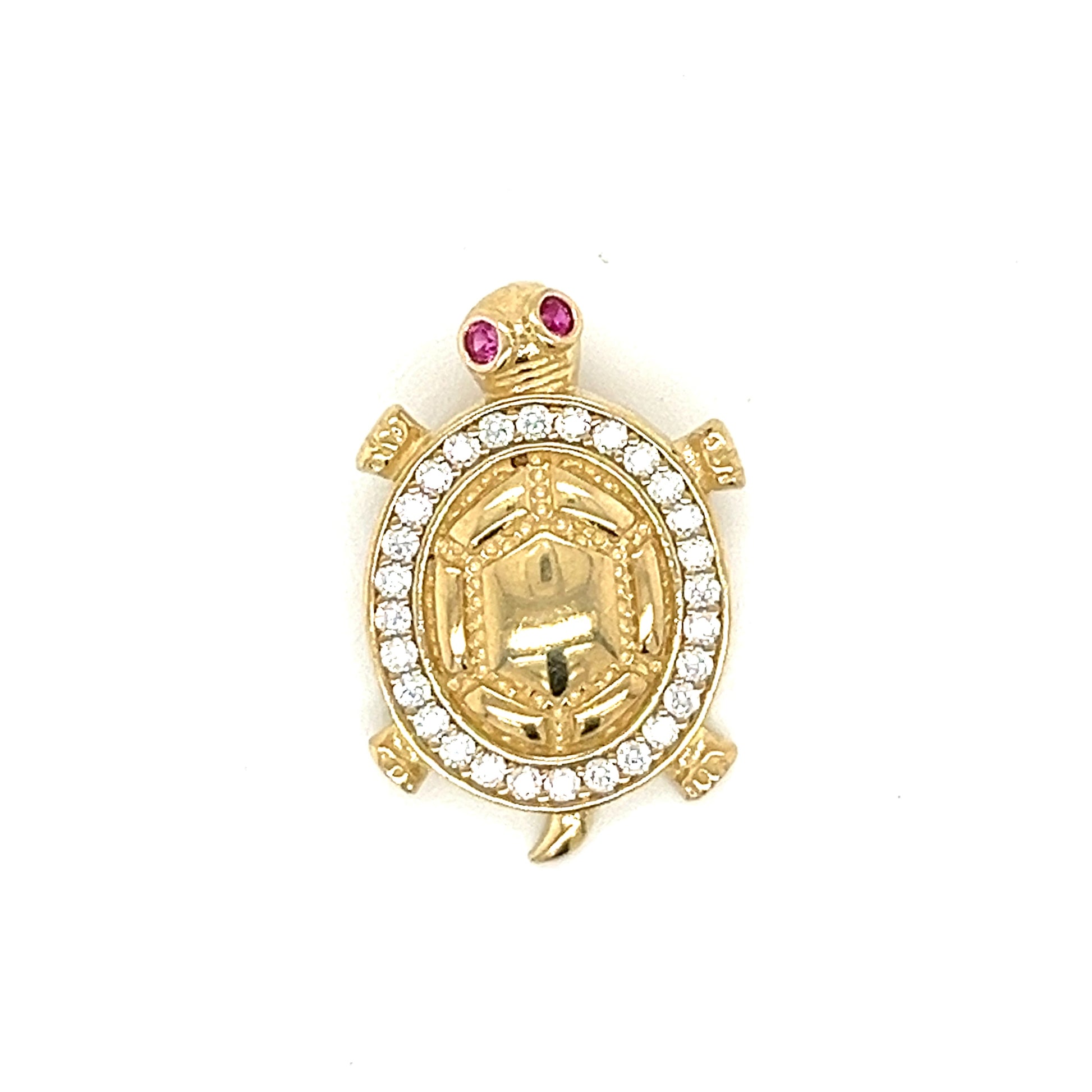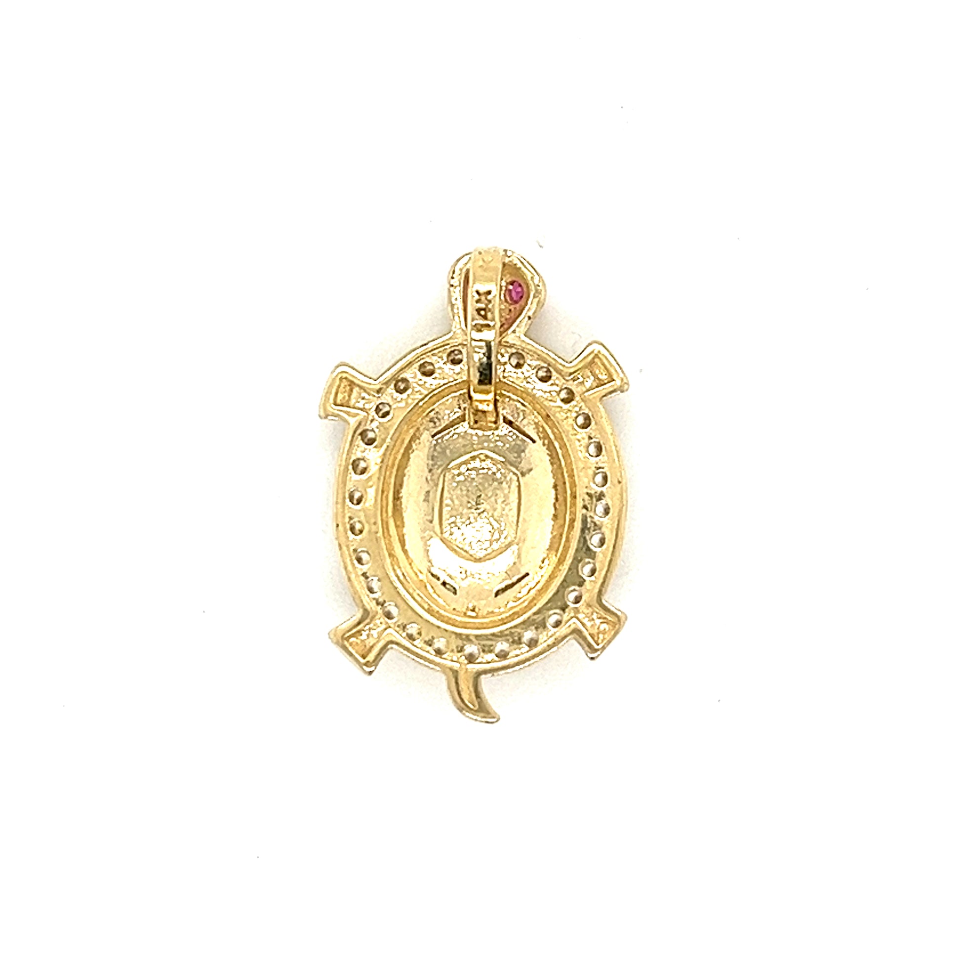 Descubra una apariencia sofisticada con el colgante Tortuga de oro de 14 quilates, que presenta piedras de color rosa que pesan aproximadamente 2 G. Esta pieza atemporal, que mide 0,5" x 0,5" y está adornada con centelleantes piedras de circonita cúbica redondas, irradia sofisticación y encanto.