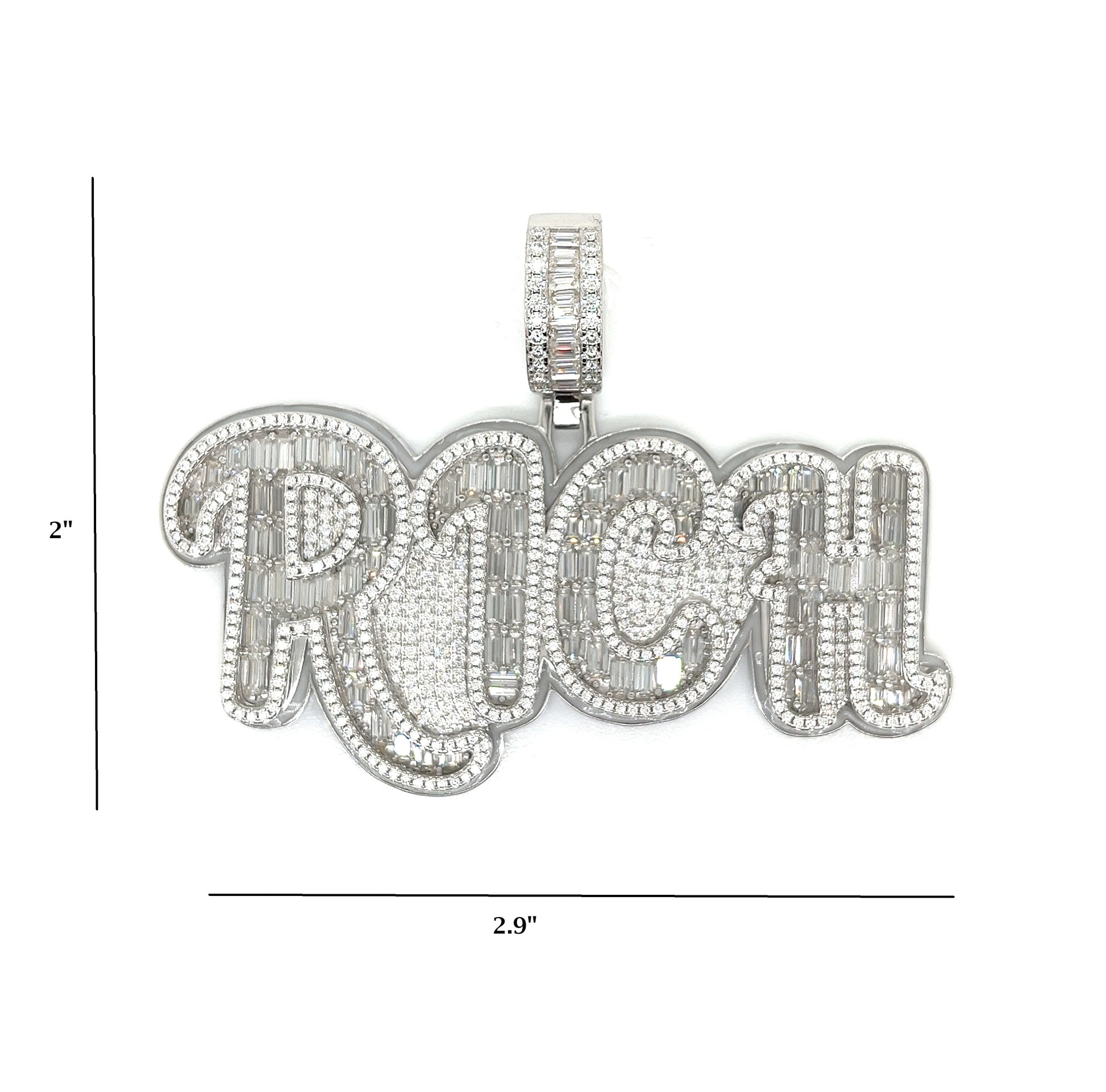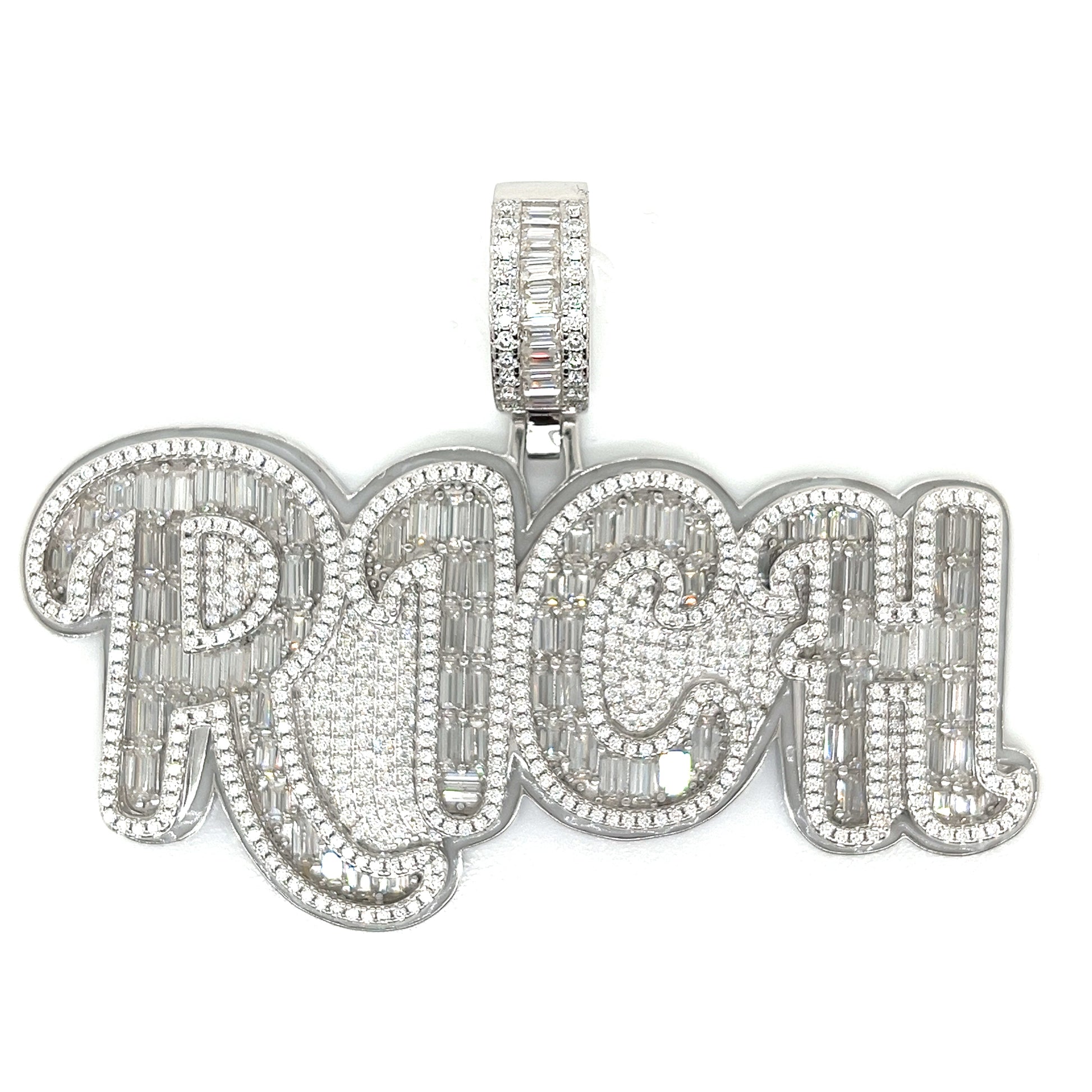 Colgante DOPE de plata de ley 925 rodiada adornado con aprox. 15,52 quilates de piedras Baguette y Moissanita redonda. Este colgante de 2*3 pulgadas irradia sofisticación. Diseñado para una durabilidad duradera y un estilo inigualable.