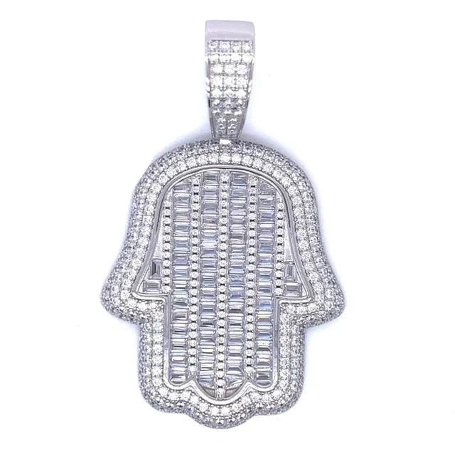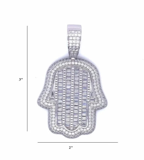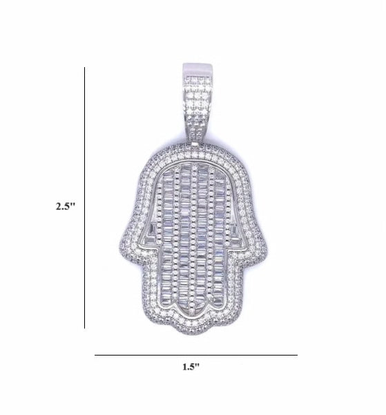 Colgante Hamsa de plata de ley 925 rodiada adornado con aprox. Piedras redondas y baguette de moissanita de 8,63 ct y 19,07 ct. Este colgante de 2,5" x 1,5" y 3" x 2" irradia sofisticación. Diseñado para una durabilidad duradera y un estilo inigualable.