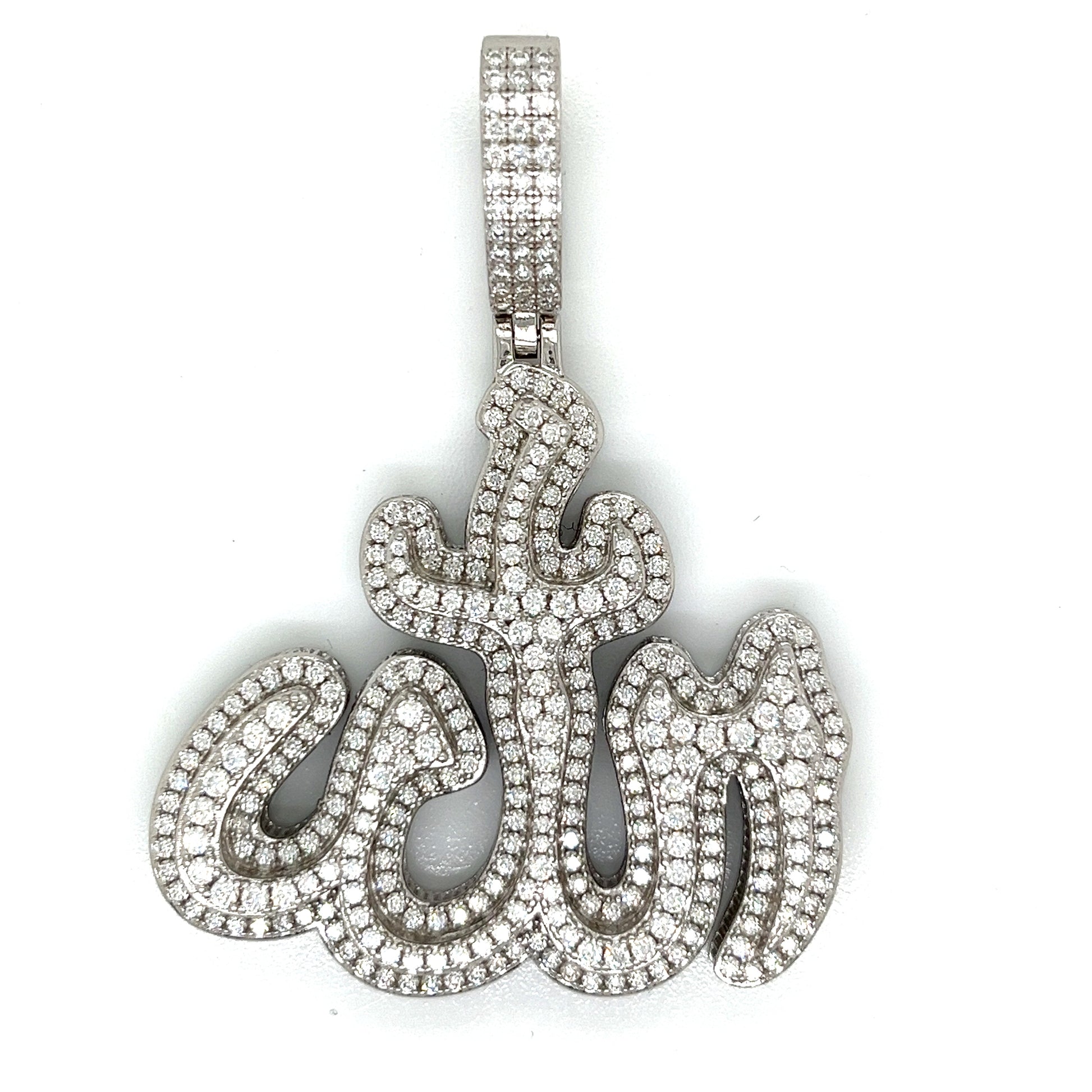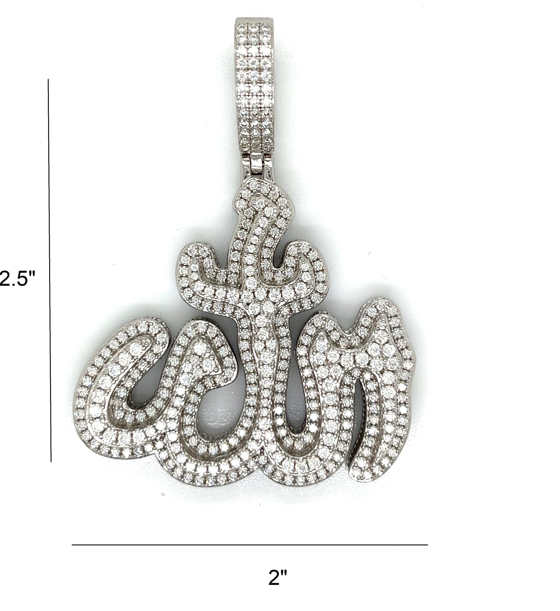 Colgante Alá de plata de ley 925 rodiada adornado con aprox. 9,31 quilates de piedras moissanitas redondas. Este colgante de 2,5" x 2" rezuma sofisticación. Diseñado para una durabilidad duradera y un estilo inigualable.
