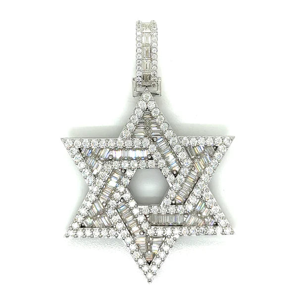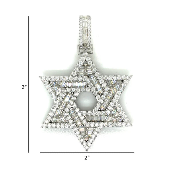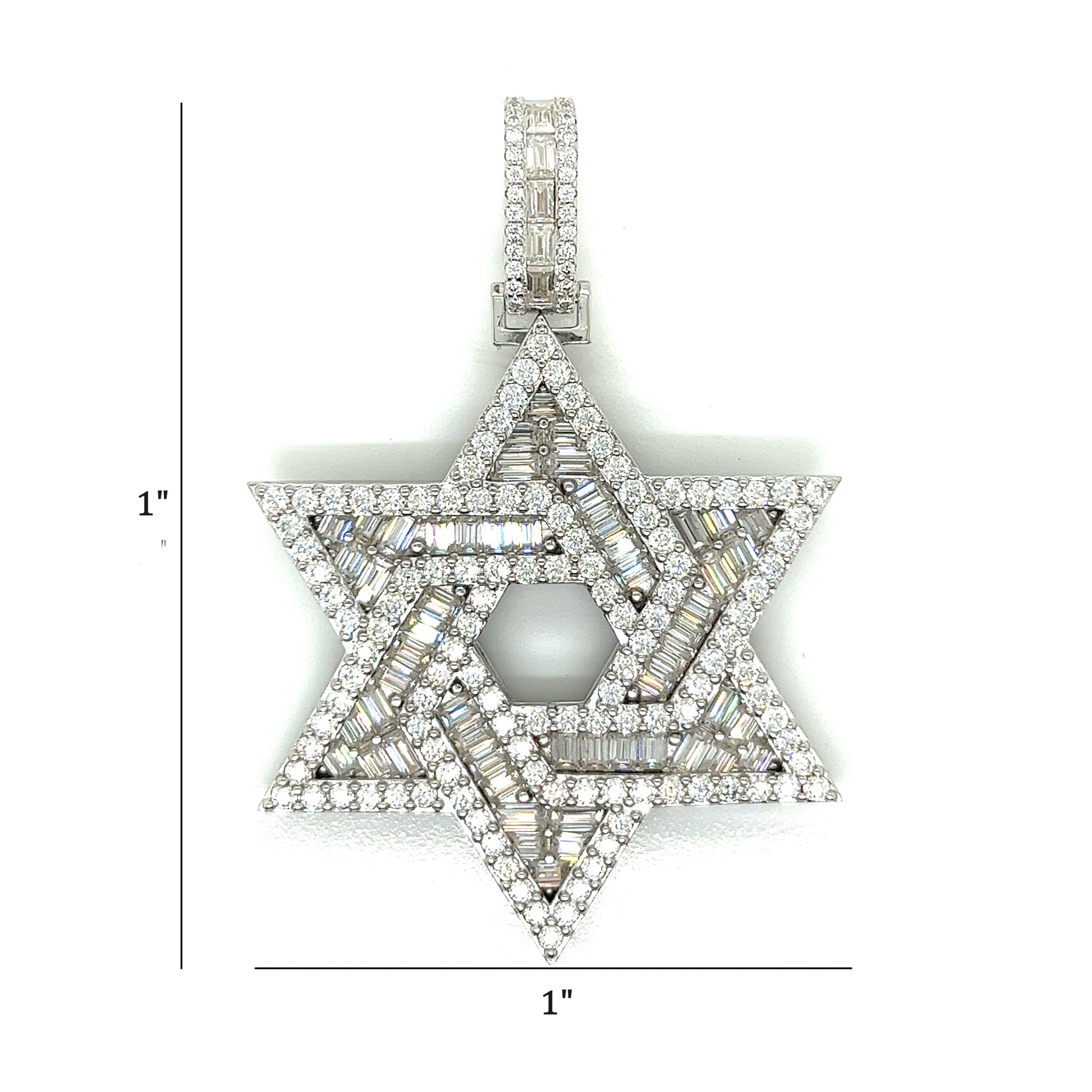 Colgante ESTRELLA DE DAVID de Plata de Ley 925 disponible en diferentes tamaños, adornado con aprox. Piedras baguette y moissanita redonda de 2,14 quilates y 9,51 quilates . Este colgante de 1" y 2" irradia sofisticación. Diseñado para una durabilidad duradera y un estilo inigualable.