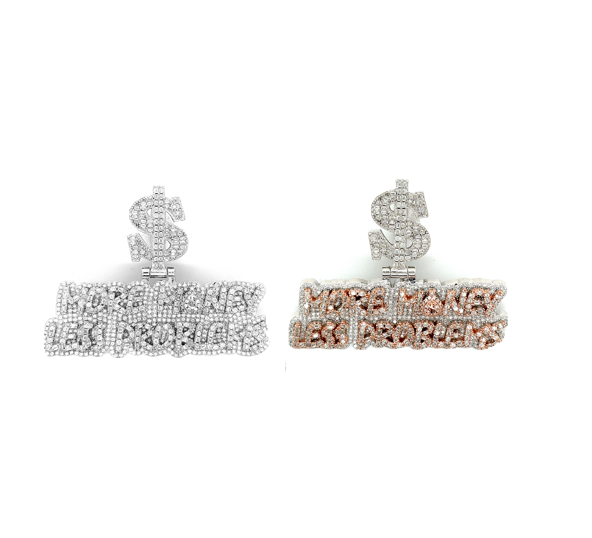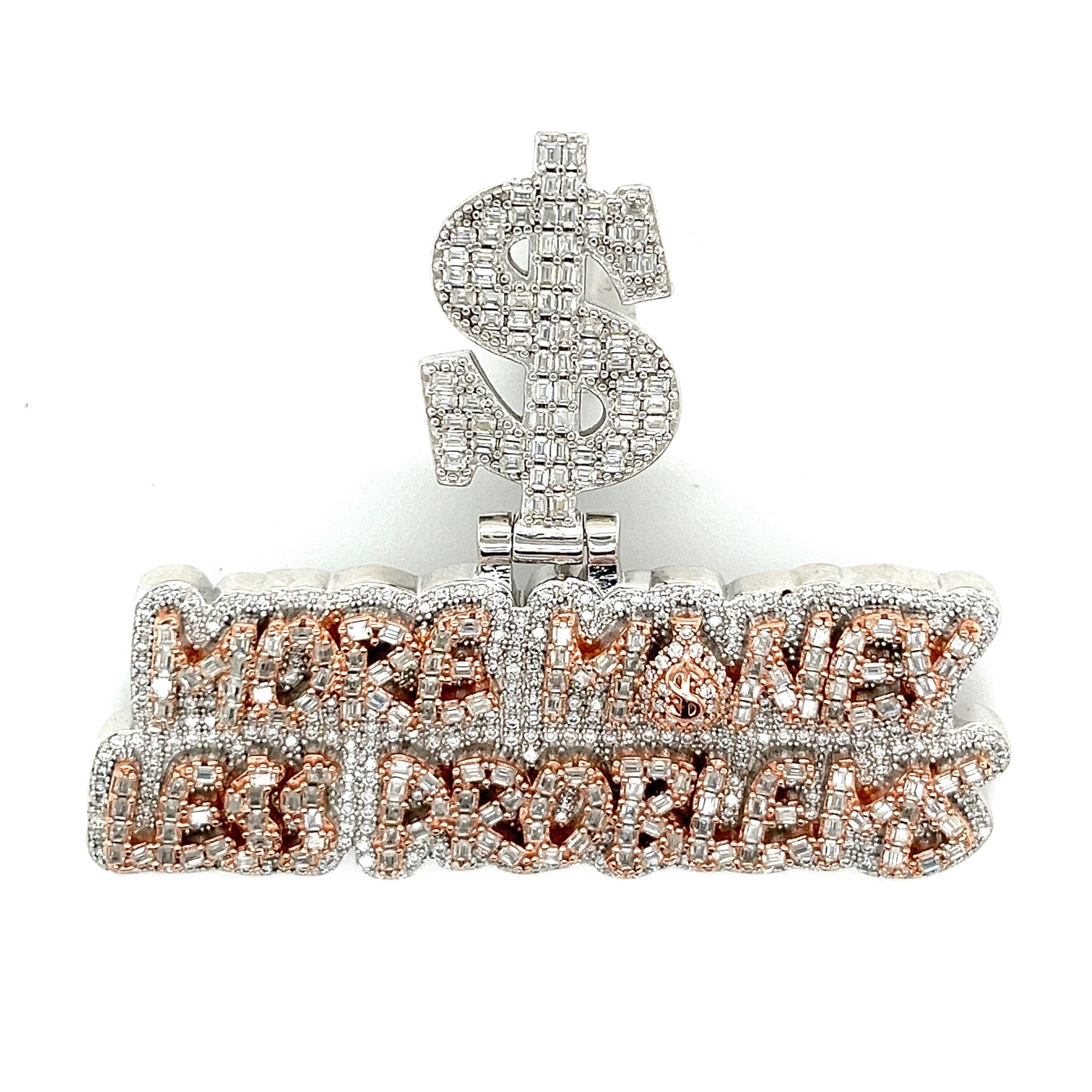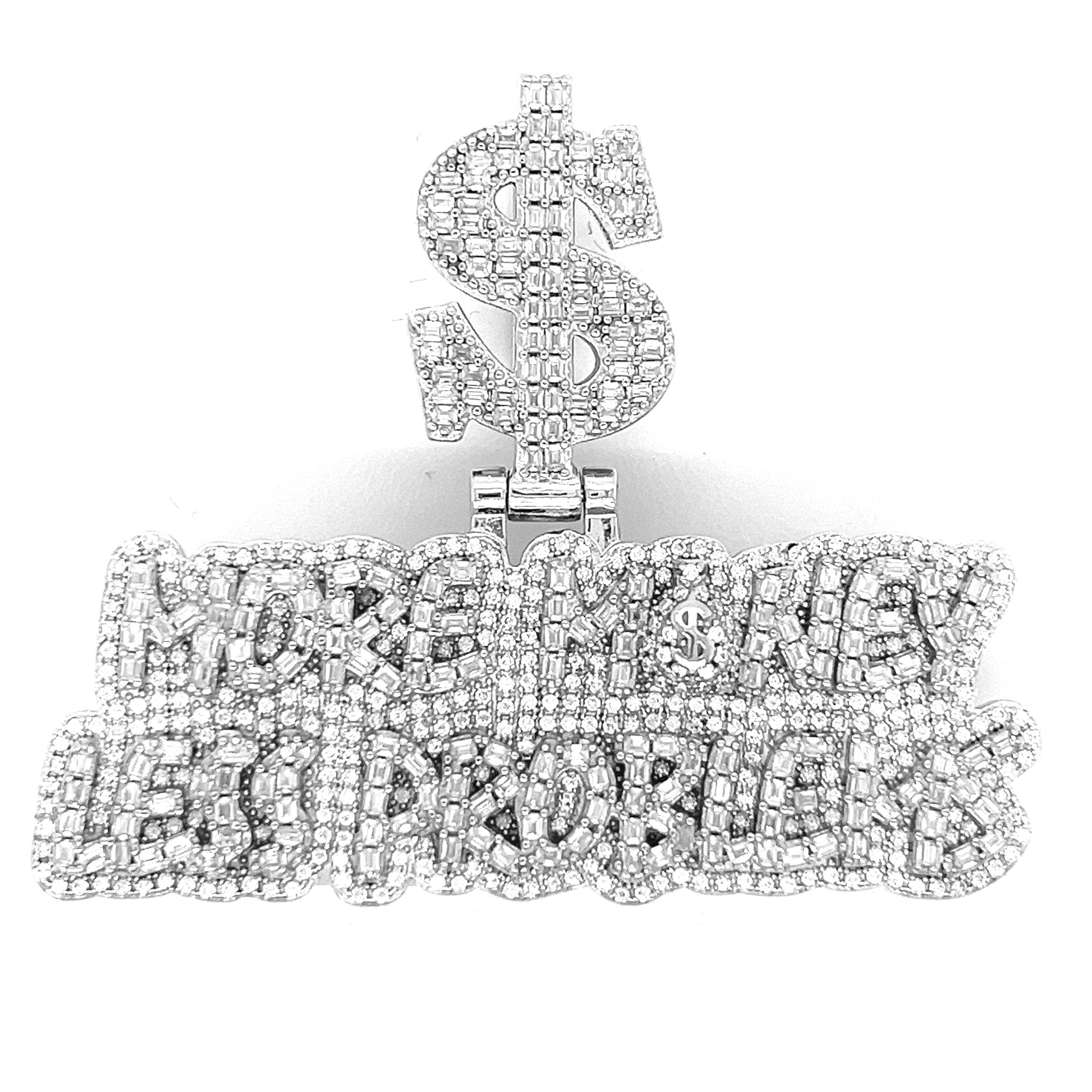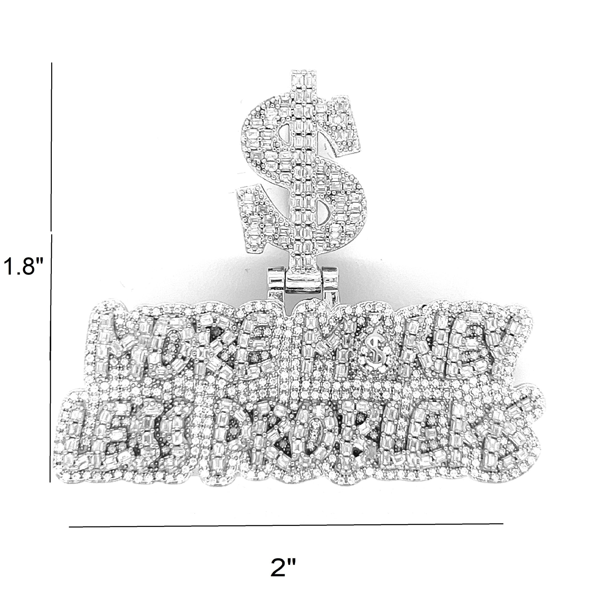 Plata de Ley 925 Rodiada MÁS DINERO MENOS PROBLEMAS Colgante adornado con aprox. 5,7 quilates de piedras moissanita redondas y baguette. Este colgante de 1,8* pulgadas irradia sofisticación. Diseñado para una durabilidad duradera y un estilo inigualable.