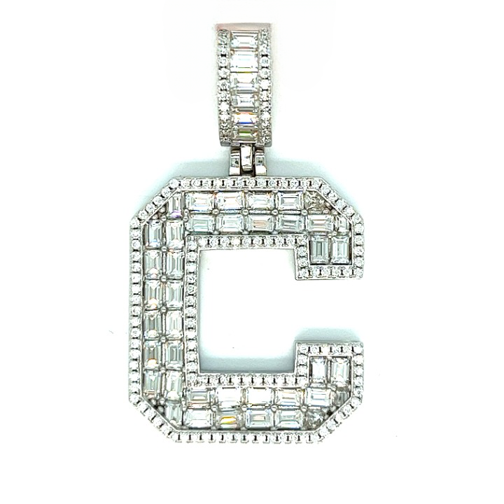 Colgante de plata de ley 925 con inicial "C" y rodio elaborado con aprox. 5,5 quilates, con una hermosa talla esmeralda con piedras baguette y moissanita redondas. Es una sorprendente combinación de elegancia y sentimiento, lo que lo convierte en el accesorio perfecto para darle un toque de lujo.