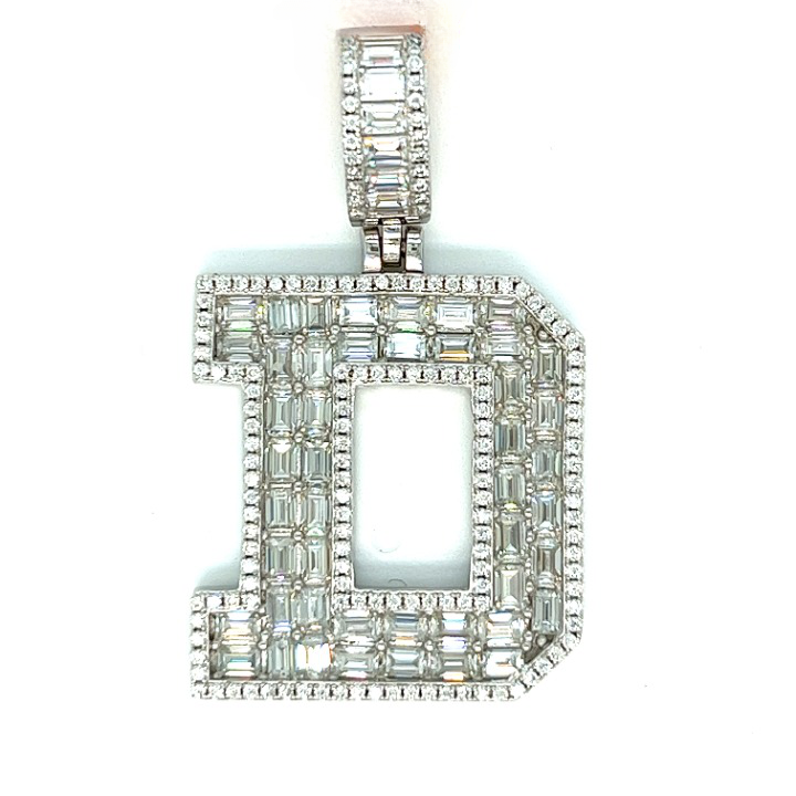 Colgante de plata de ley 925 con inicial "D" y rodio elaborado con 6,32 quilates, con talla esmeralda con piedras baguette y MOISSANITA redondas. Con un tamaño de 1,8" x 1" pulgadas, es una sorprendente combinación de elegancia y sentimiento, lo que lo convierte en el accesorio perfecto para darle un toque de lujo.