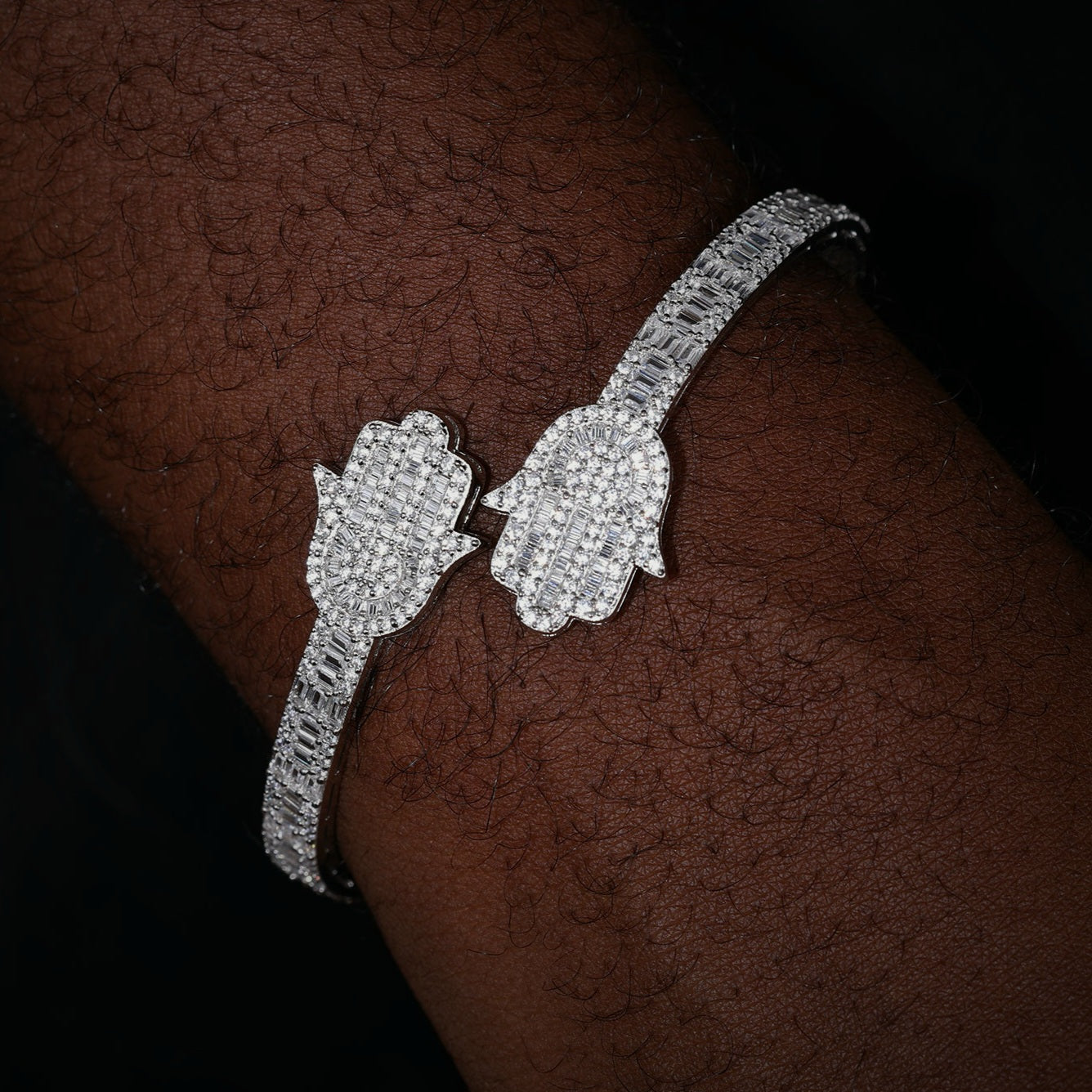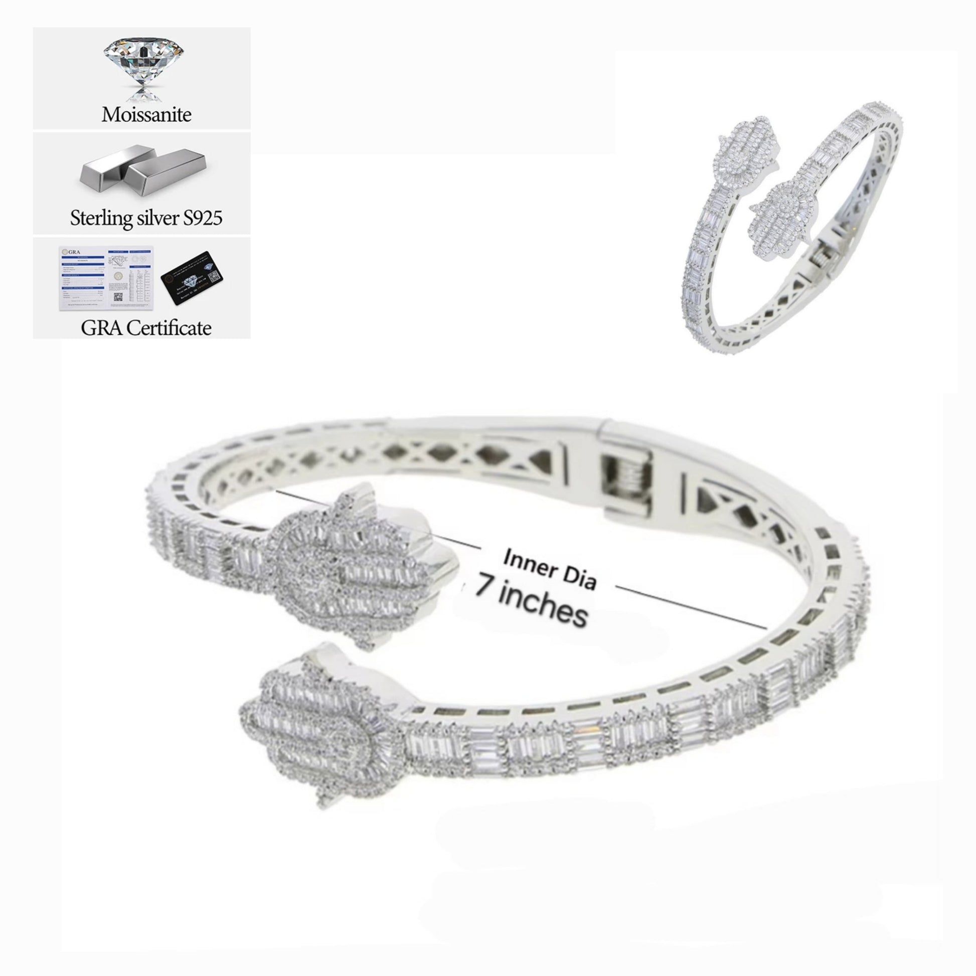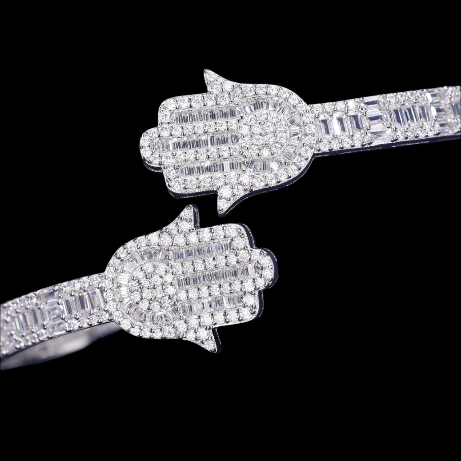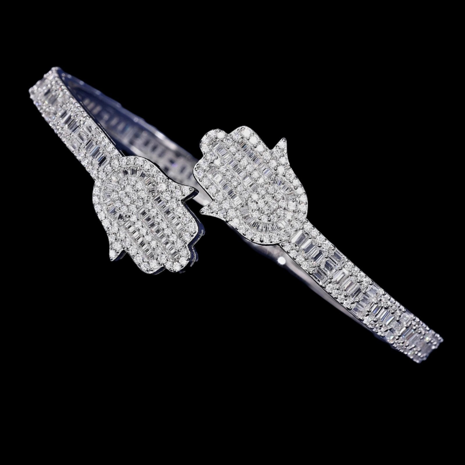Elevate your style with this timeless 925 Sterling Silver two prominent hamsa 7" Bangle Bracelet. This stunning piece features high-quality 2.09ct Round and 8.02ct Baguette Moissanite adding a touch of glamour to any look. Made with 925 Sterling Silver, it is both elegant and durable, making it a must-have addition to your jewelry collection. Available Color: White Silver.