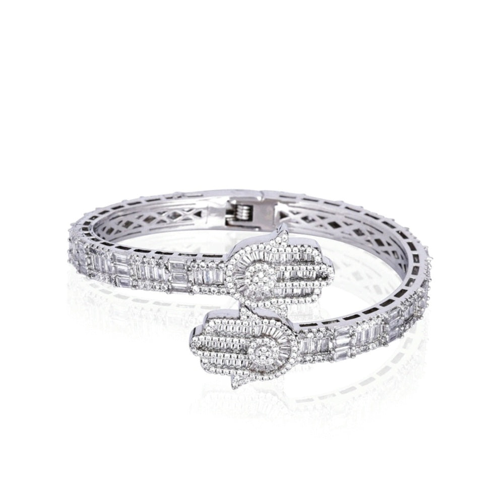 925 Sterling Silver 10.11CT Moissanite two prominent Hamsa 7" Bangle Bracelet - M300049