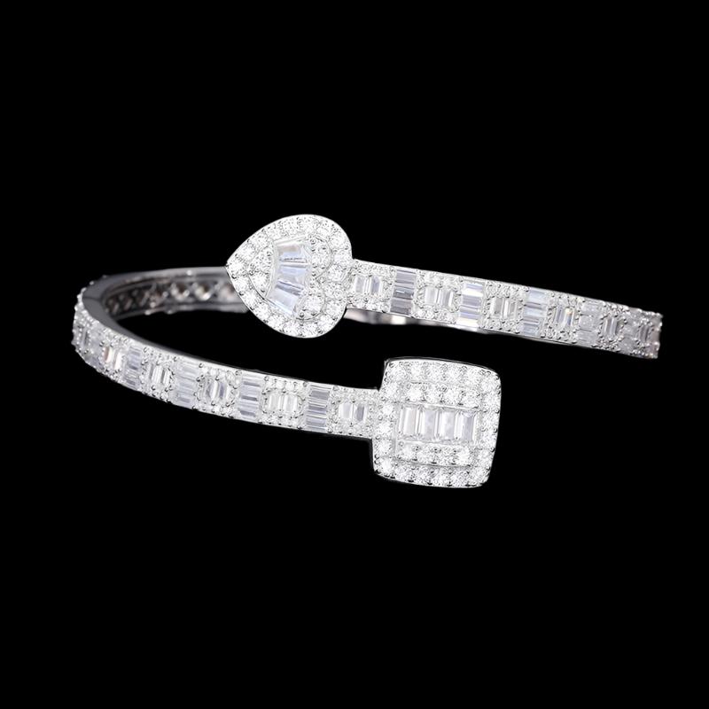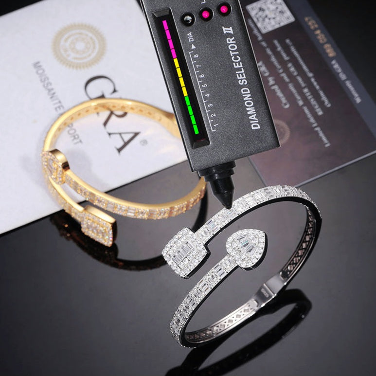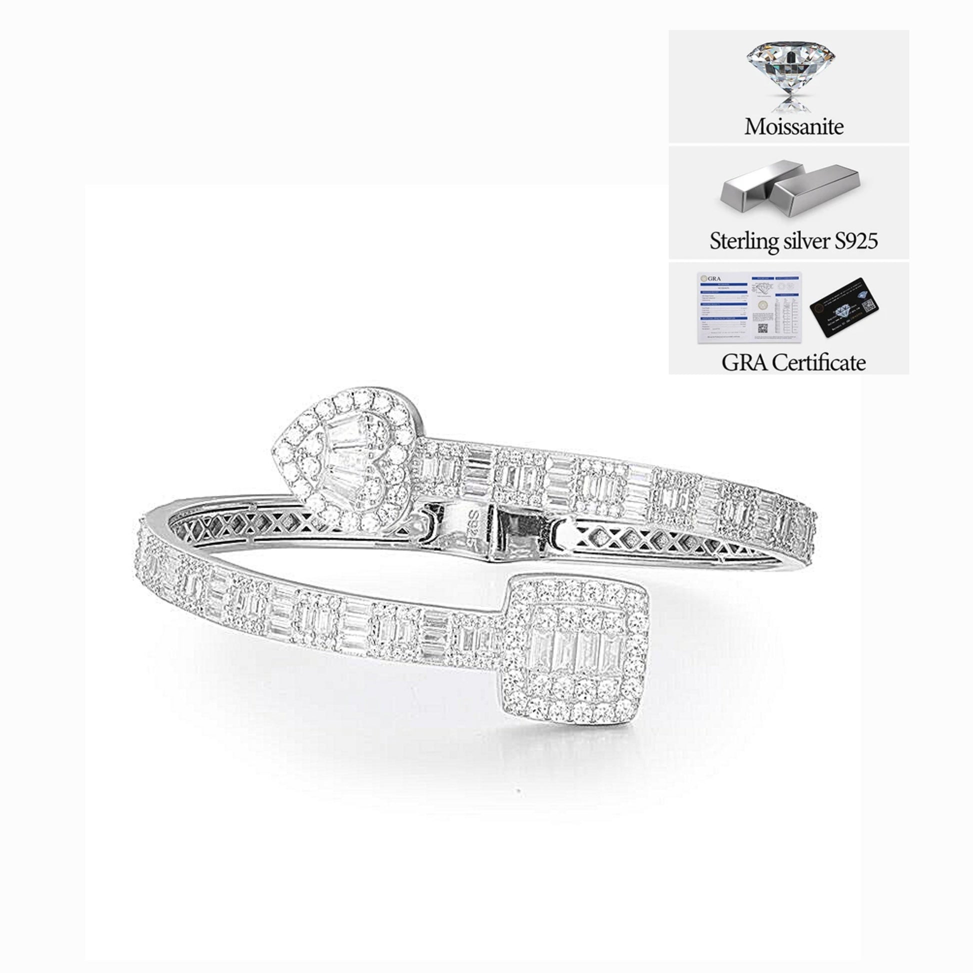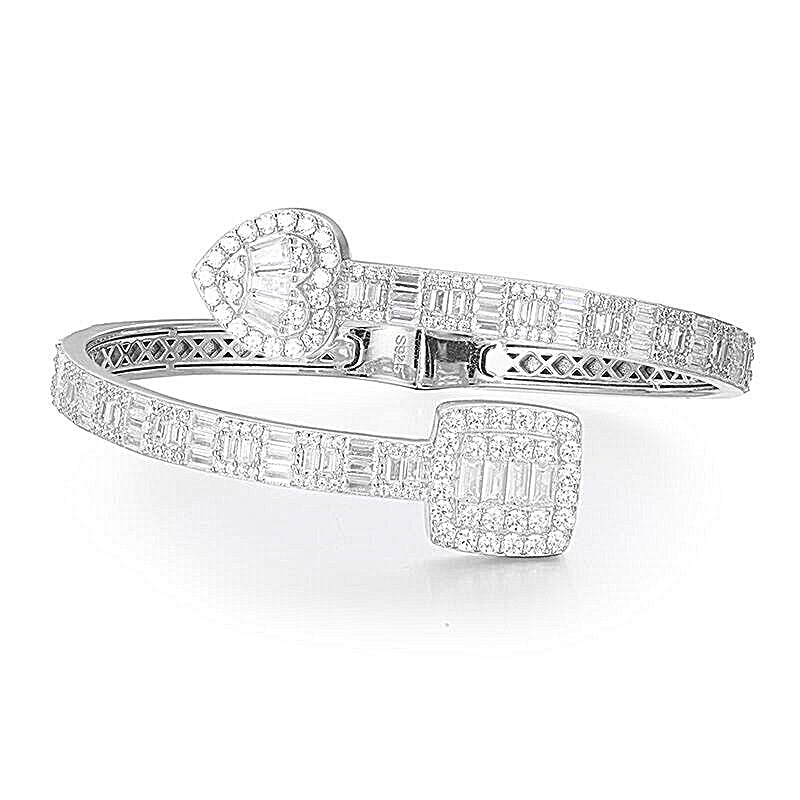 925 Sterling Silver 8.55CT Moissanite Heart & Square prominent 7" Bangle Bracelet - M300059