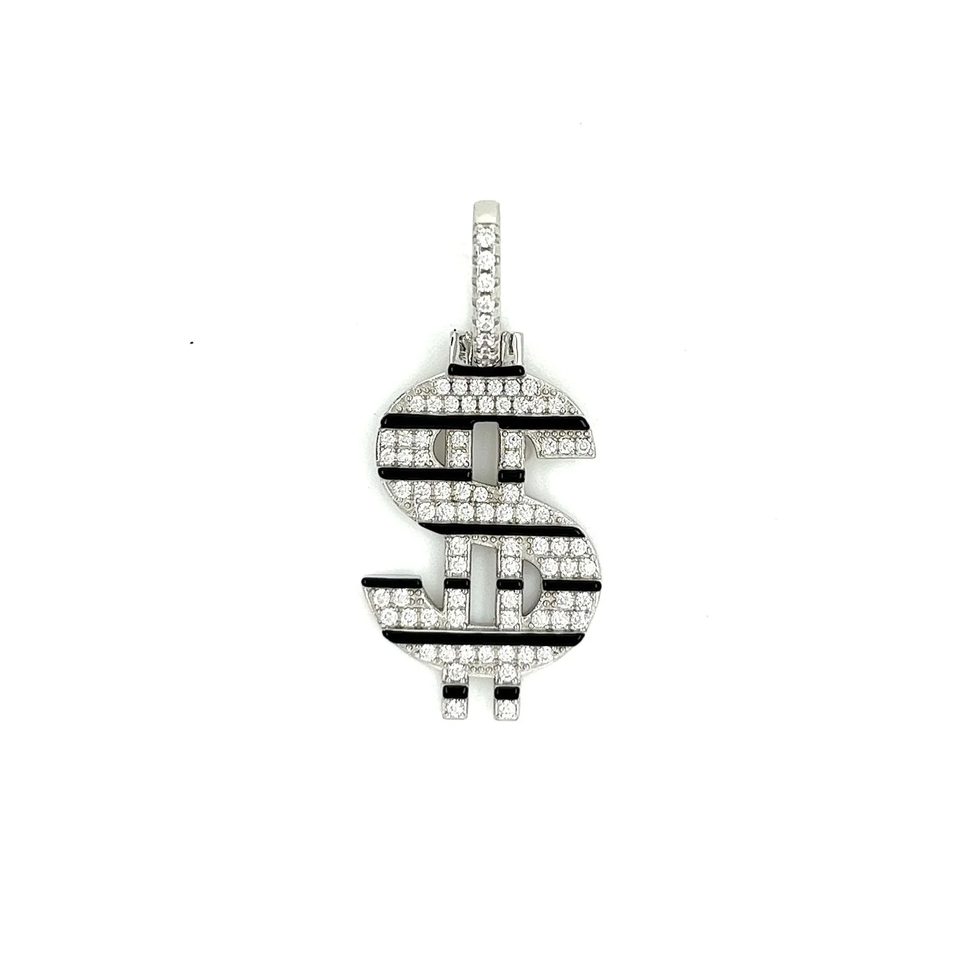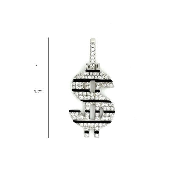 Colgante con signo de dólar de plata de ley 925 y rodio adornado con piedras redondas de circonita cúbica. Este colgante de 1,7 x 0,7 pulgadas irradia sofisticación. Diseñado para una durabilidad duradera y un estilo inigualable.