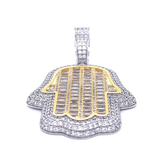 Mano de Hamsa chapada en oro amarillo y rosa de 14 quilates en plata de ley 925 rodiada con piedras de circonita baguette centradas y borde de piedras de circonita redondas.