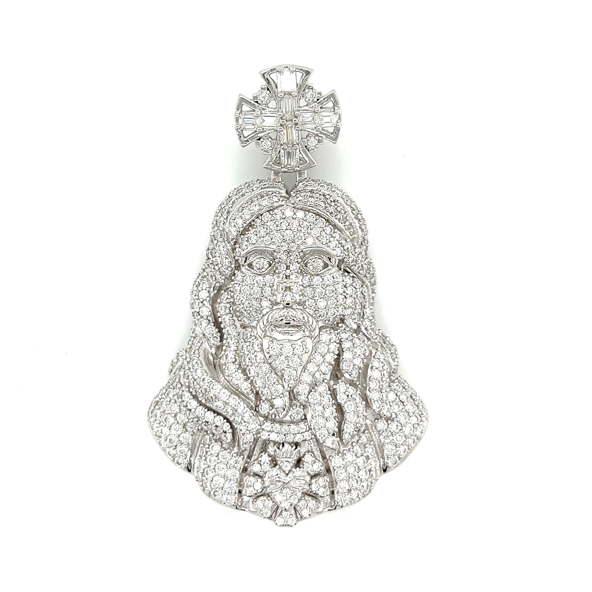 Impresionante colgante con cara de Jesús en plata de ley 925 con rodio y circonita cúbica de 45 mm: eleva tu estilo con esta belleza atemporal. Con piedras de circonita cúbica redondas y baguette, añade un toque de glamour a cualquier look.