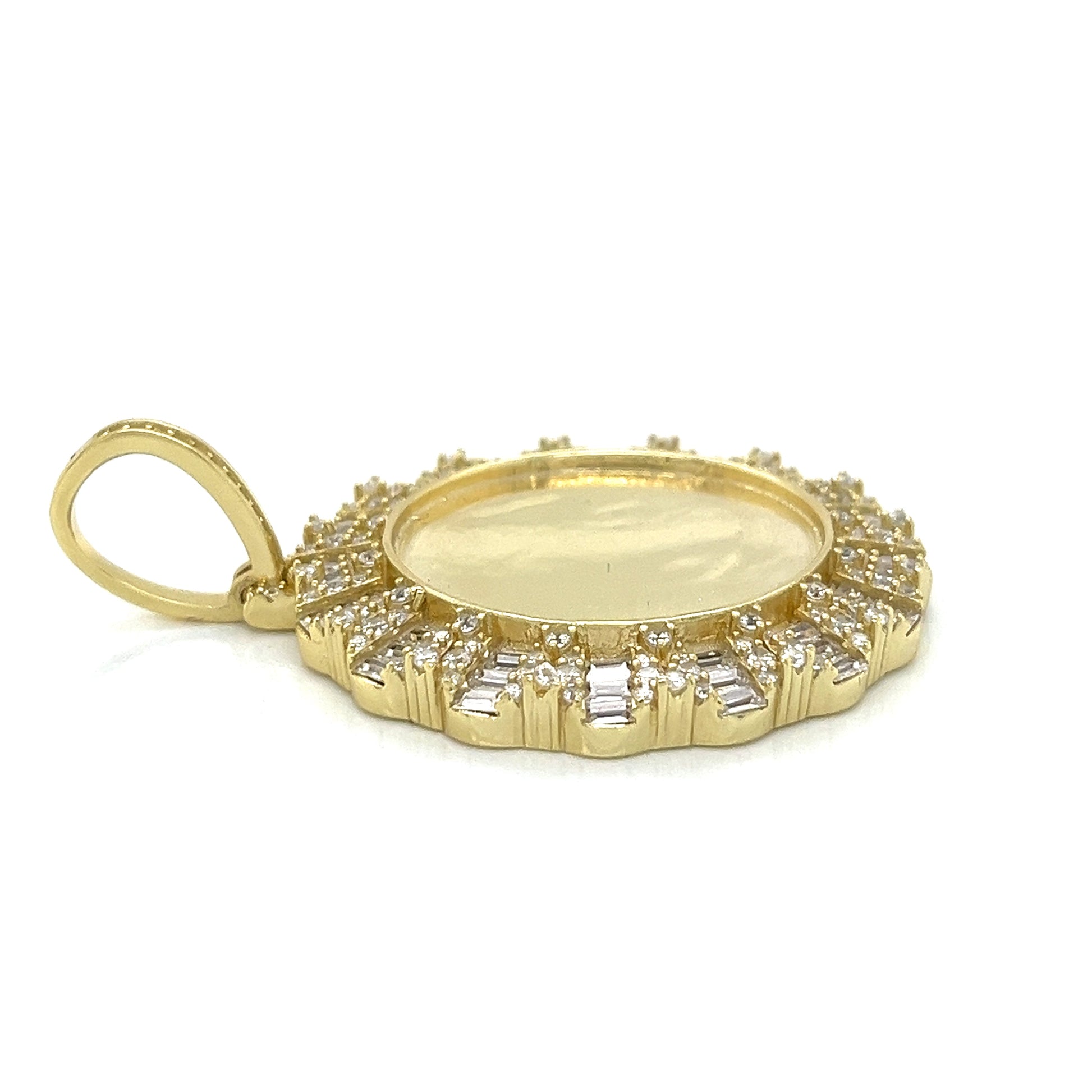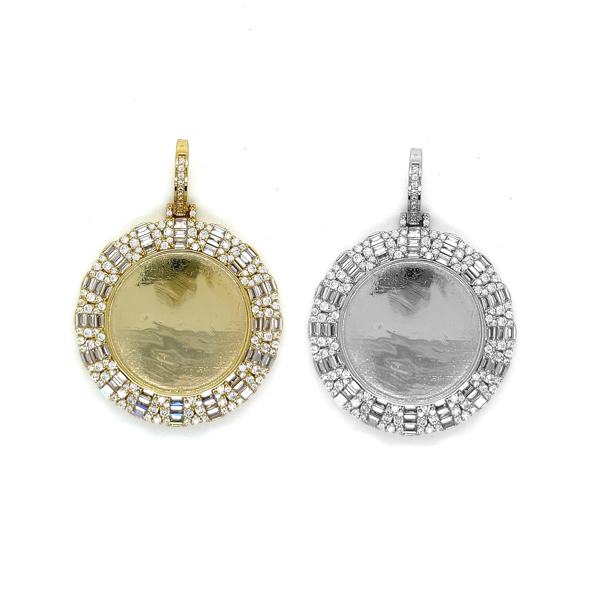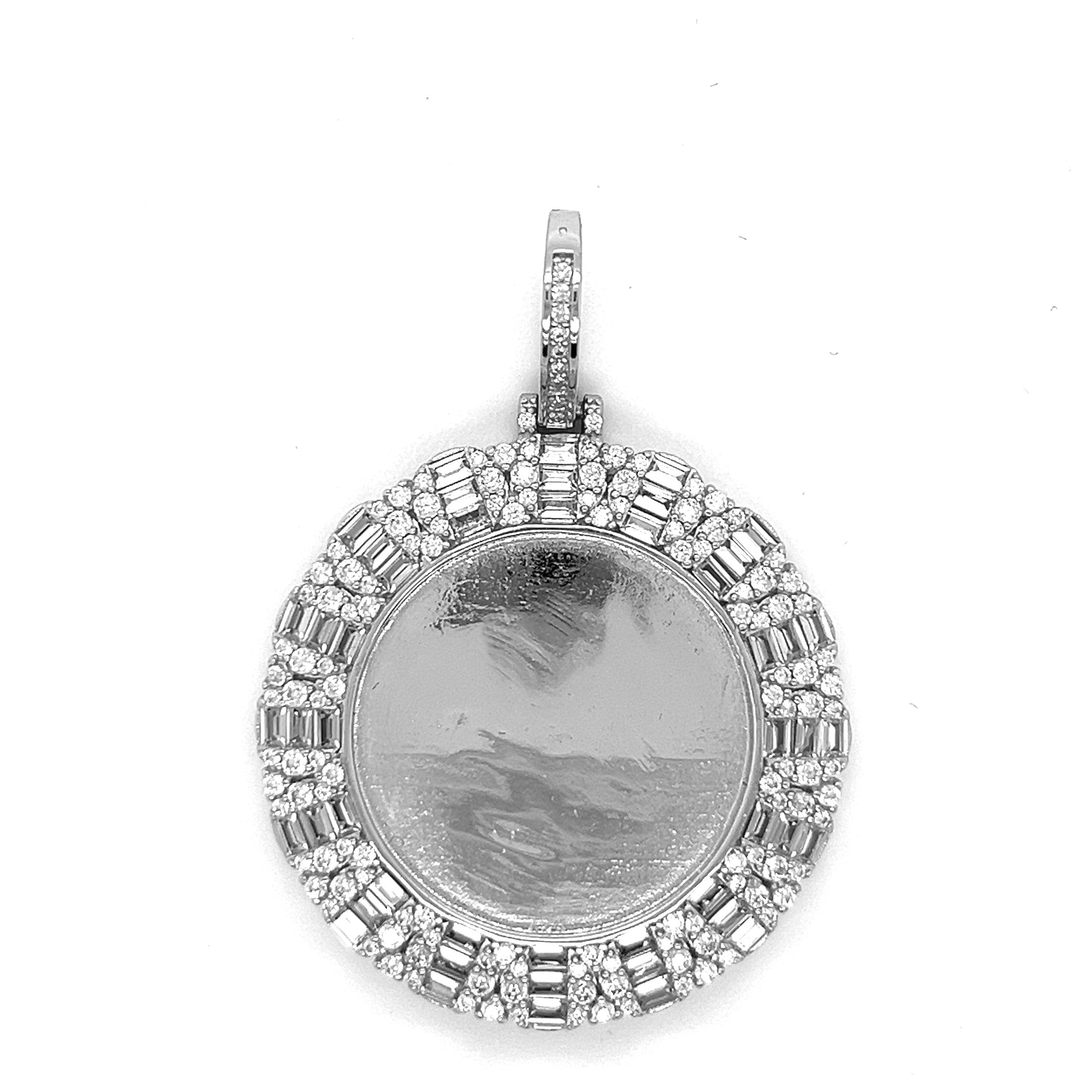 Colgante con imagen redonda de plata de ley 925 adornado con piedras baguette y circonitas redondas. Este colgante de 1,8" x 1,2" irradia sofisticación. Diseñado para una durabilidad duradera y un estilo inigualable.