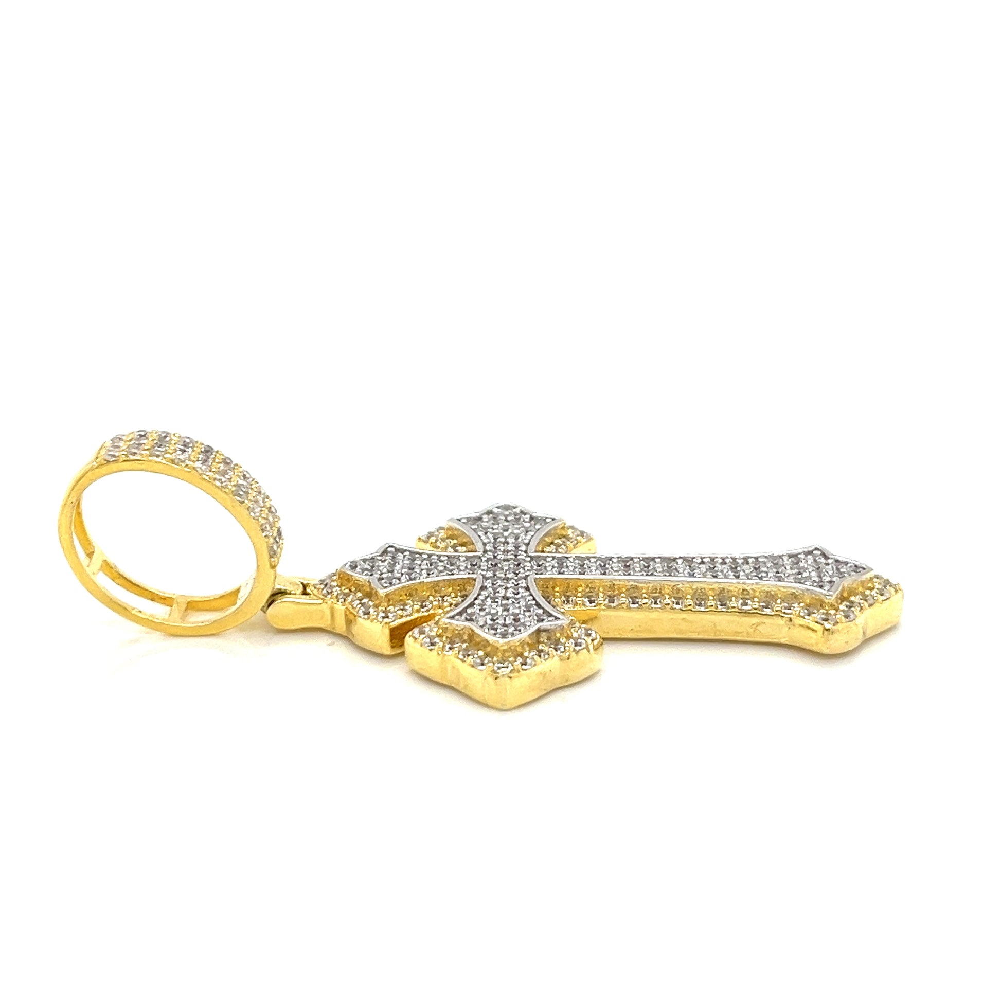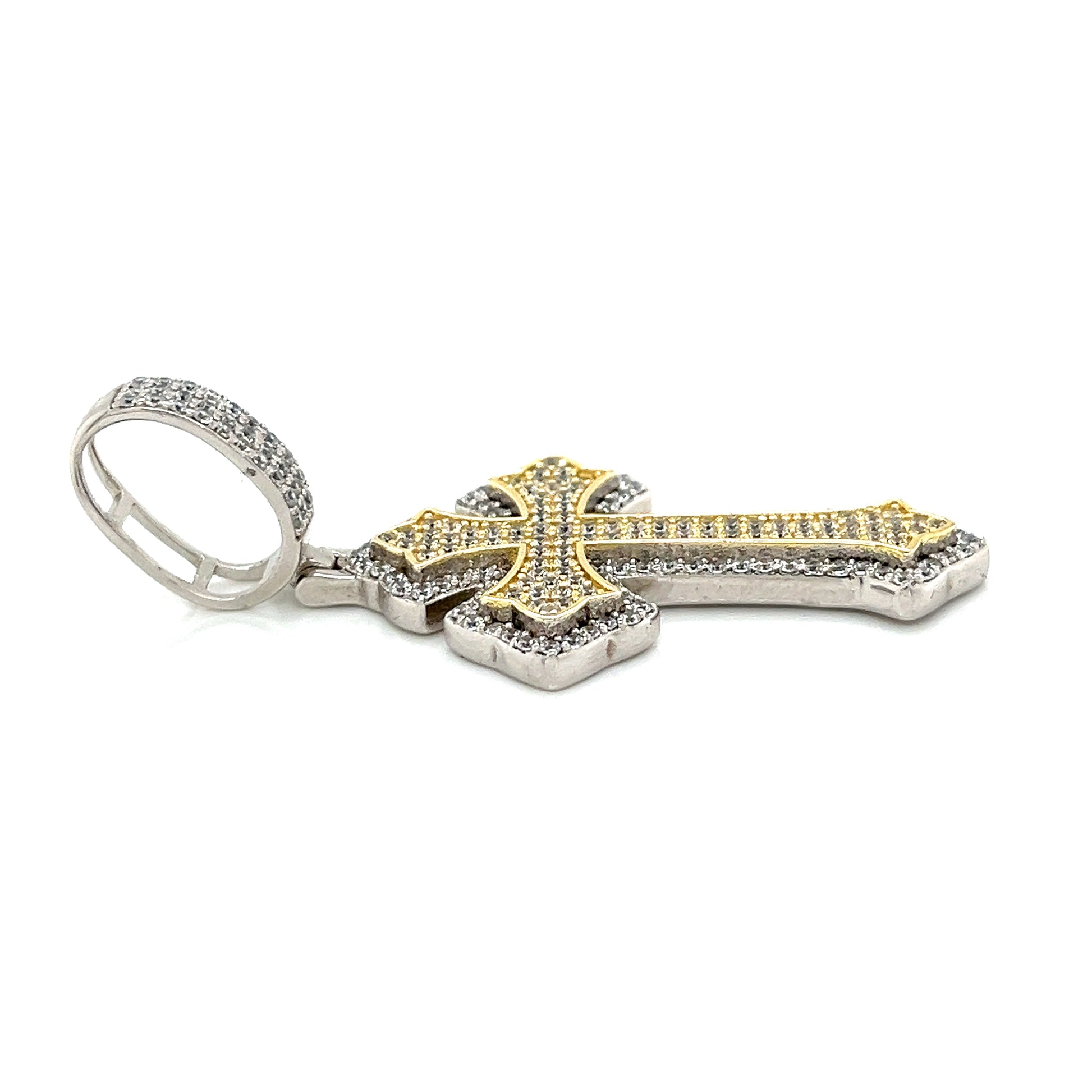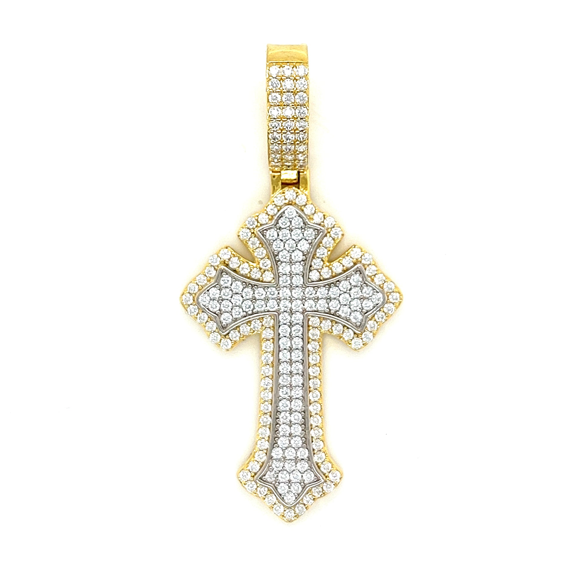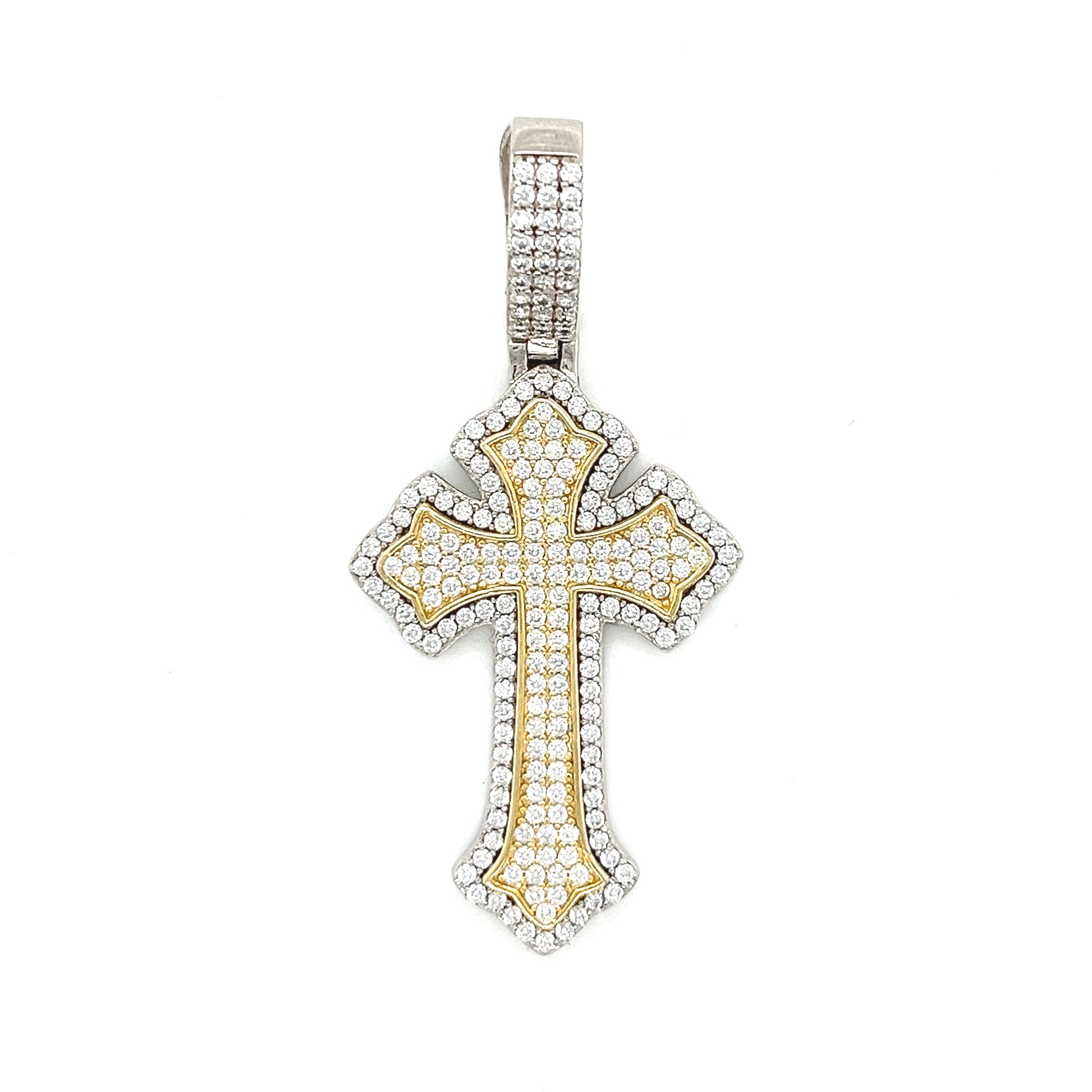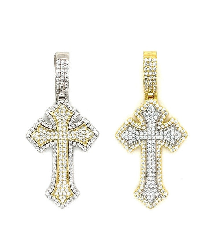 Abrace la elegancia con nuestro colgante de doble cruz de dos tonos con acabado en oro de 14 quilates y plata de ley 925. Este colgante está adornado con piedras CZ redondas. Libera la belleza de la naturaleza al alcance de tu mano.