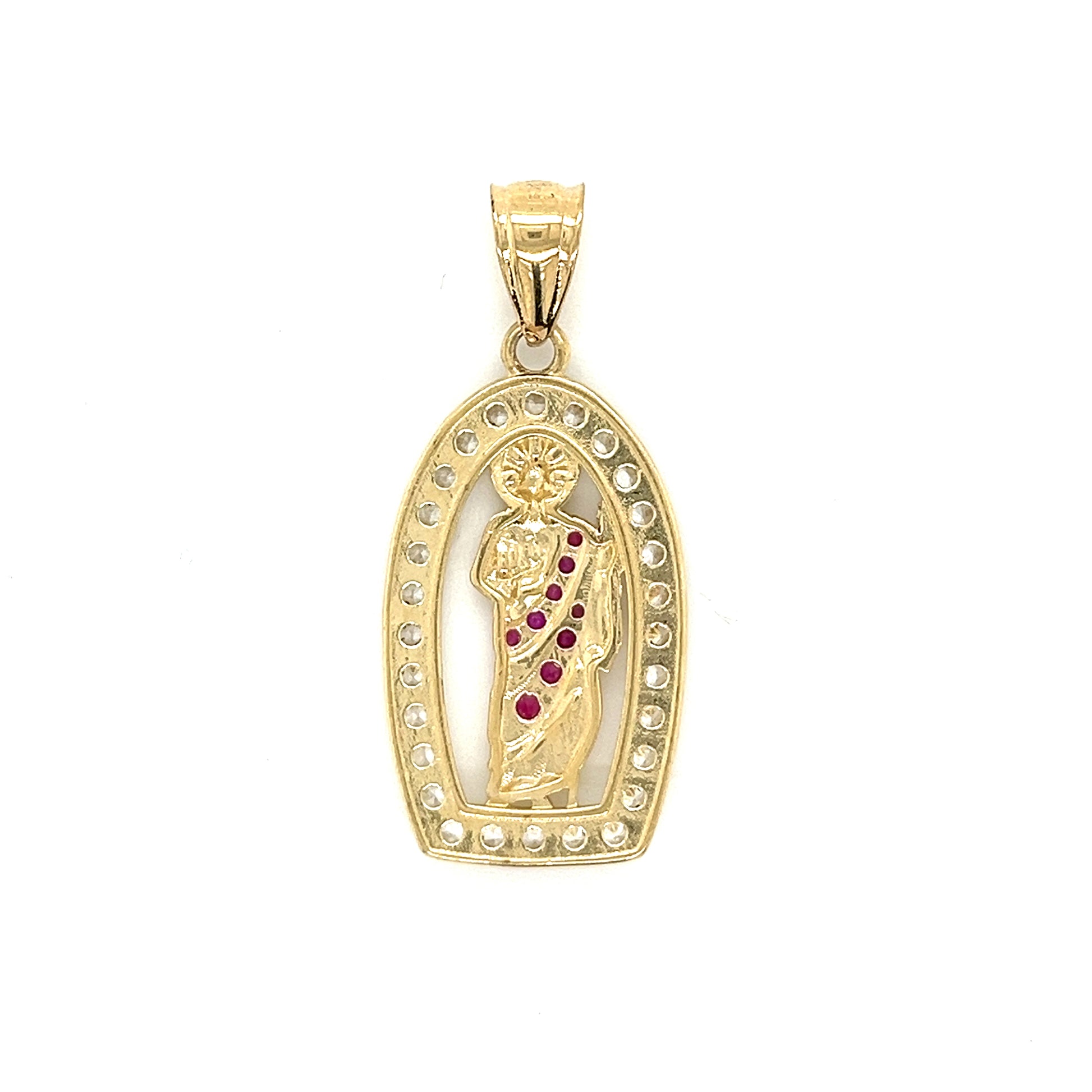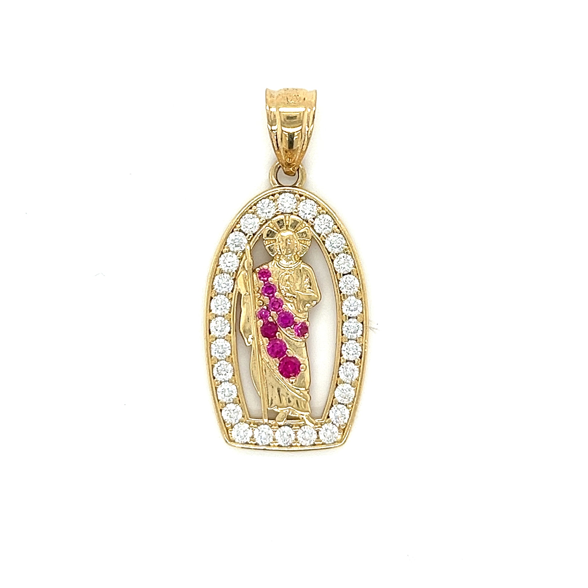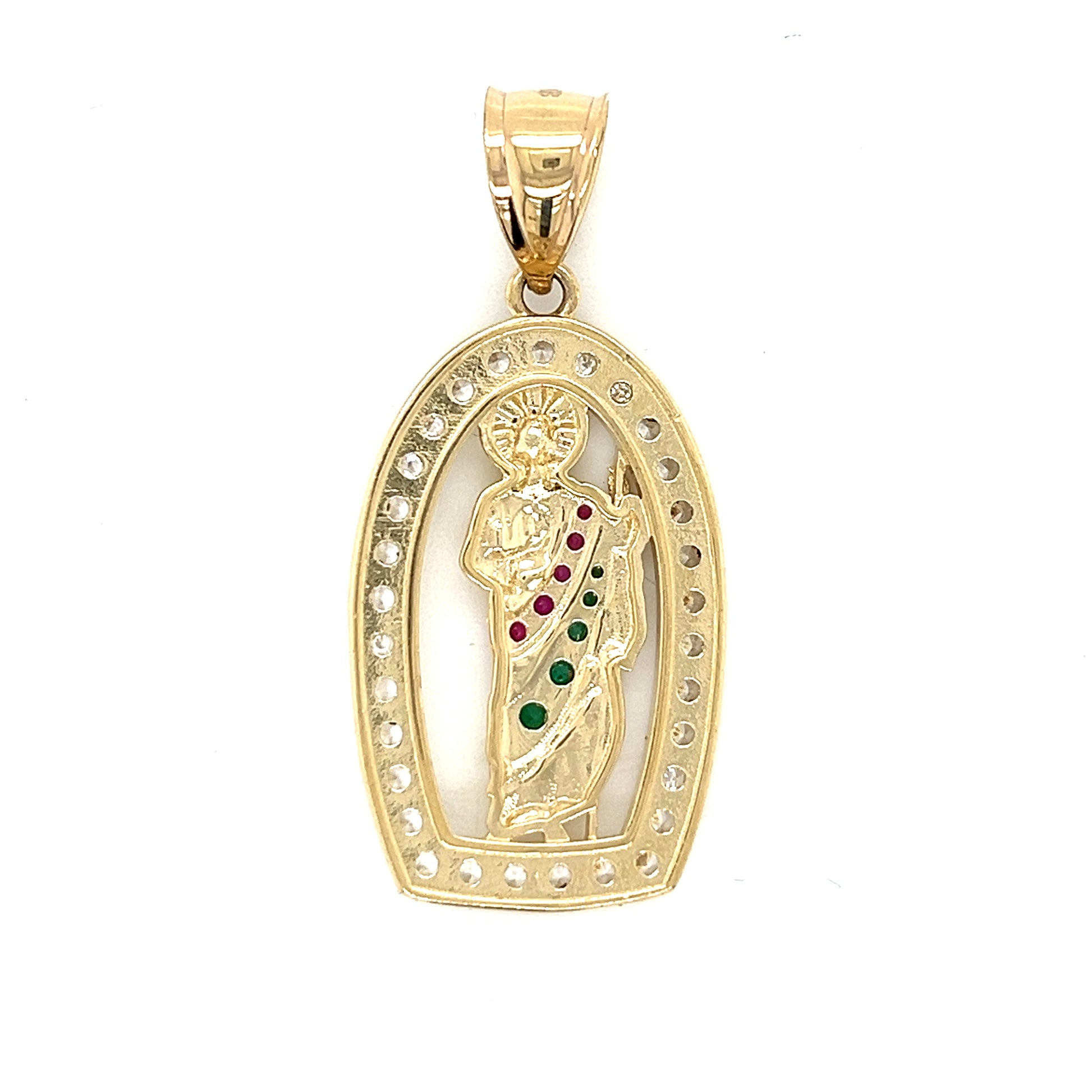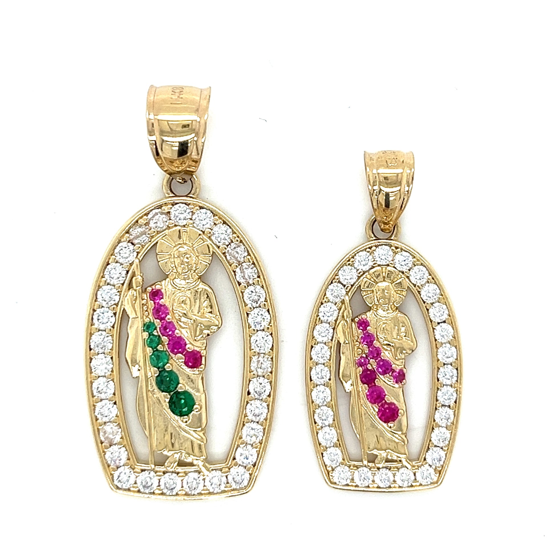 Descubra el cautivador encanto del colorido colgante San Judas de oro de 14 quilates. Mide 1,6" x 0,8" y 1,4" x 0,5" y pesa aprox. 6,5G y 3,5G , este colgante irradia una presencia llamativa y cautivadora, adornado con deslumbrantes circonitas cúbicas redondas de colores.