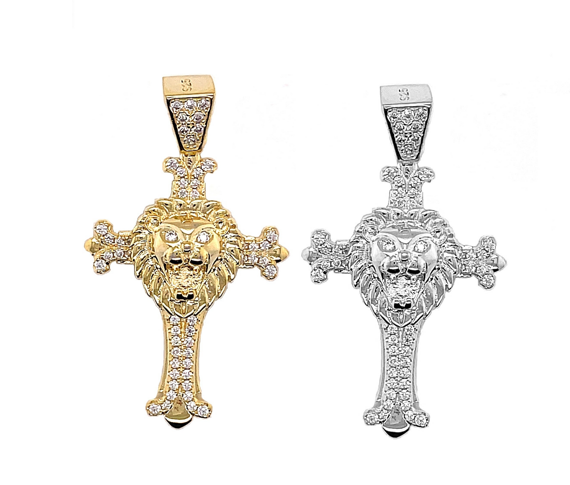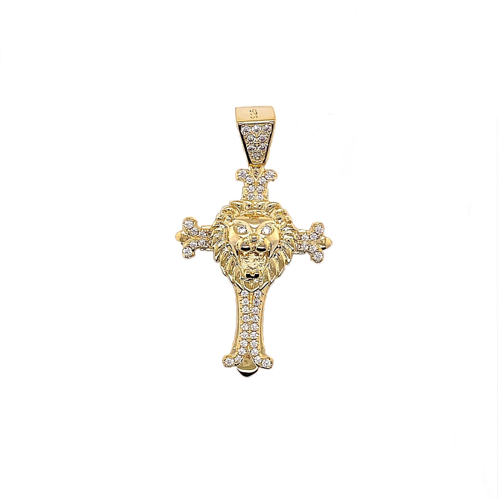 Plata de ley 925 rodiada/ chapada en oro de 14 quilates con forma de cruz de león y piedras redondas de circonita cúbica.