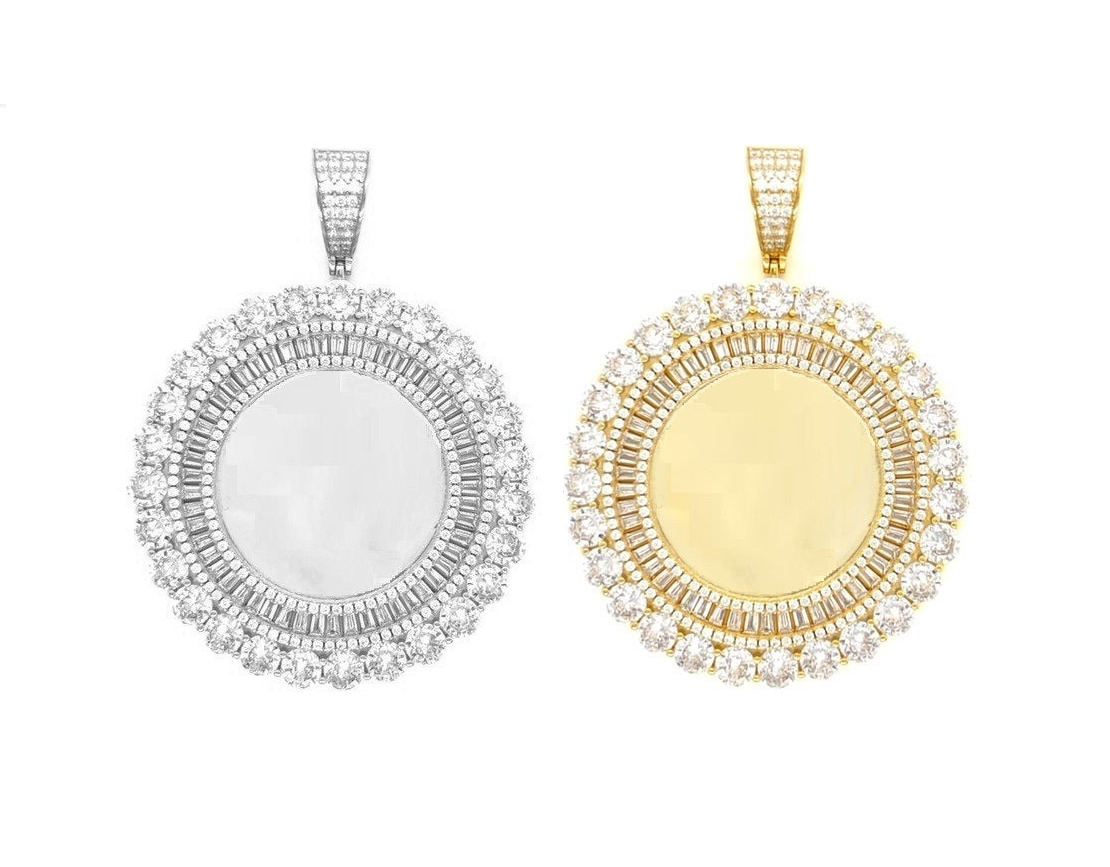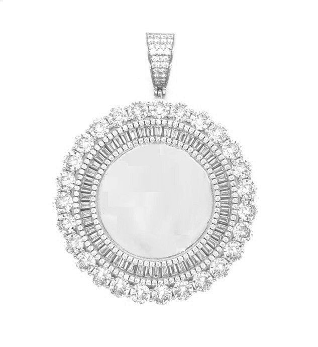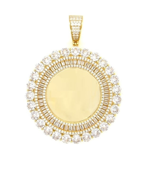 Dije de imagen redonda chapado en oro de 14 quilates y rodio de plata de ley 925 con piedras redondas y rectangulares de circonita cúbica.