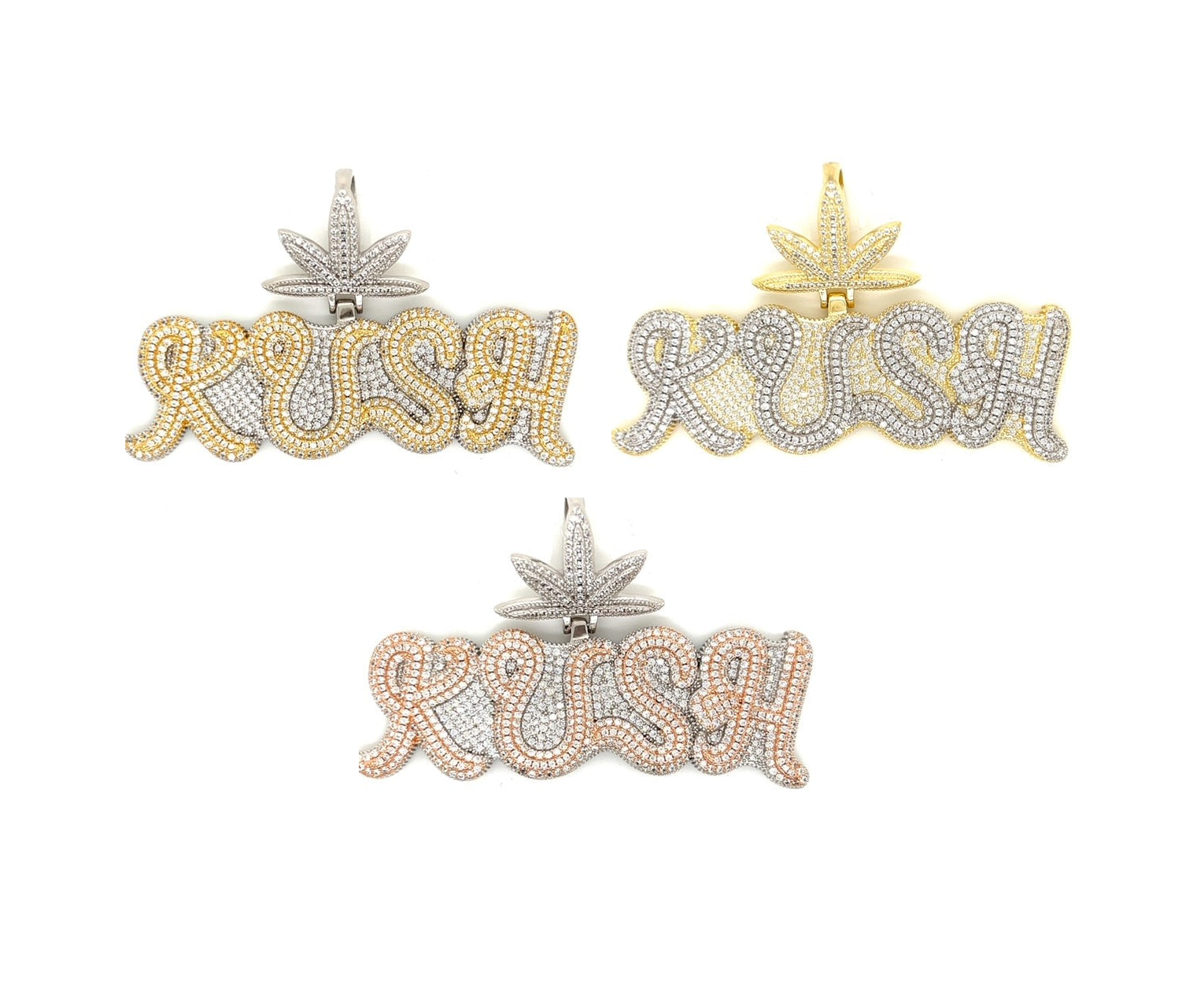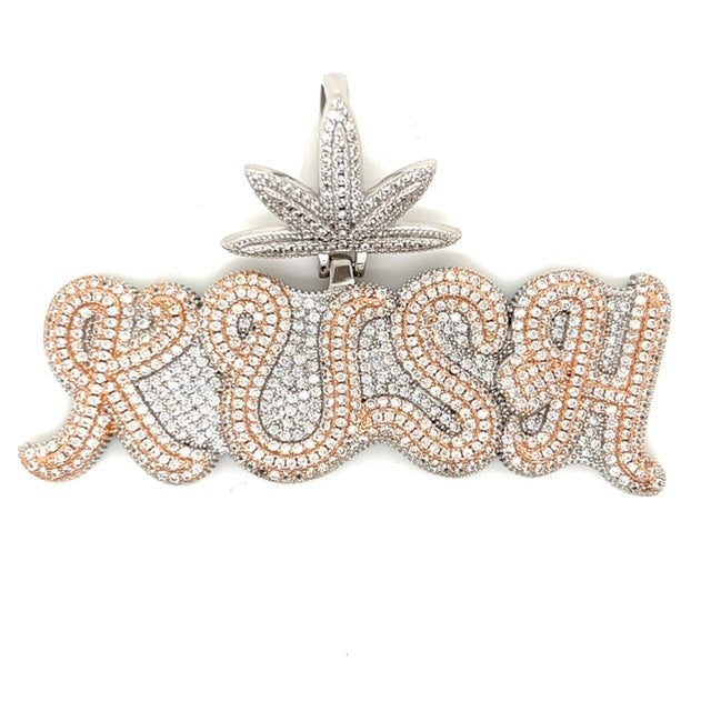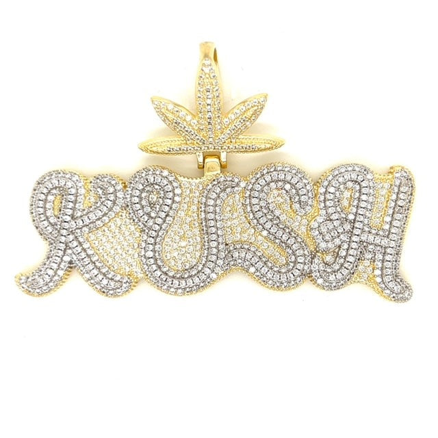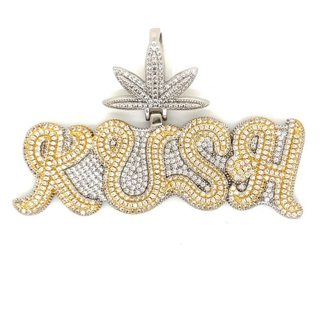 Colgante "KUSH" de plata de ley 925 con baño de rodio y amarillo de 14 quilates en dos tonos con piedras redondas de circonita cúbica. Dejar fianza en forma.