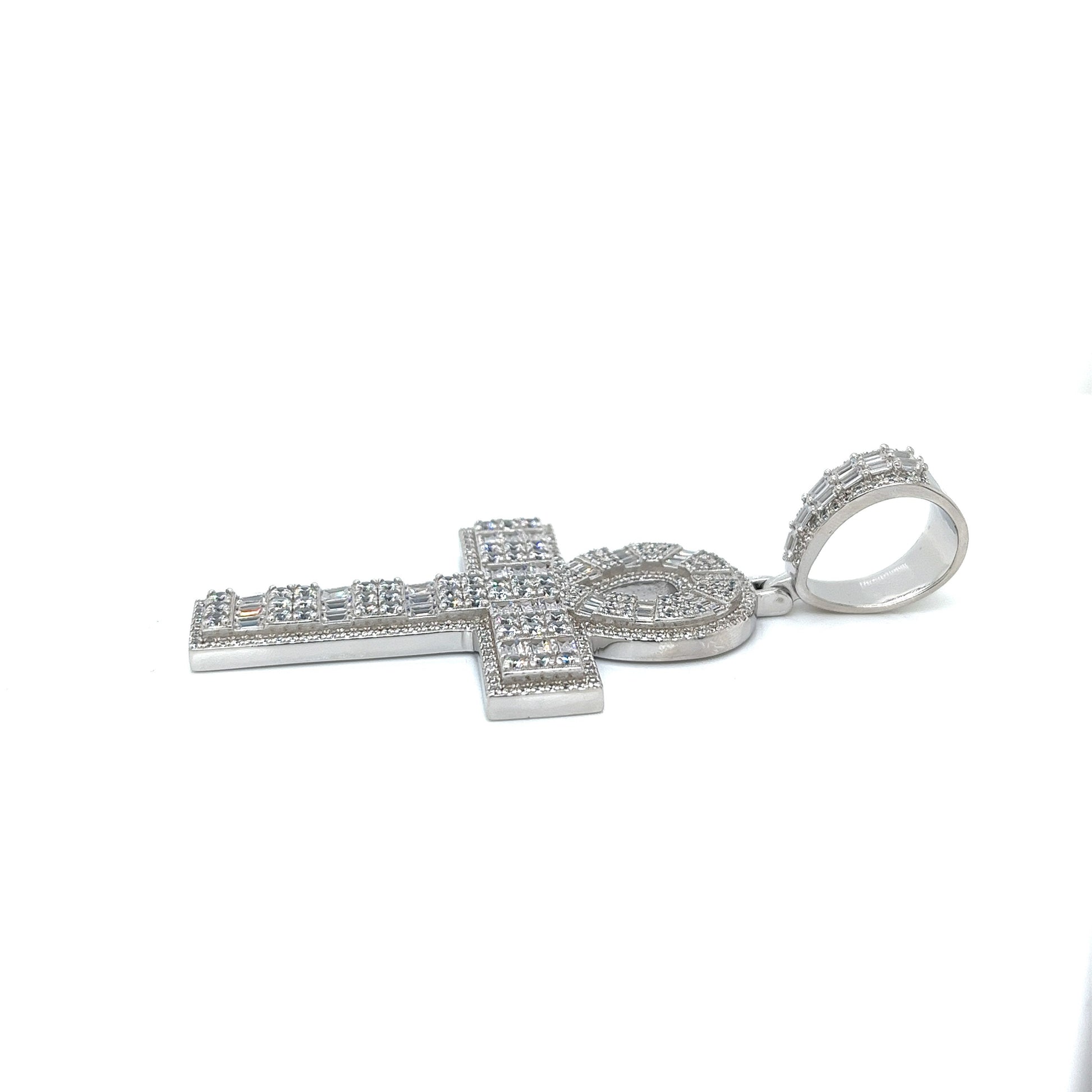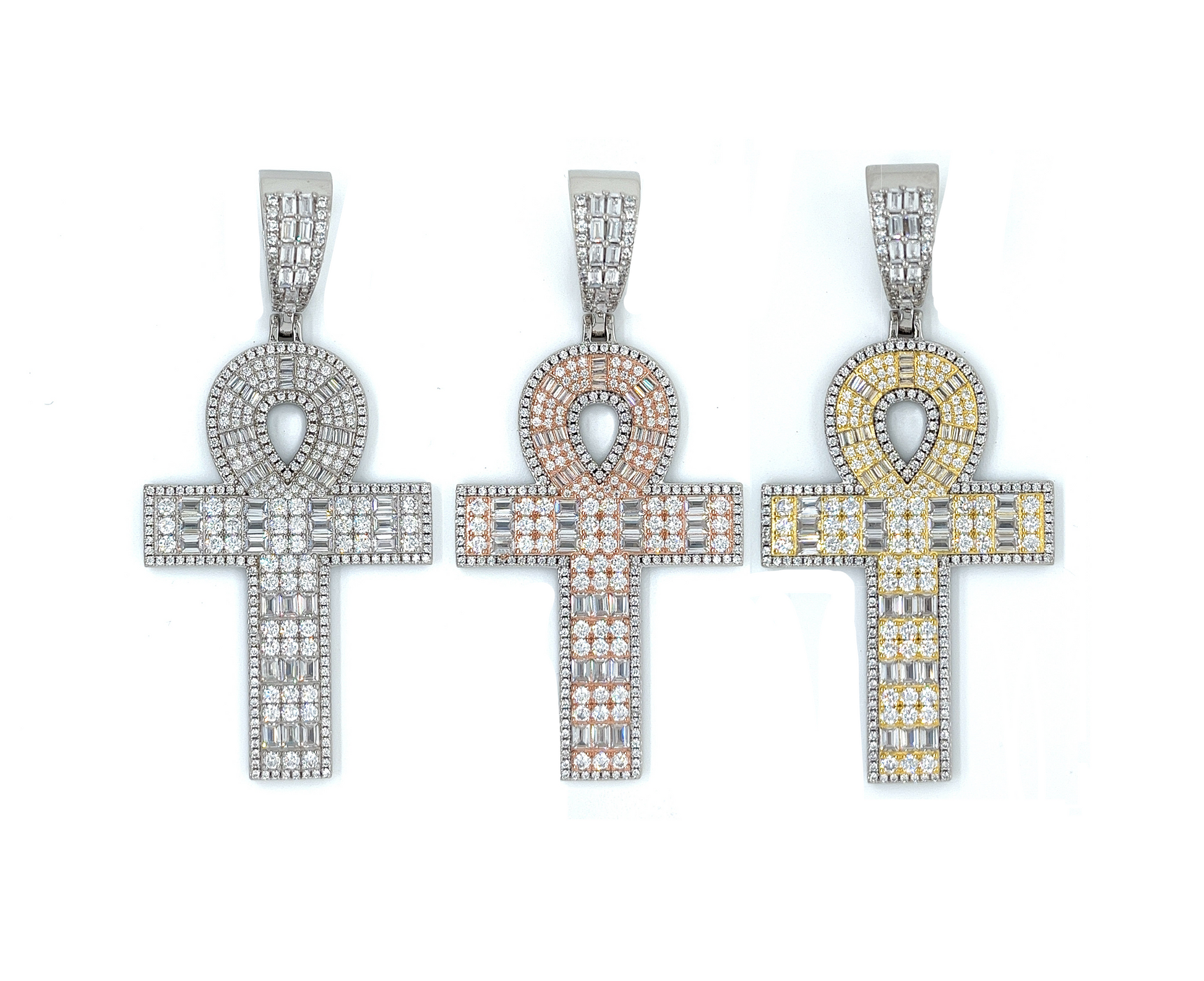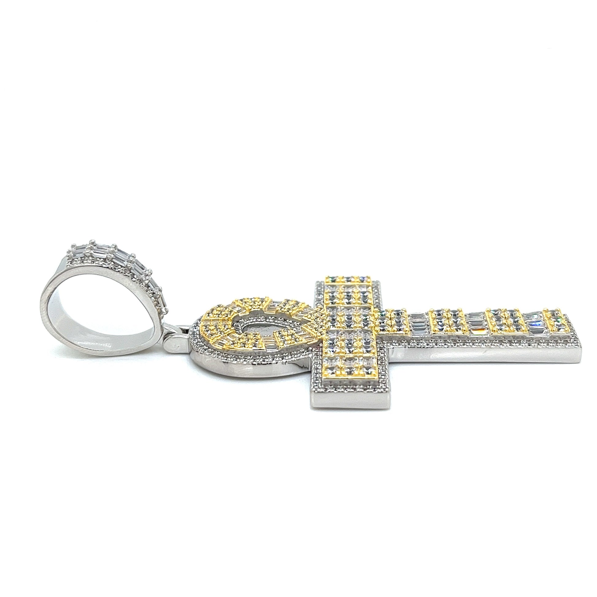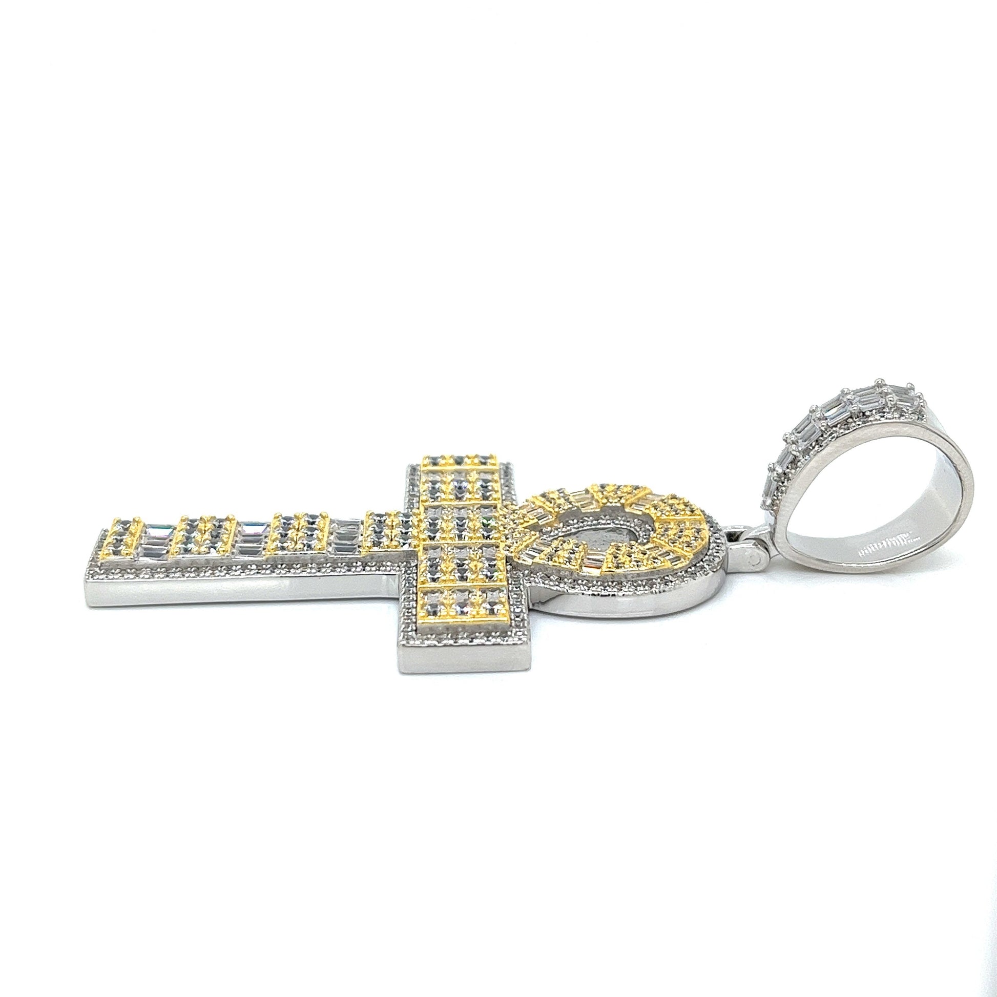 Dije de CRUZ chapado en oro de 14 quilates y rodio de plata de ley 925 con piedras redondas de baguette y circonita cúbica.