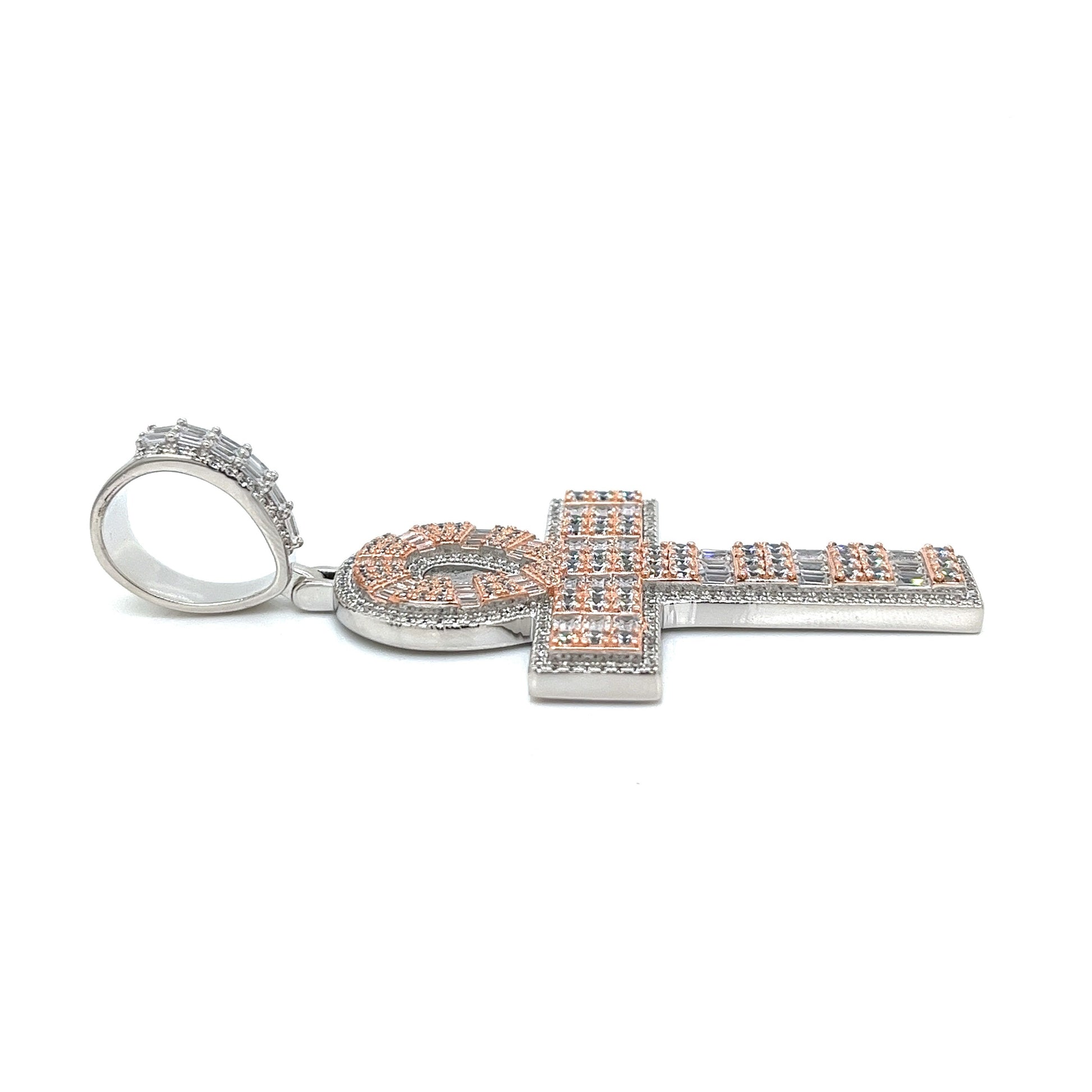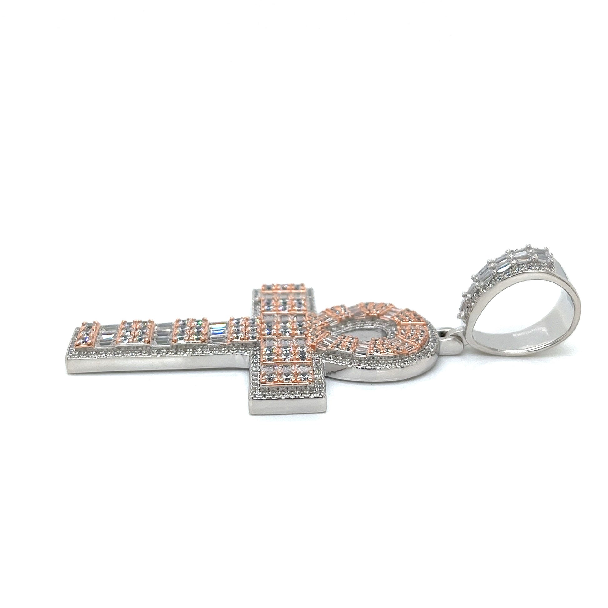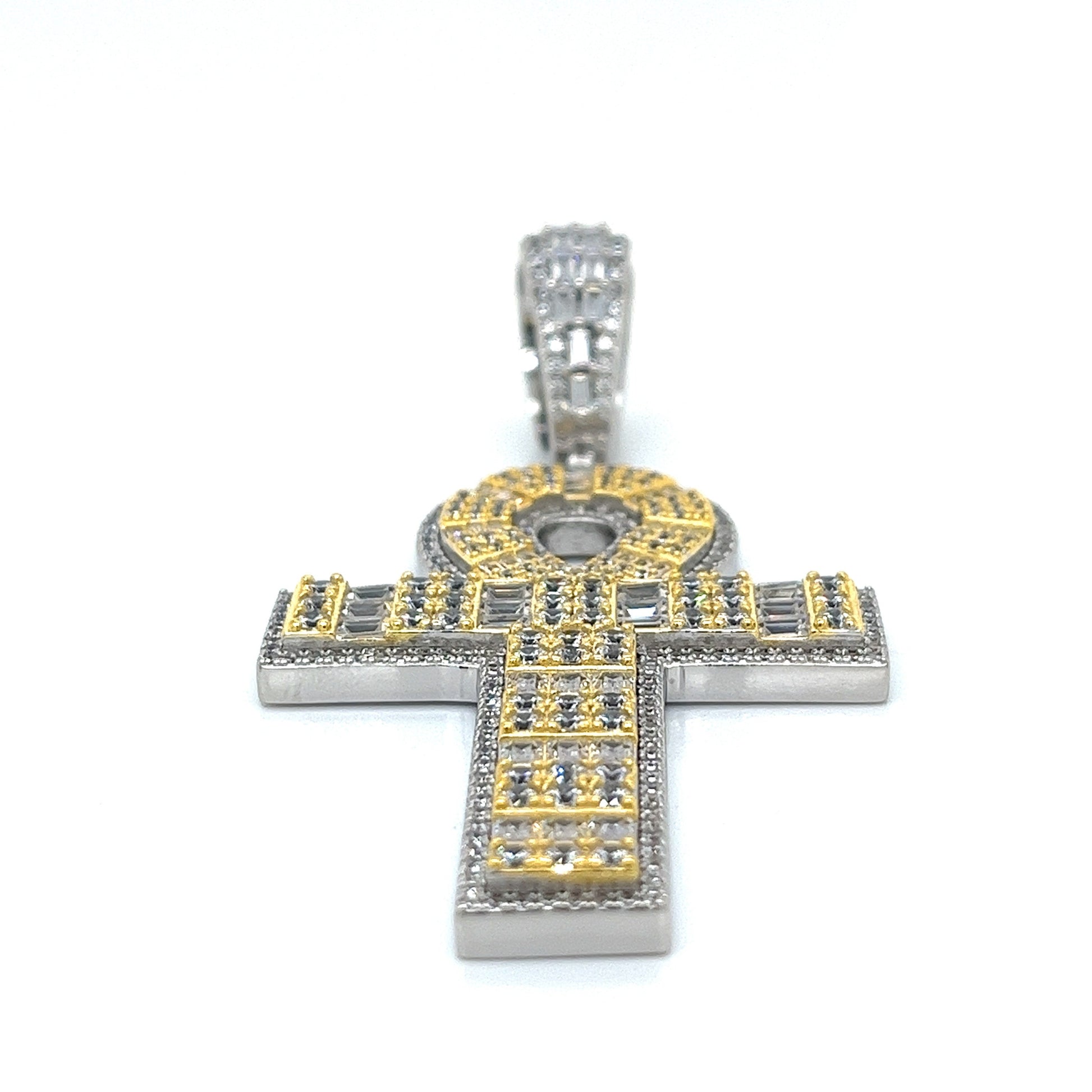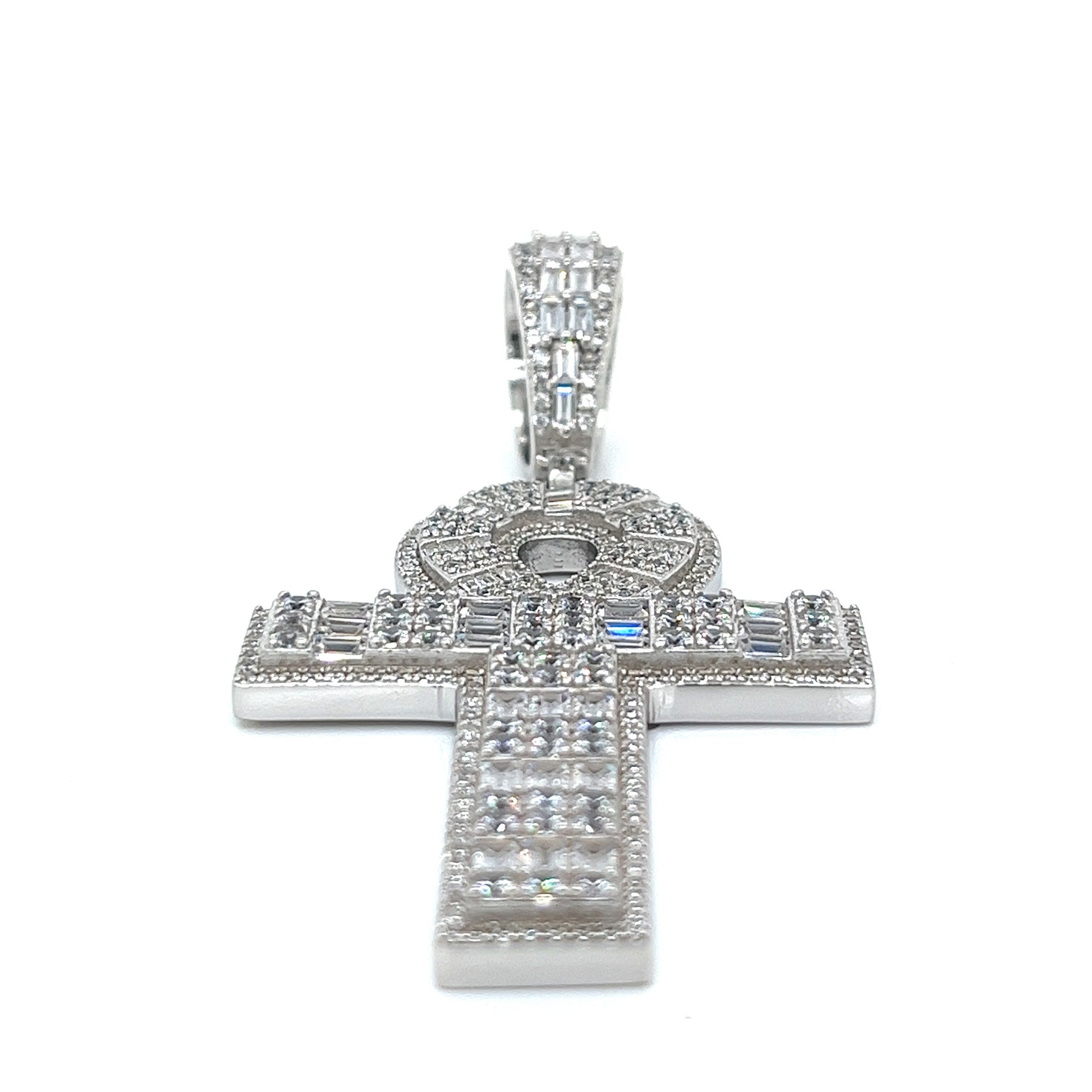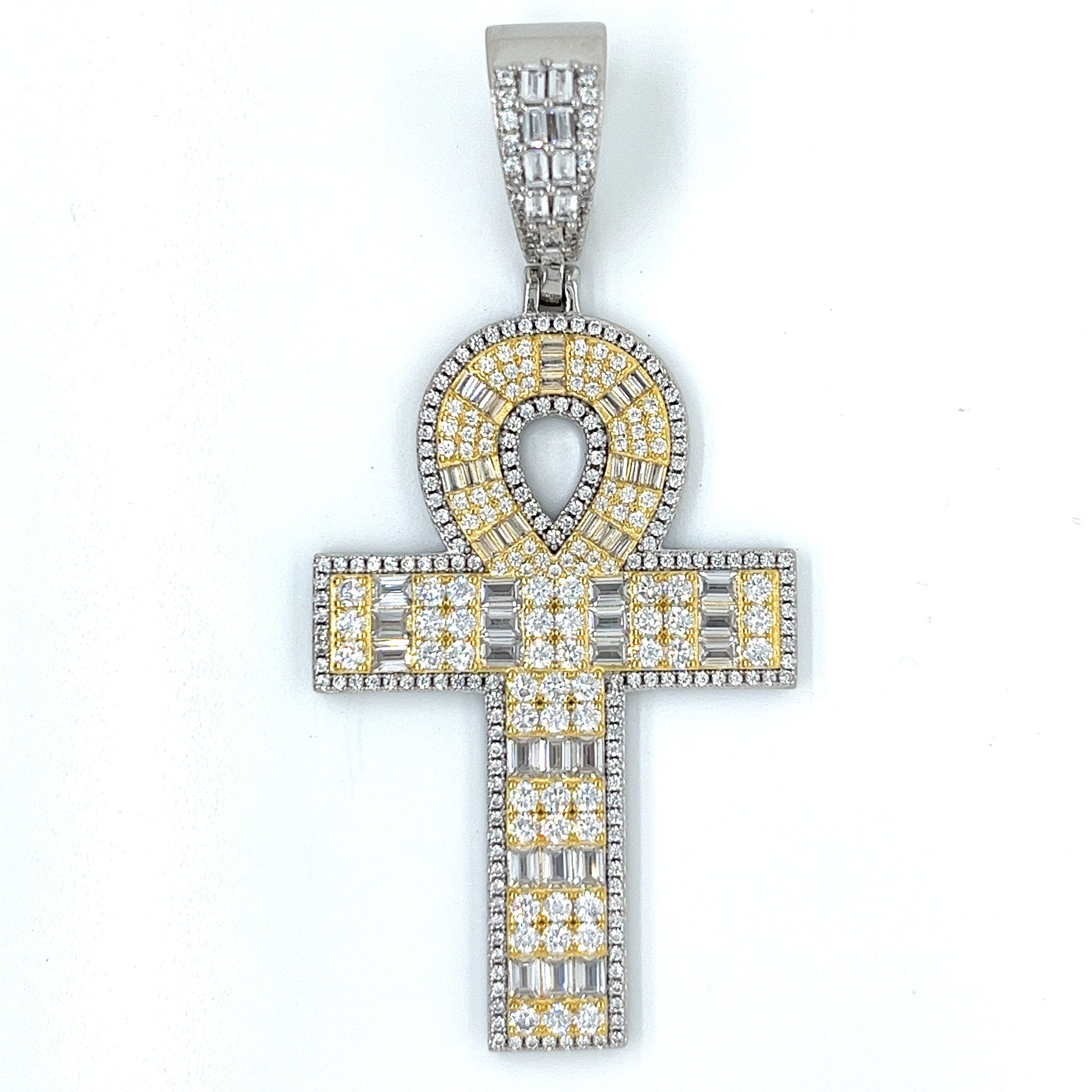 Dije de CRUZ chapado en oro de 14 quilates y rodio de plata de ley 925 con piedras redondas de baguette y circonita cúbica.