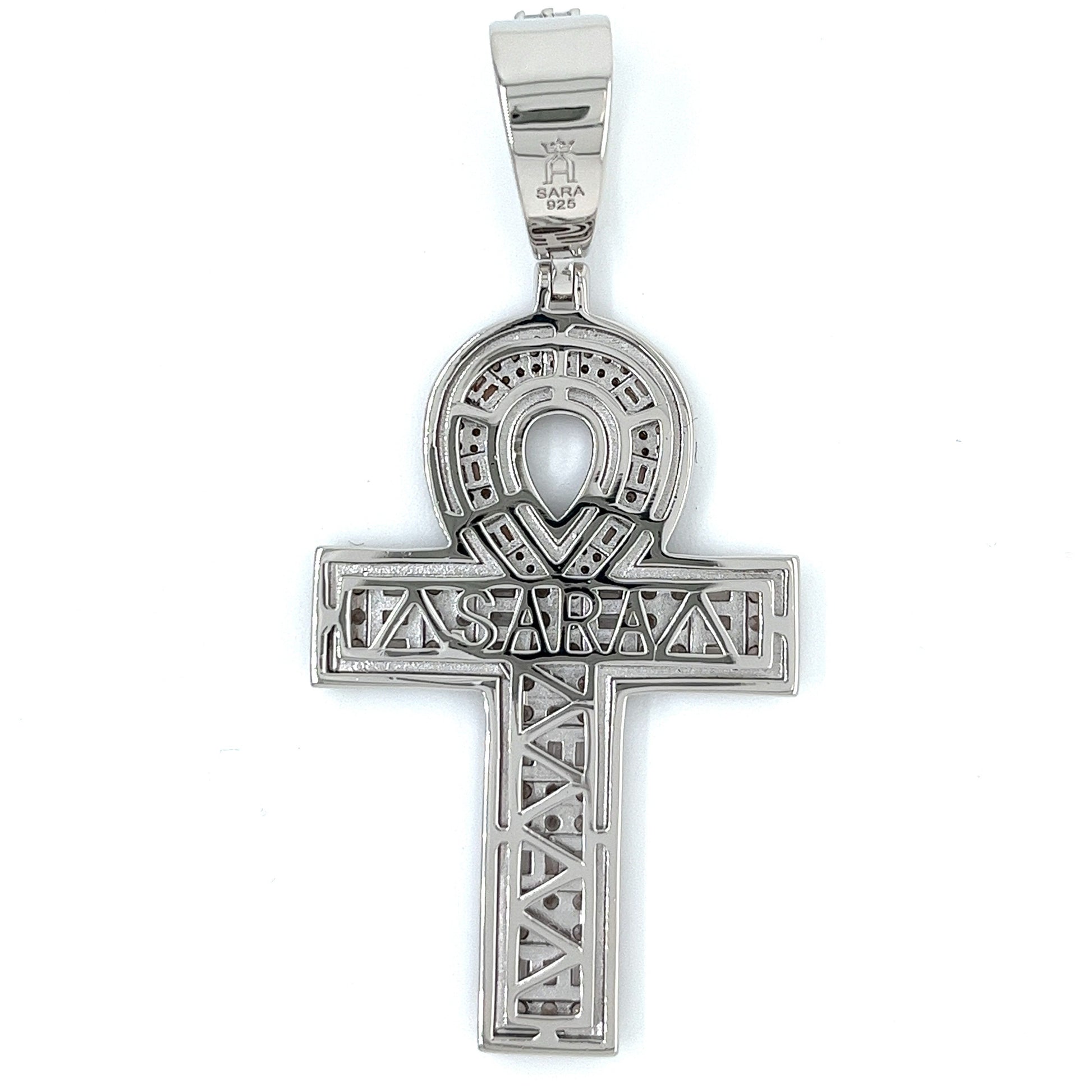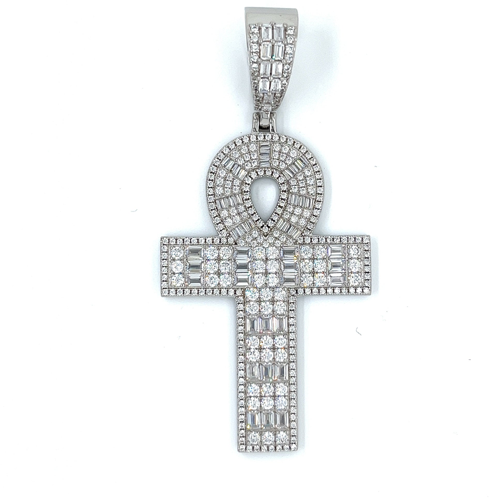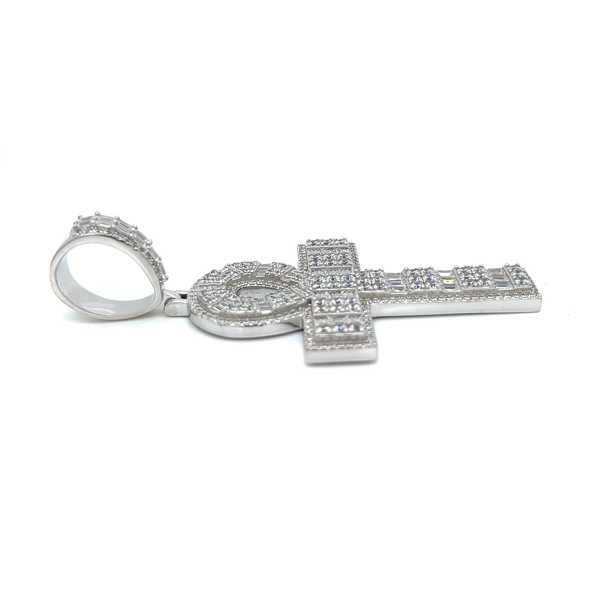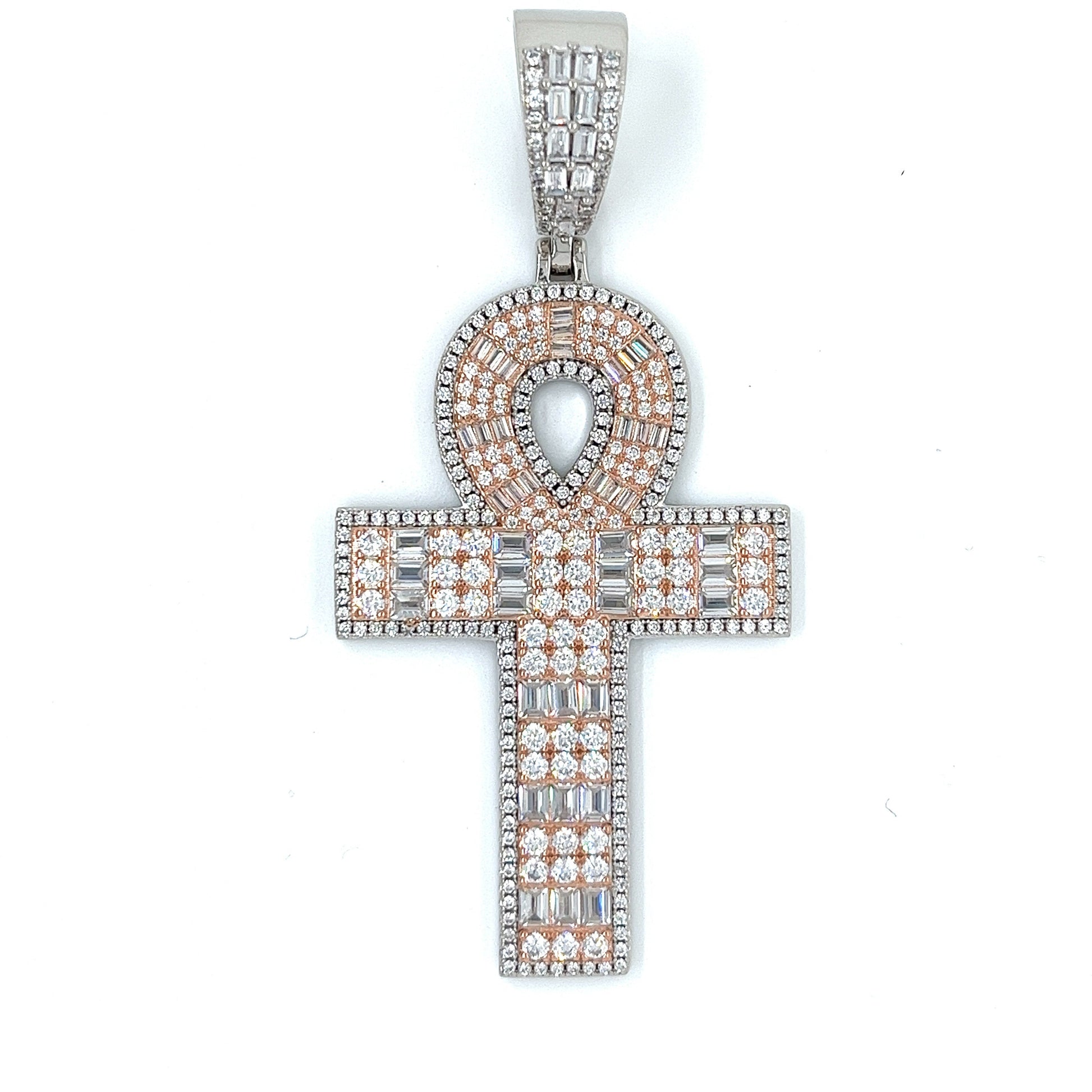 Dije de CRUZ chapado en oro de 14 quilates y rodio de plata de ley 925 con piedras redondas de baguette y circonita cúbica.