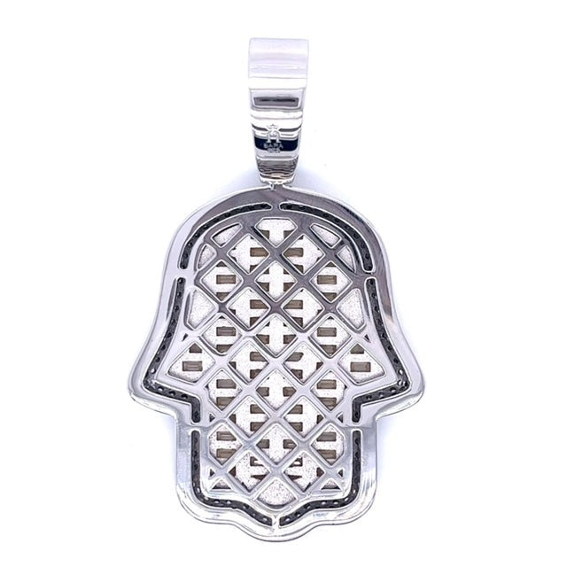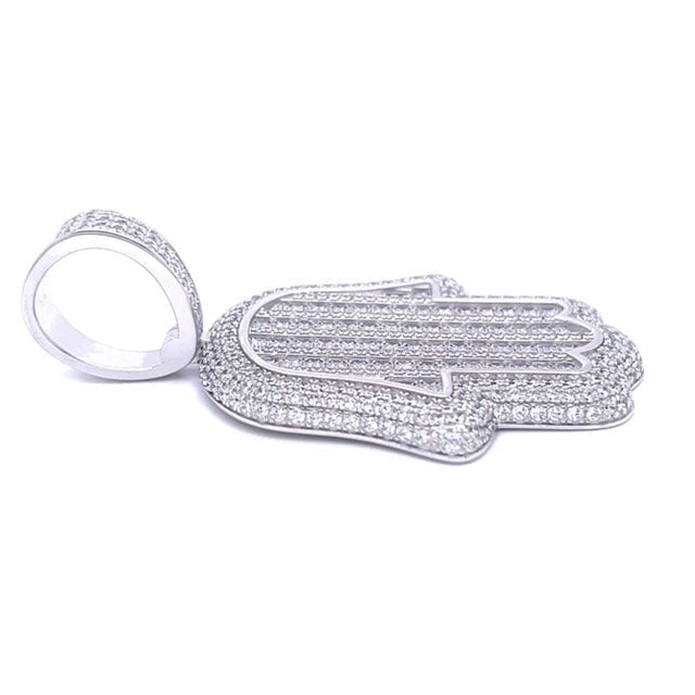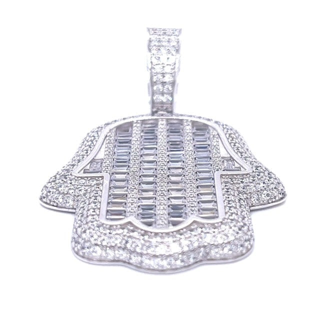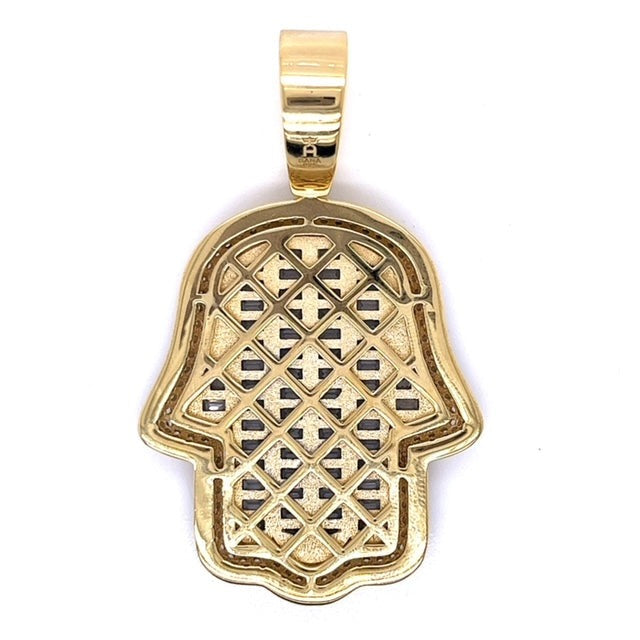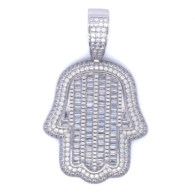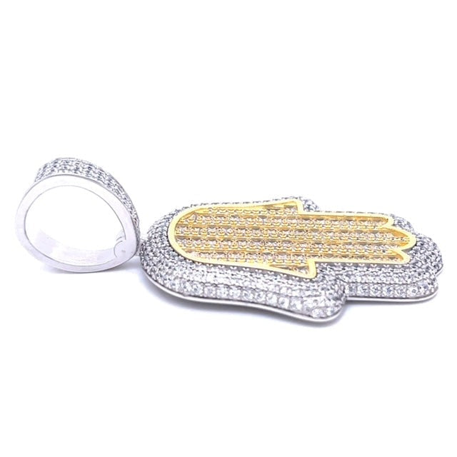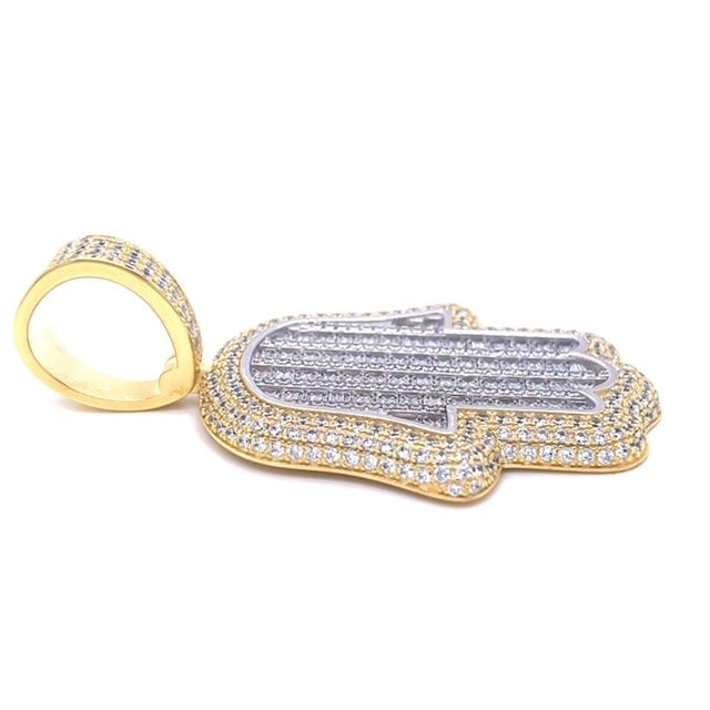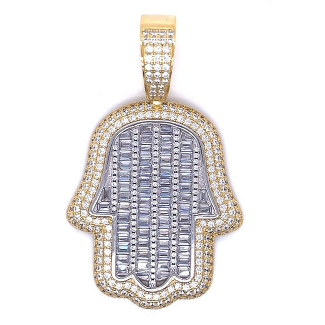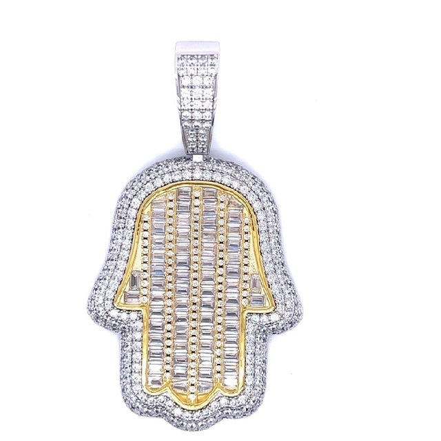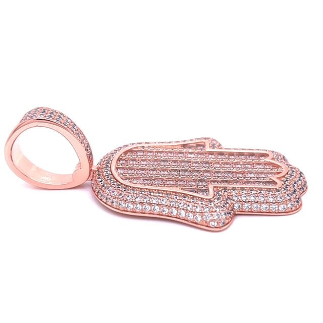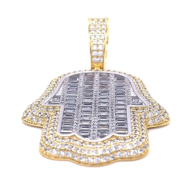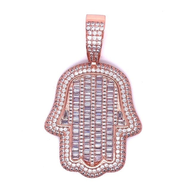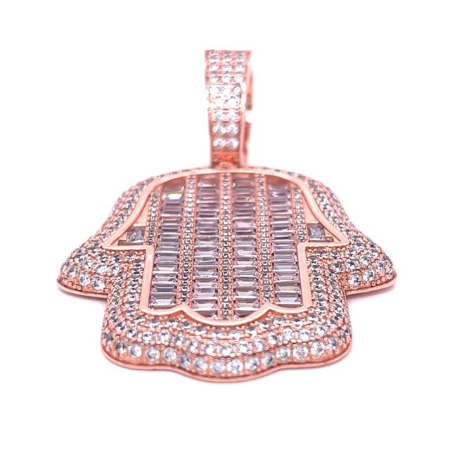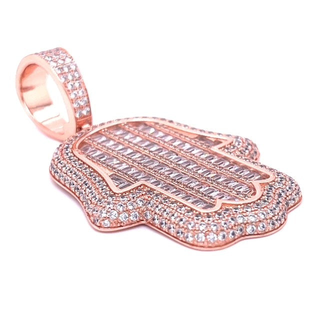 Mano de Hamsa chapada en oro amarillo y rosa de 14 quilates en plata de ley 925 rodiada con piedras de circonita baguette centradas y borde de piedras de circonita redondas.