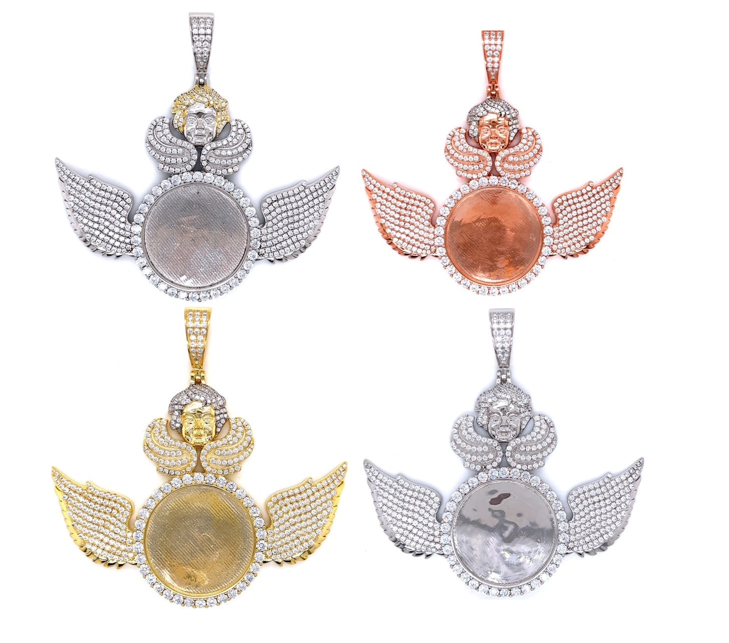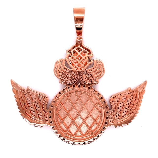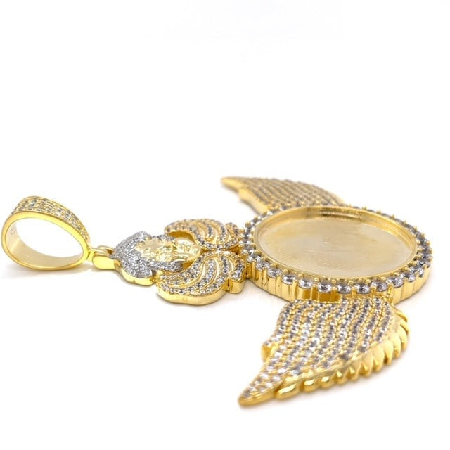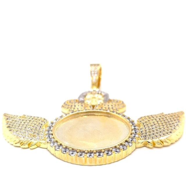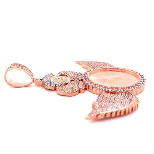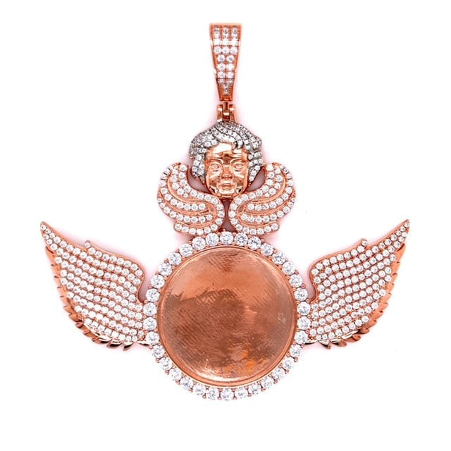 Colgante con imagen de alas y cara de ángel chapado en oro amarillo y rosa de 14 quilates en plata de ley 925 rodiada y adornado con piedras de circonita redondas.