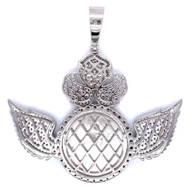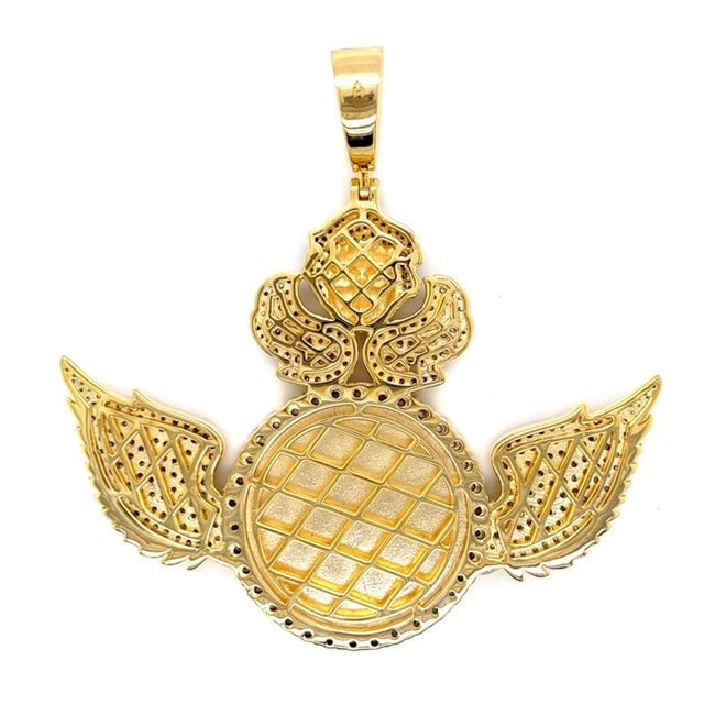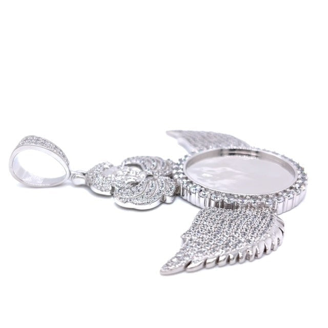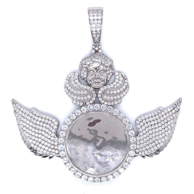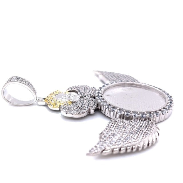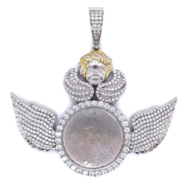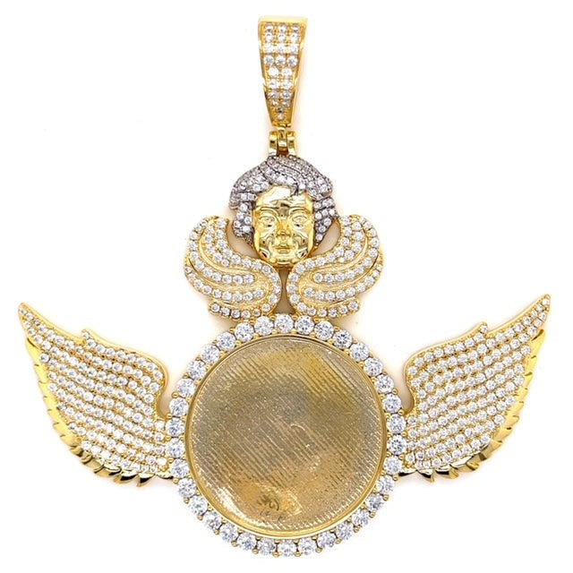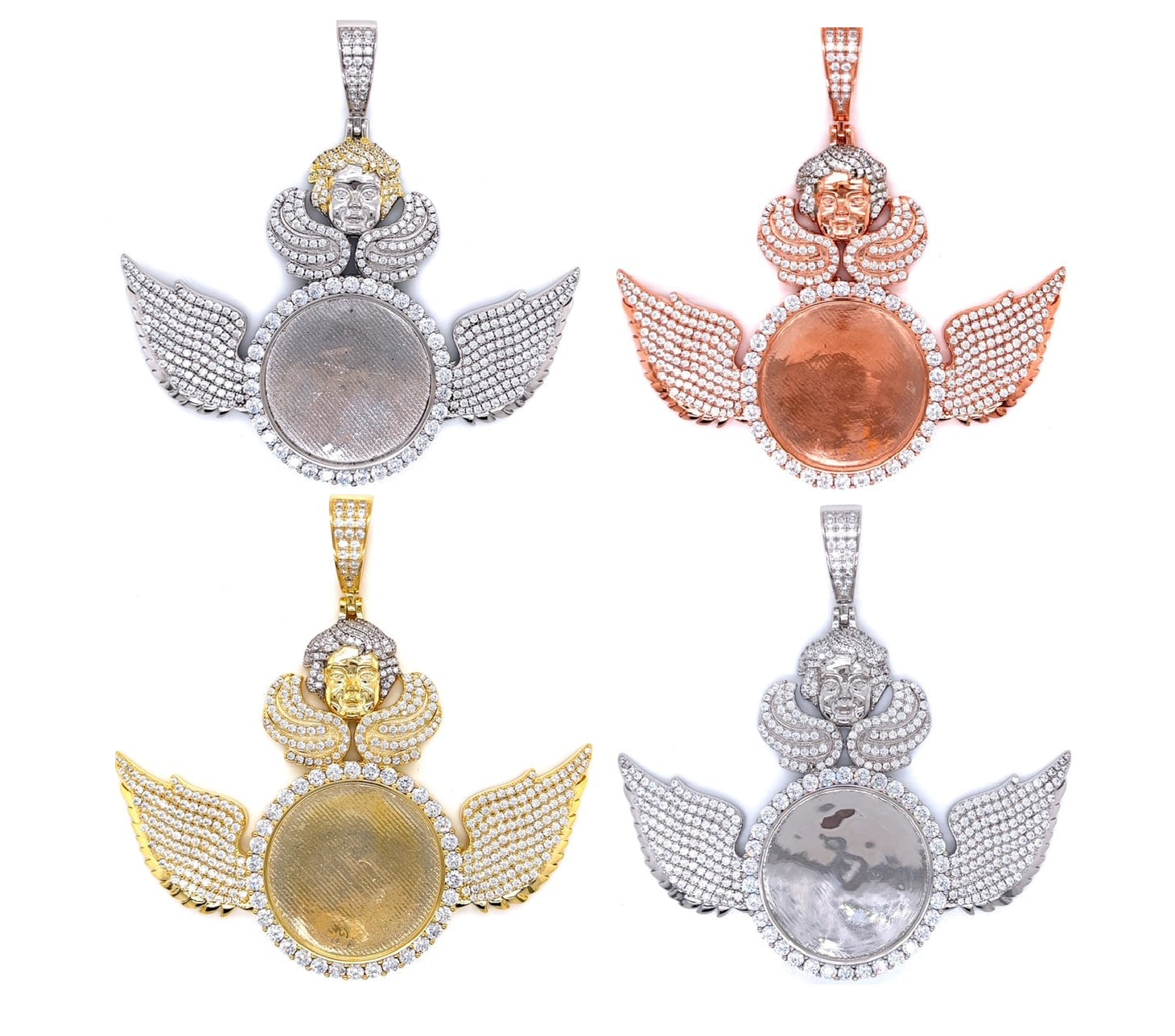 Colgante con imagen de alas y cara de ángel chapado en oro amarillo y rosa de 14 quilates en plata de ley 925 rodiada y adornado con piedras de circonita redondas.