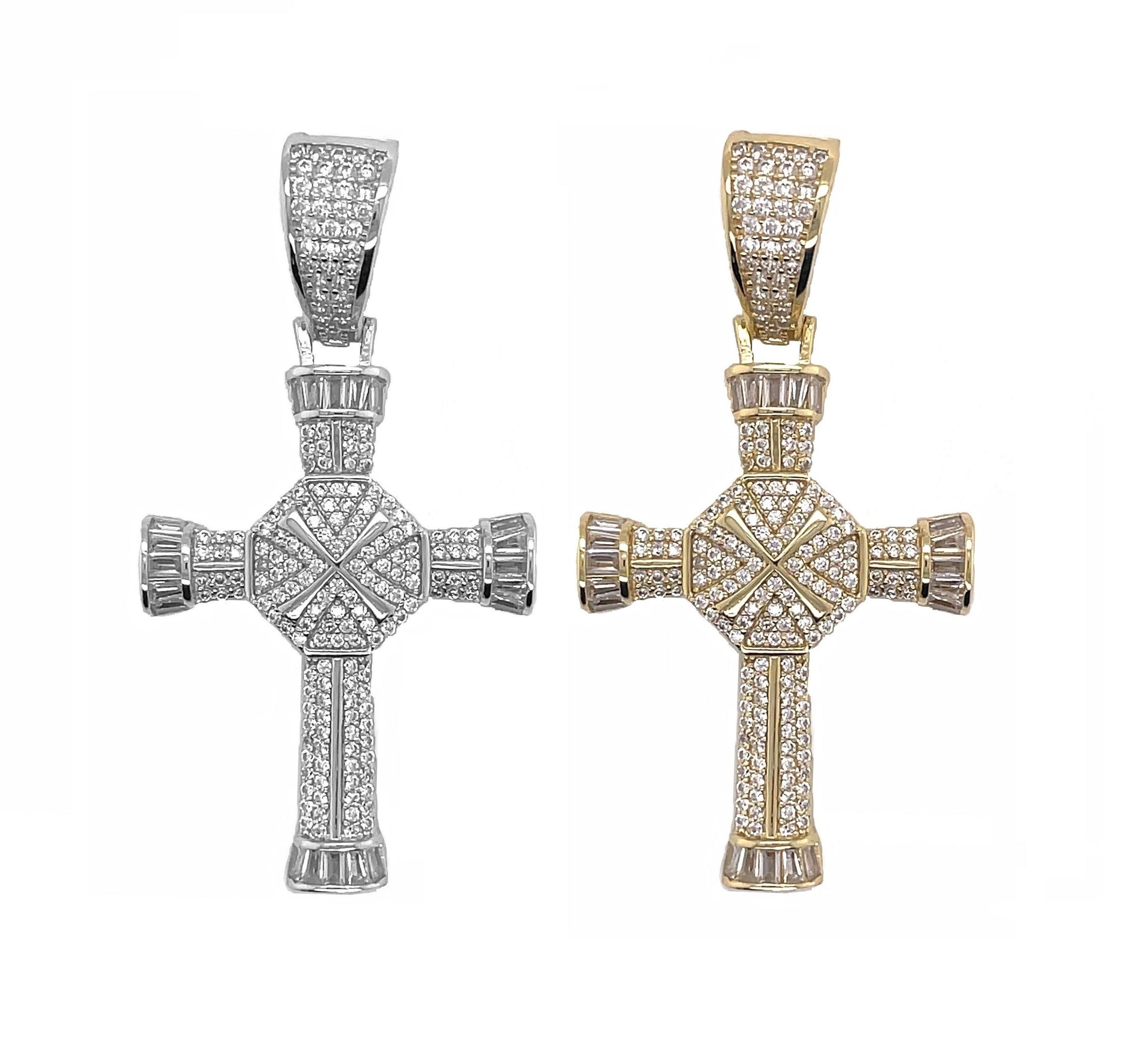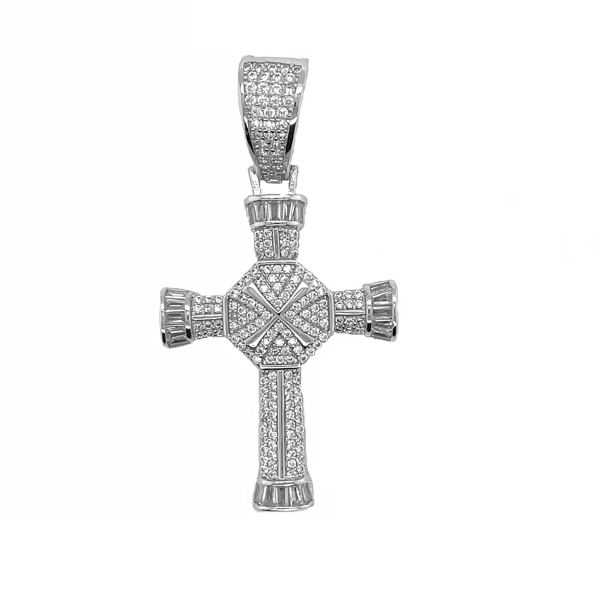 Impresionante colgante de cruz elegante de plata de ley 925: eleva tu estilo con esta belleza atemporal que mide 2” * 1”. Con deslumbrantes piedras de circonita cúbica redonda y baguette. Con Alta Calidad, añade un toque de glamour a cualquier look.