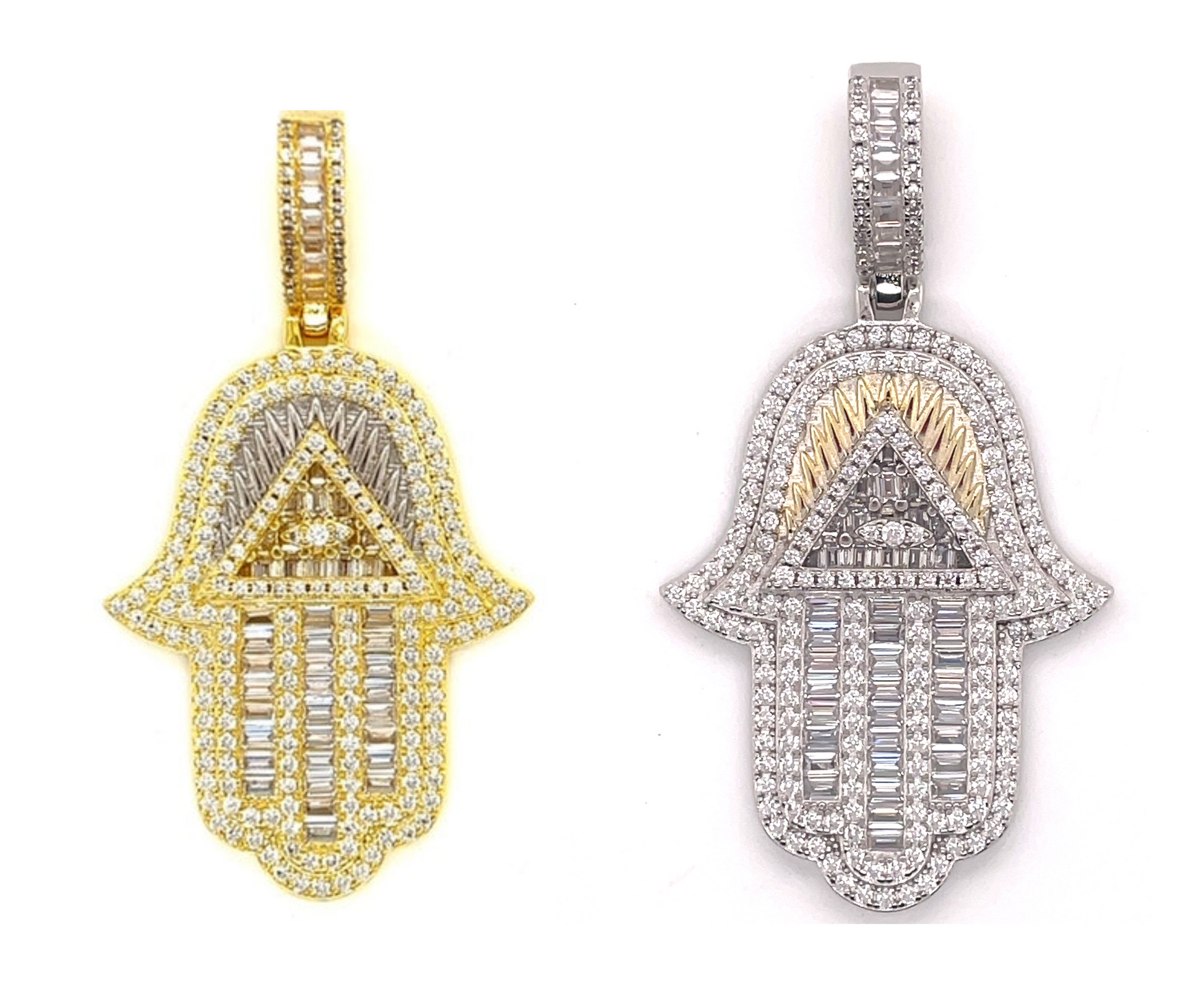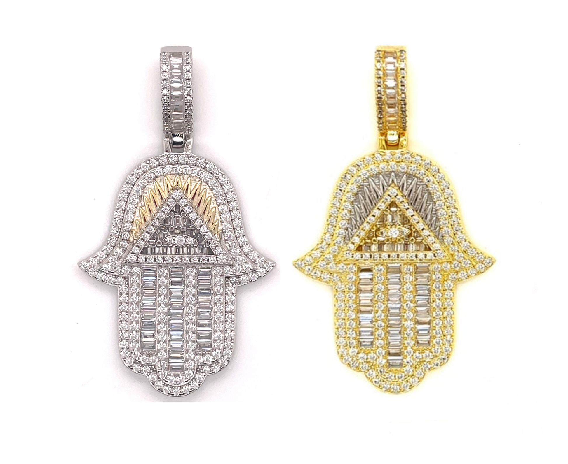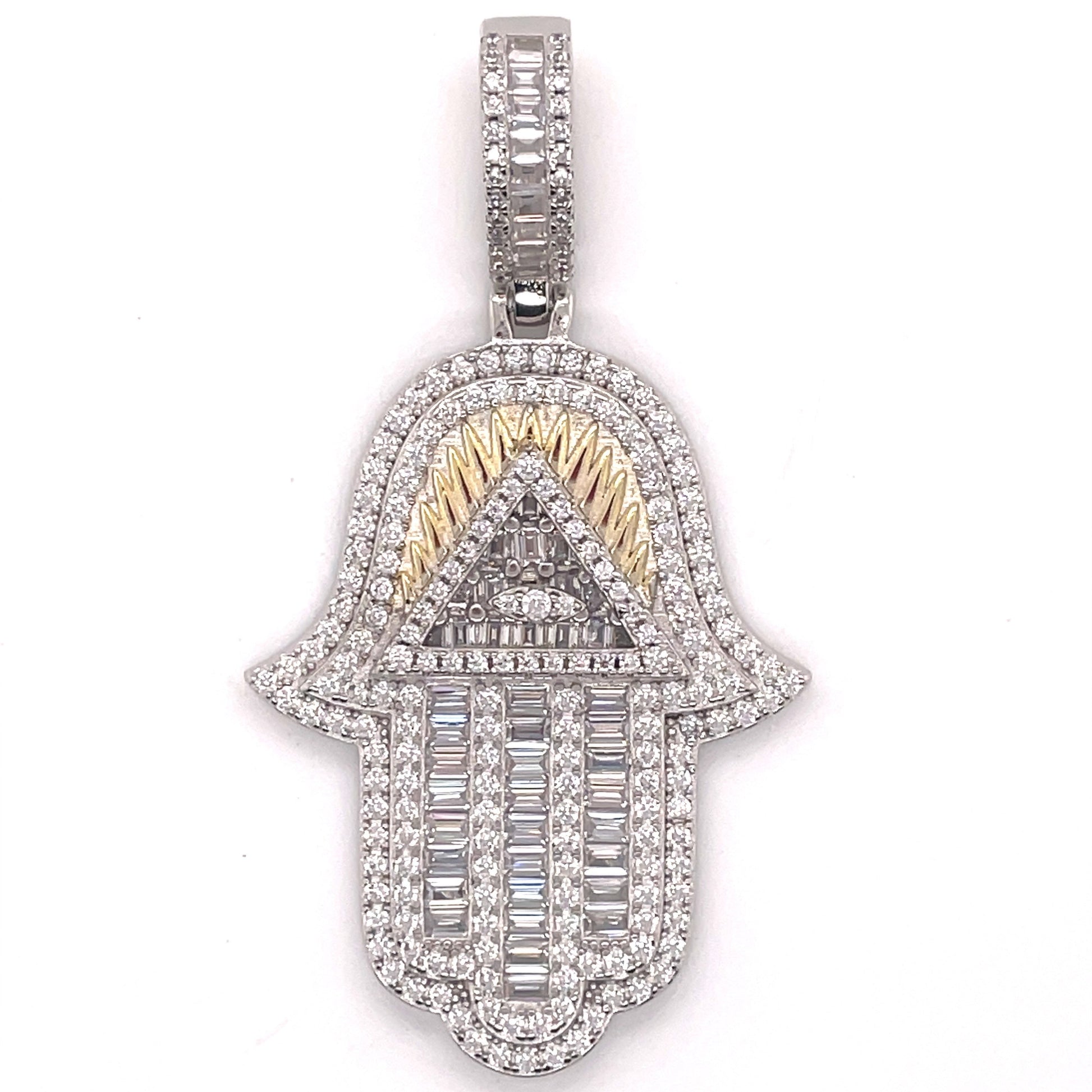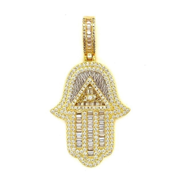Abalorio de plata de ley 925 con rodio y chapado en oro de 14 quilates con circonita cúbica y mano de Hamsa.