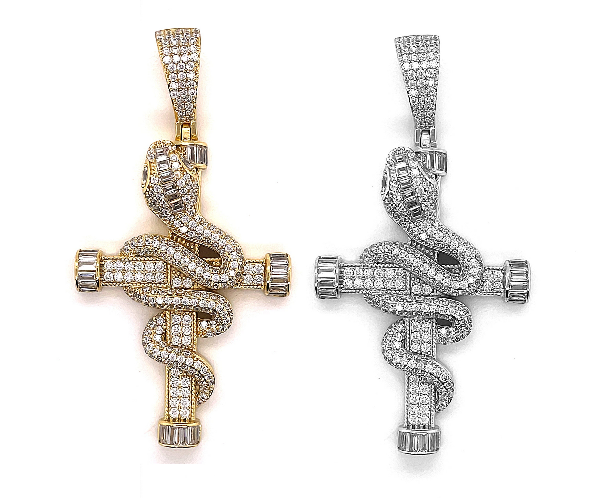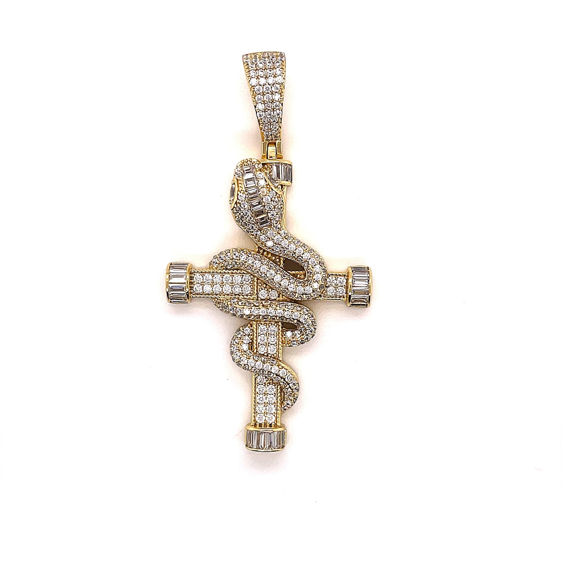 Dije de cruz con serpiente en plata de ley 925 rodiada y chapada en oro de 14 quilates con piedras redondas de circonita cúbica.