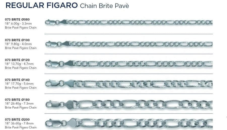 Este producto presenta cadenas de plata de ley 925 con un diseño Figaro Brit Pave regular.