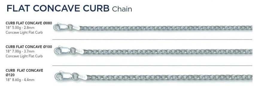 Cadenas planas cóncavas de plata de ley 925 elaboradas por expertos para el individuo moderno. El diseño plano y cóncavo crea una textura única que realza cualquier conjunto. Con su composición duradera pero versátil, nuestras cadenas son perfectas para cualquier ocasión y adecuadas tanto para hombres como para mujeres.