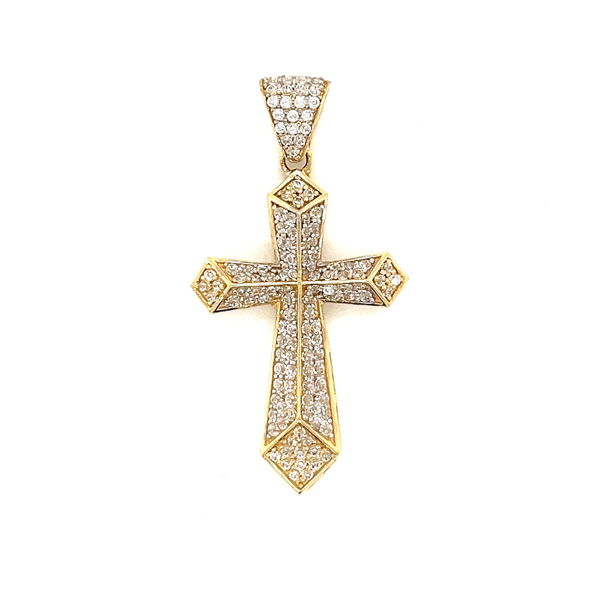 Descubra el encanto sofisticado de este colgante de cruz estilo gótico de oro de 14 quilates. Con un peso de aproximadamente 3,5 gramos y unas dimensiones de 1,8" x 1" - pulgada, este colgante resalta piedras de circonita cúbica redondas, añadiendo un toque pulido.