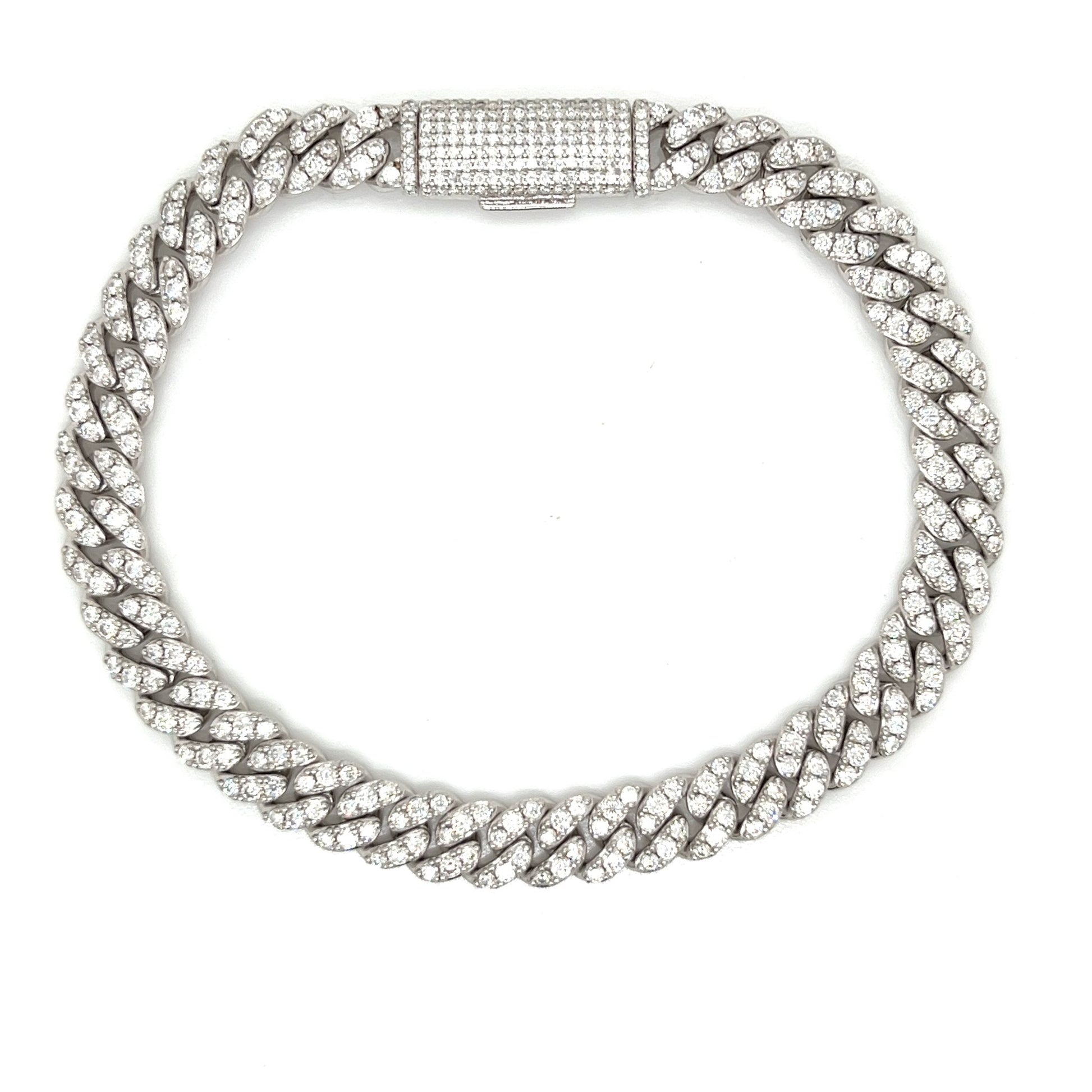 Impresionante pulsera cubana Sara Lock de plata de ley con rodio de 8 mm: eleva tu estilo con esta belleza atemporal. Con deslumbrantes piedras MOISSANITA redondas de 5,85 quilates, esta pulsera de 8,5" añade un toque de glamour a cualquier look.