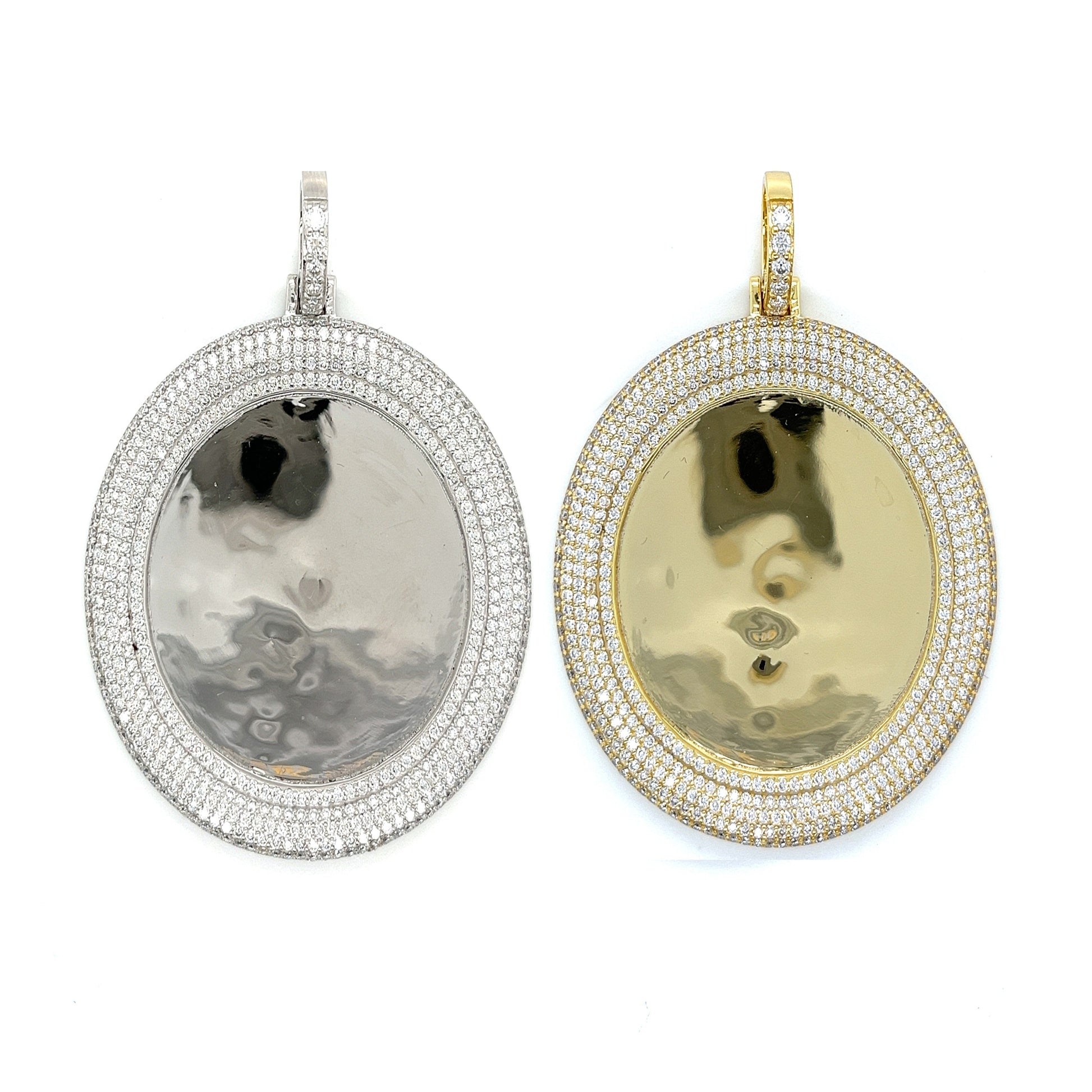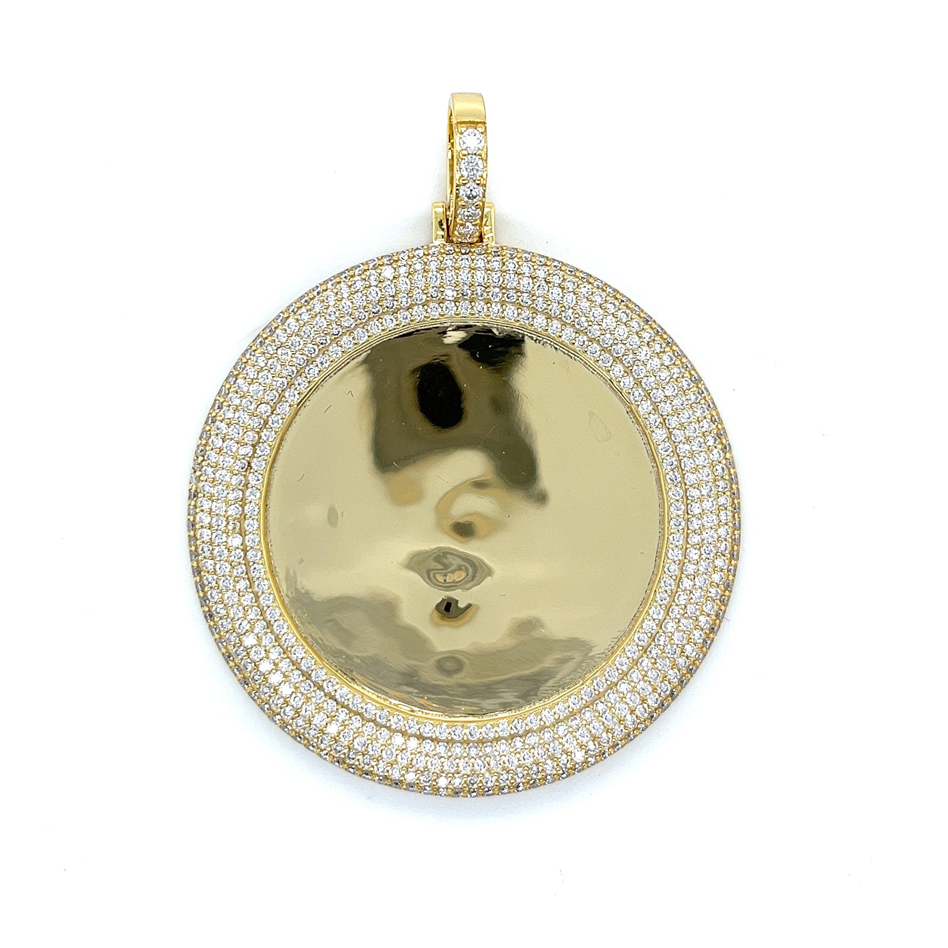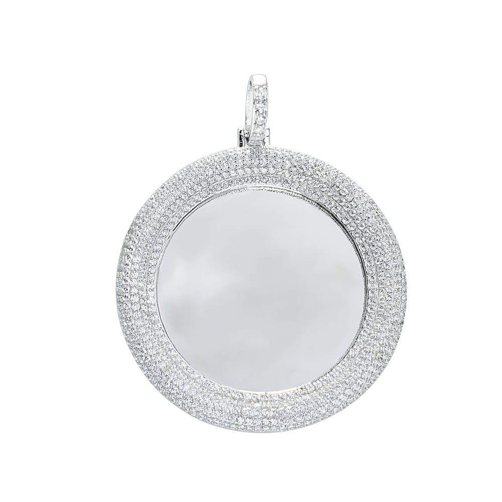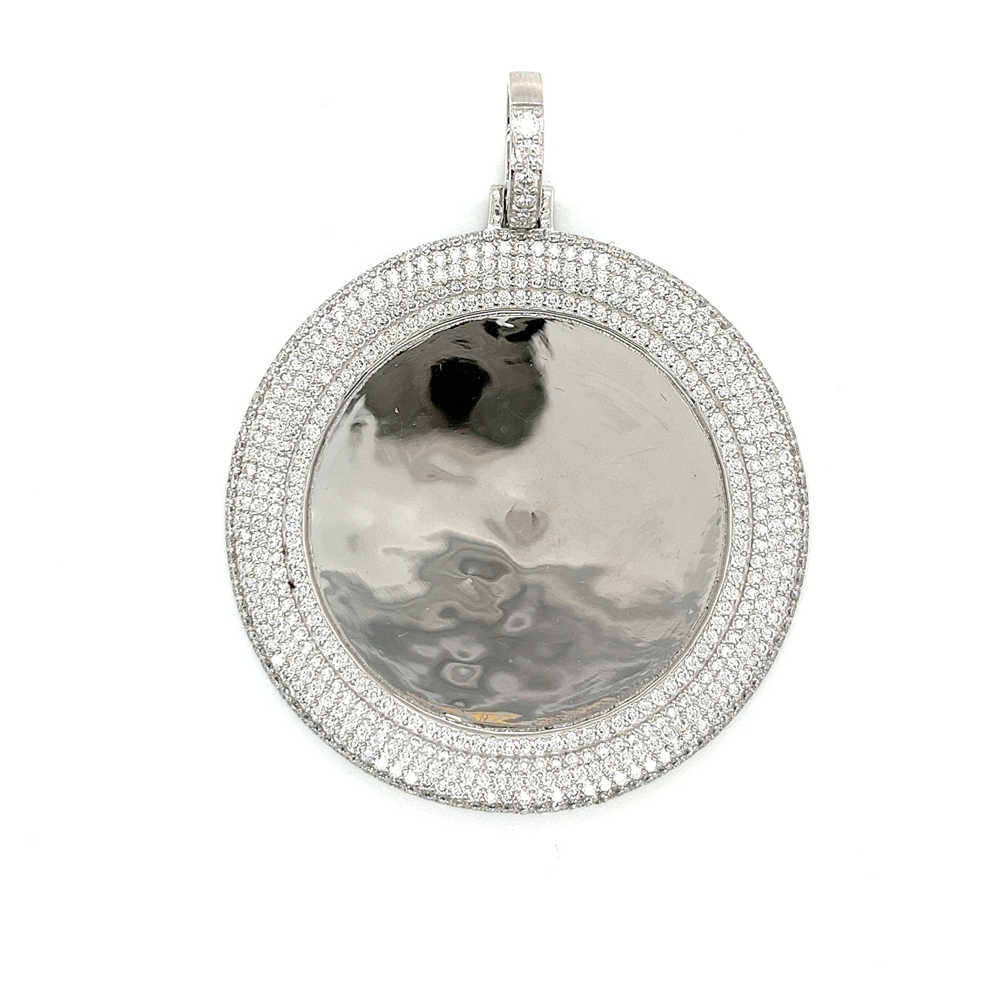 Colgante PICTURE redondo de plata de ley 925, con un generoso diámetro de 2". Adornado con exquisitas piedras moissanita redondas con un total aproximado de 5,35 quilates, este colgante irradia elegancia atemporal.