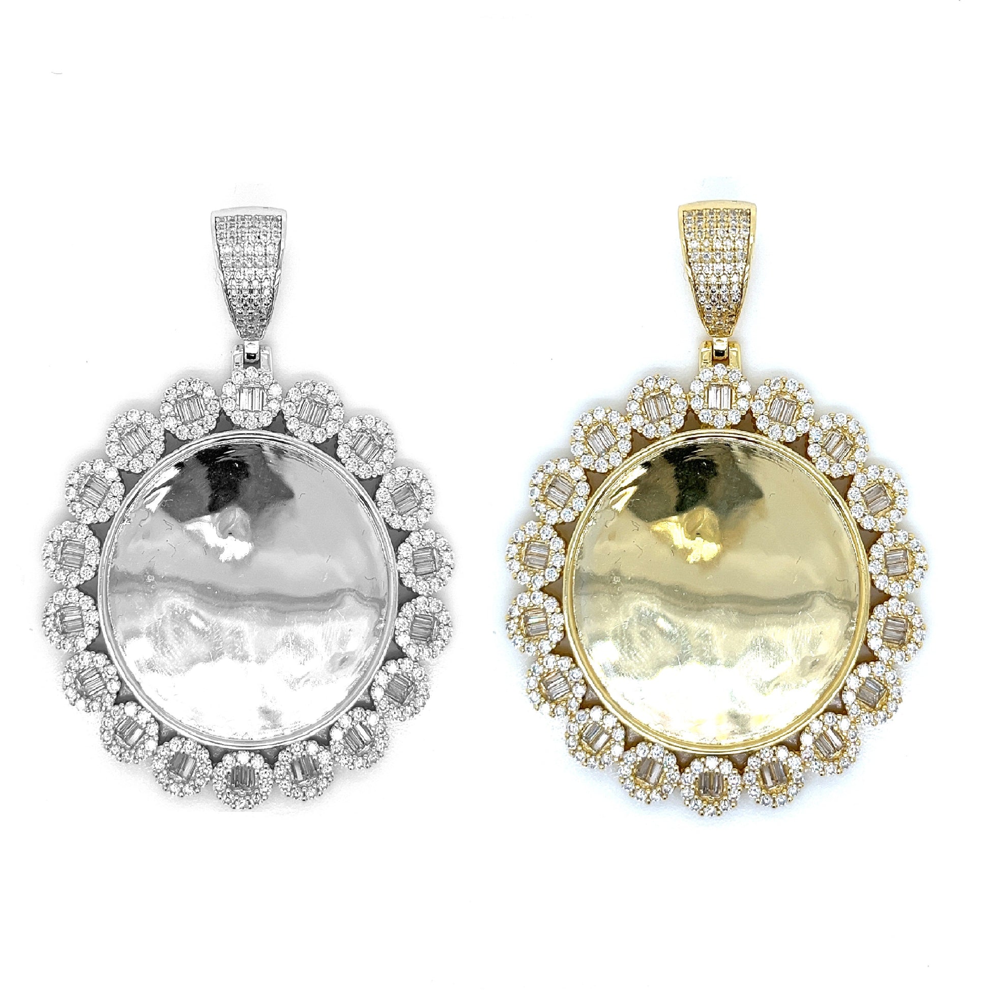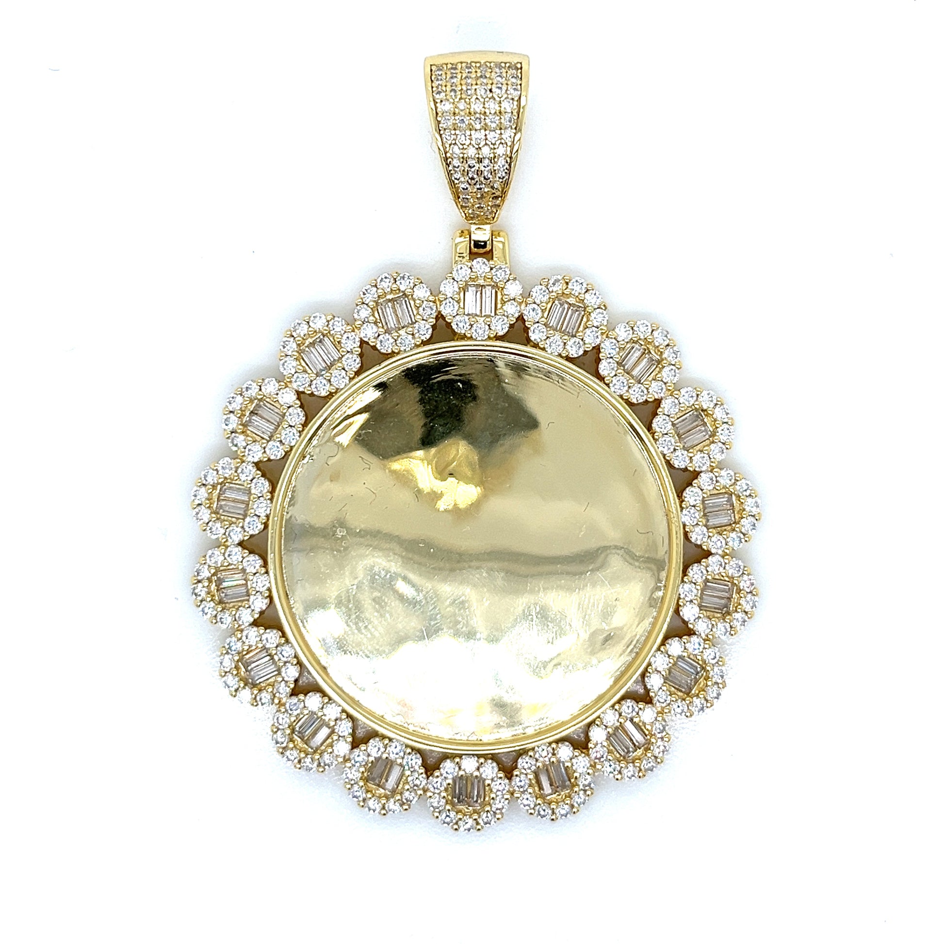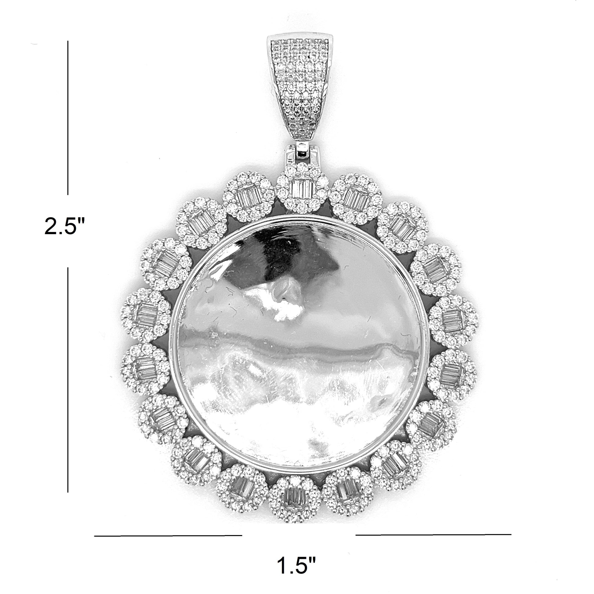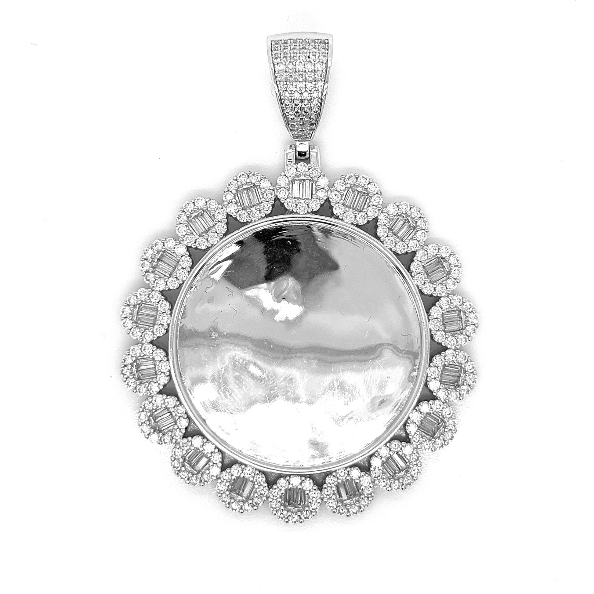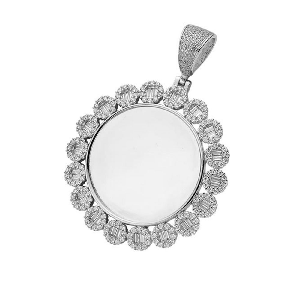 Colgante con forma de imagen redonda de plata de ley 925 adornado con aprox. 5.8CT de piedras Baguette y MOISSANITE redondas. Este colgante de 2,5" x 1,5" irradia sofisticación. Diseñado para una durabilidad duradera y un estilo inigualable.