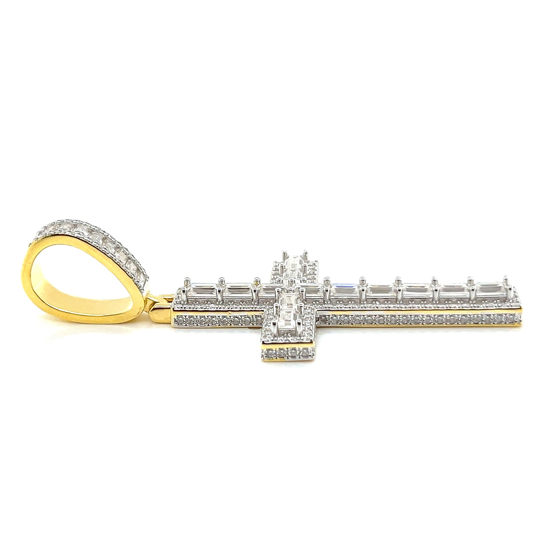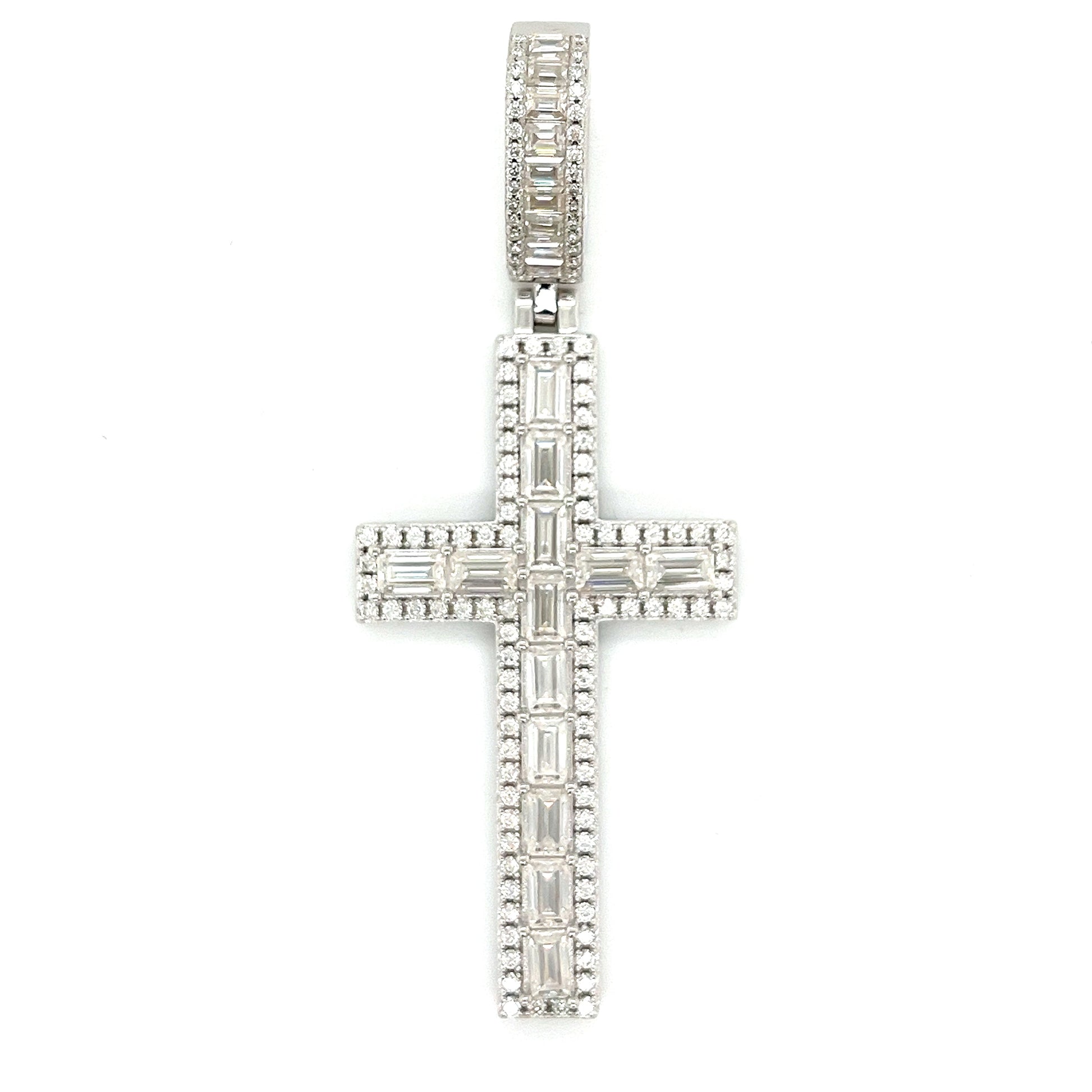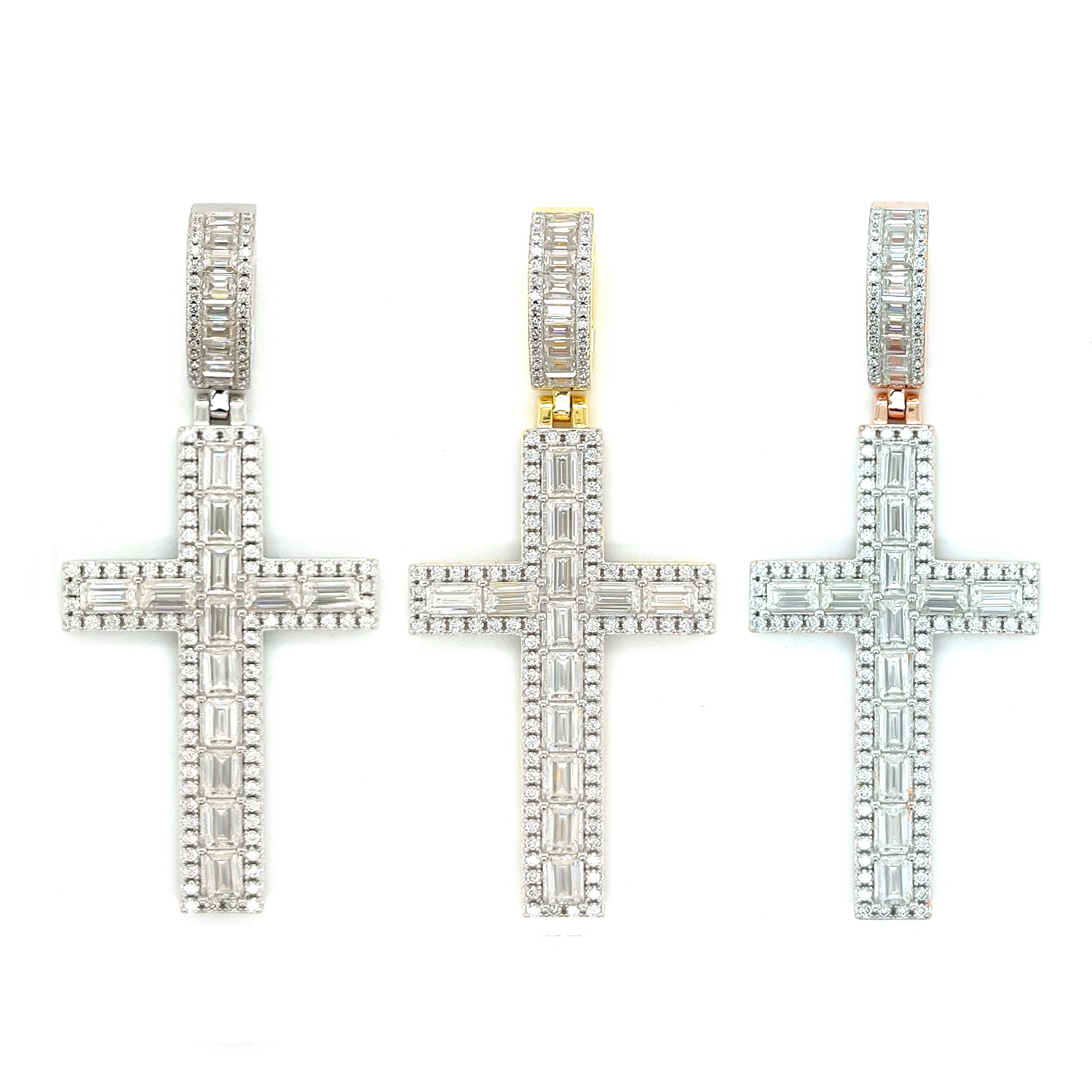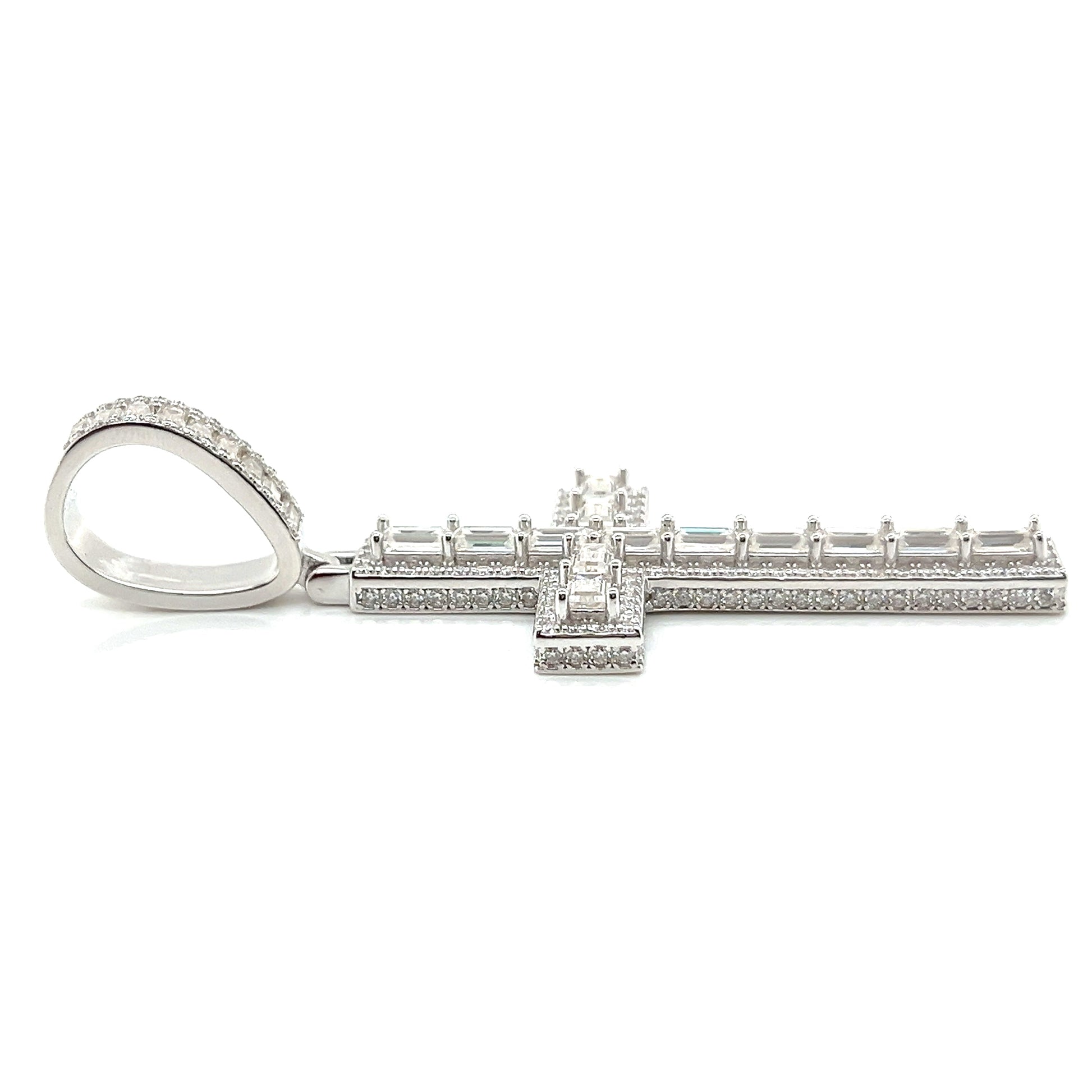 Impresionante colgante de cruz de moissanita de rodio en plata de ley 925: eleva tu estilo con esta belleza atemporal. Con aprox. 11,07 quilates de piedras moissanita redondas y baguette que añaden un toque de glamour a cualquier look.