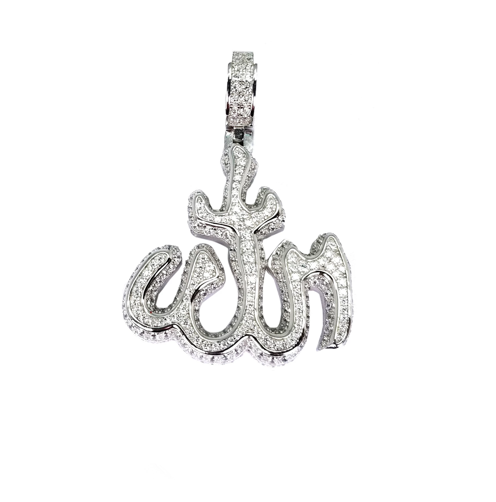 Stunning 925 Sterling Silver Rhodium CZ ALLAH Pendant : Elevate your style with this timeless beauty. Featuring 2.7"*2.1"(with bail) pendant of Round Cubic zirconia(CZ) Stones, it adds a touch of glamour to any look.
