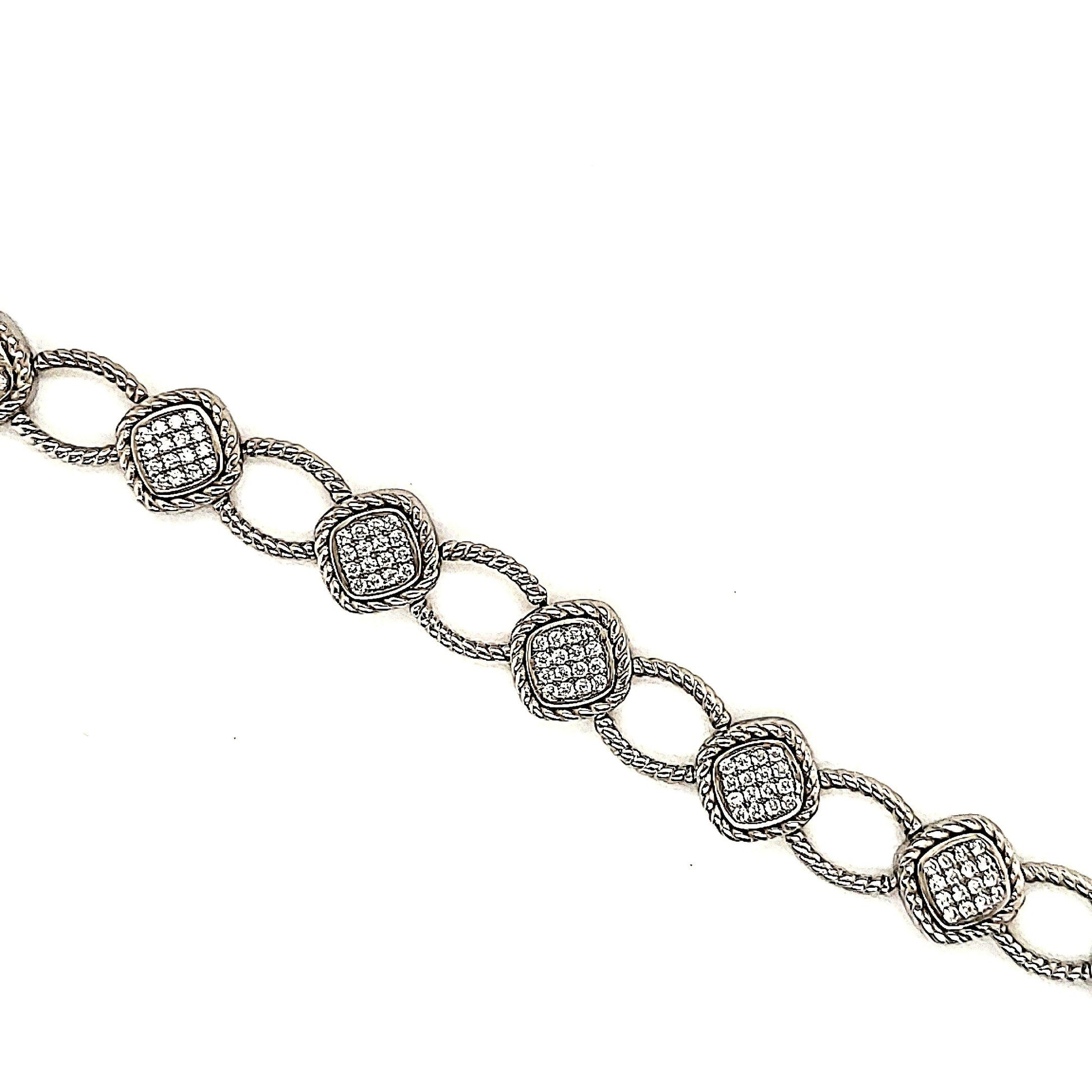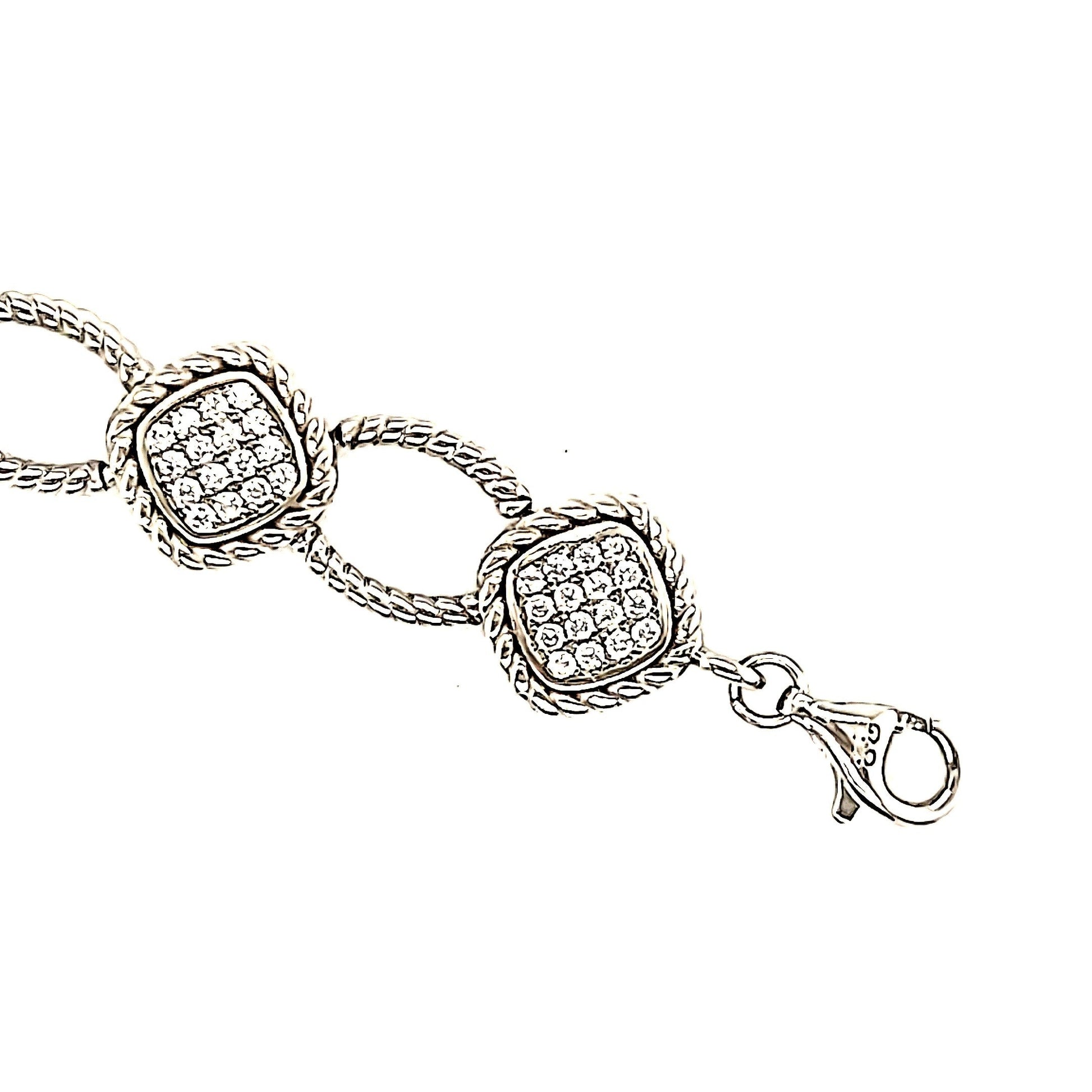 925 Sterling Silver Rhodium Plated Rhombus Link With Round CZ Stones Fancy Bracelet.