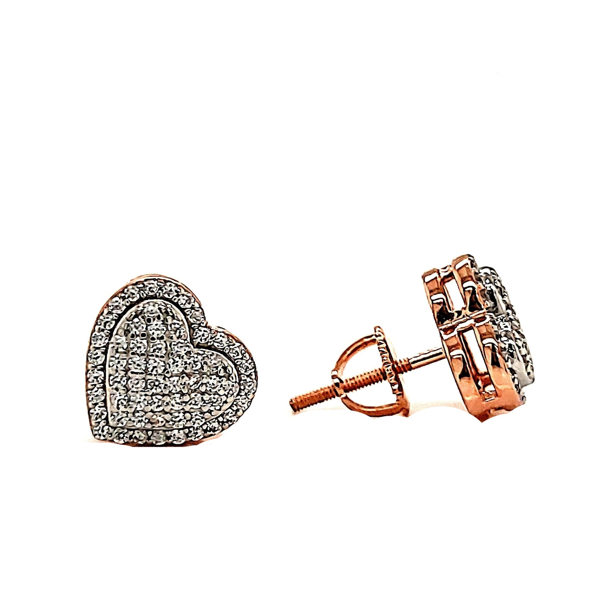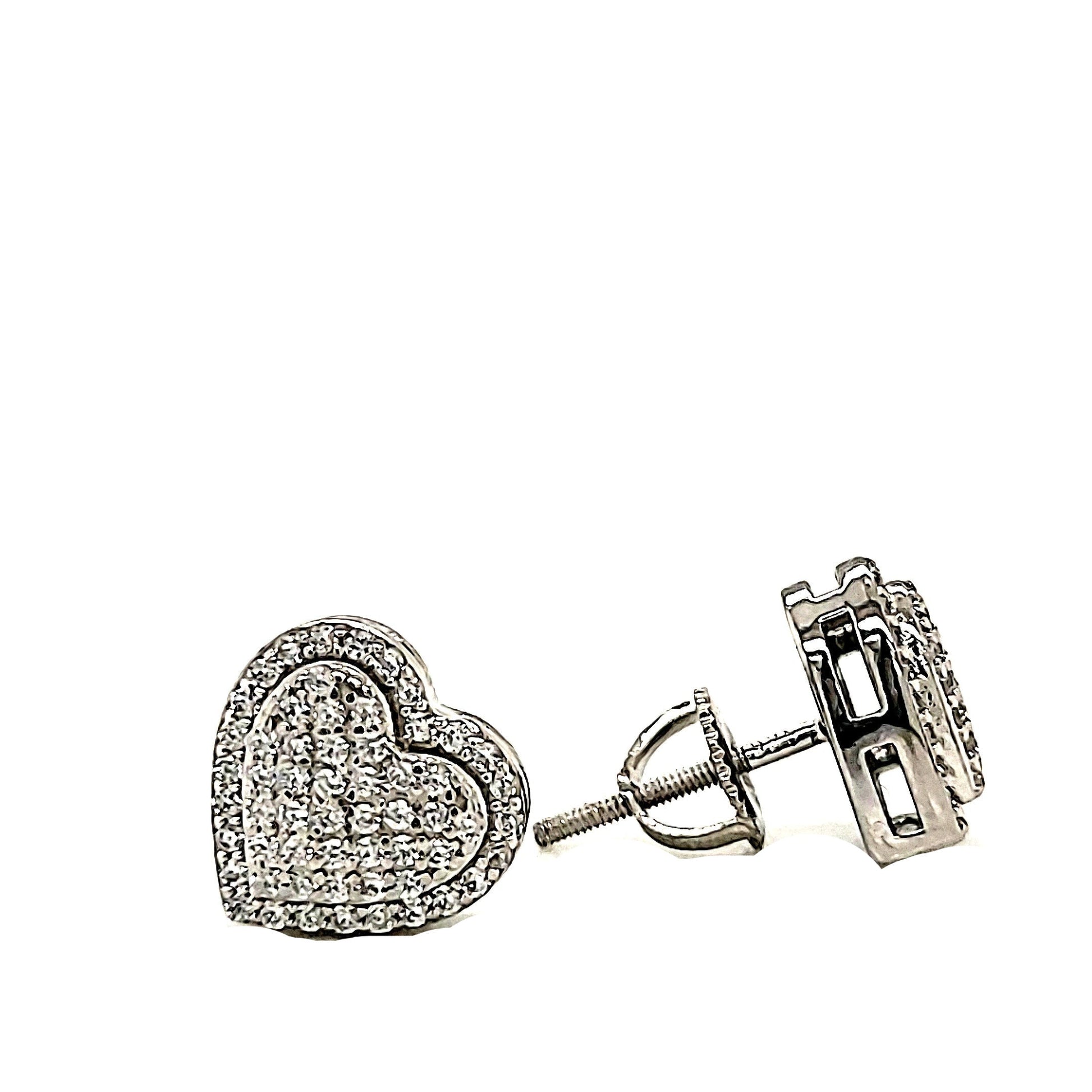 Solid 925 Sterling Silver Rhodium Finish / 14K Yellow & Rose Gold Plated Unisex Screw Back Heart Shaped Earrings With Round CZ Zirconia Stones.