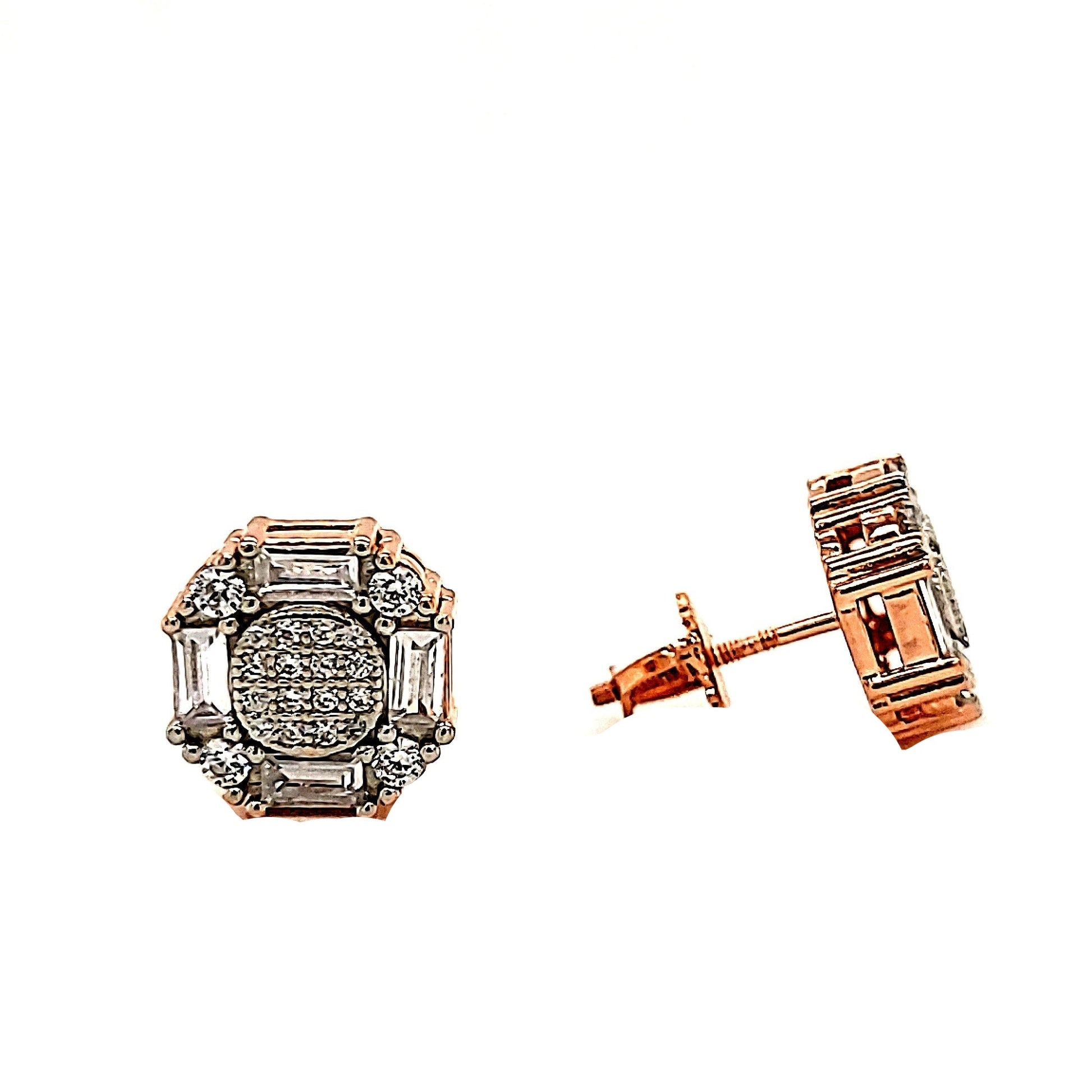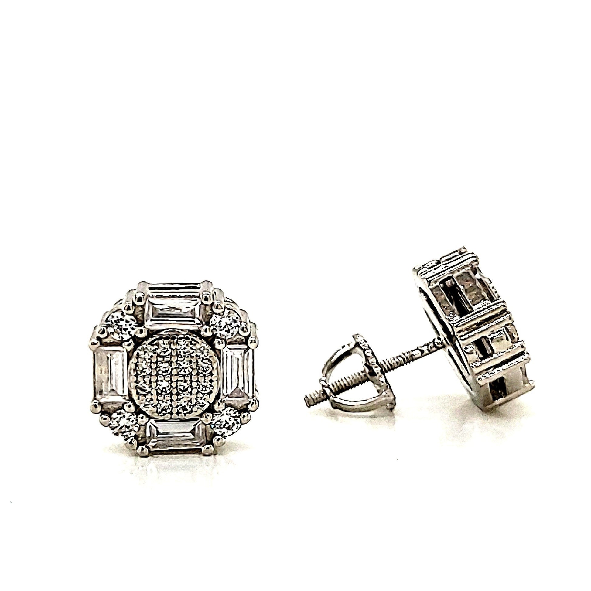 Solid 925 Sterling Silver Rhodium Finish / 14K Yellow & Rose Gold Plated Unisex Screw Back Earrings With Round/Baguette CZ Zirconia Stones.