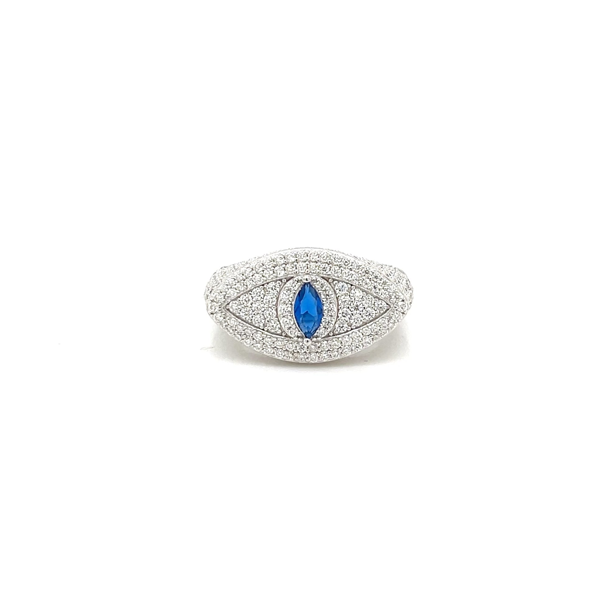 Turn heads and ward off bad vibes with this stunning Evil Eye Statement Ring, crafted in solid 925 sterling silver and set with 2.31CT of lab-created moissanite. The bold pavé design features a brilliant marquise-cut blue stone at the center, symbolizing protection, focus, and fierce style.