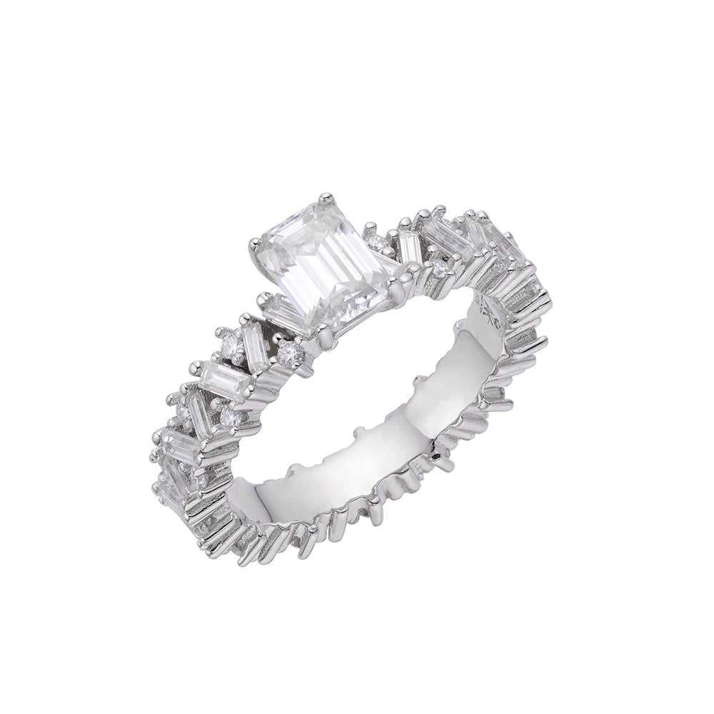 Embrace elegance with our 925 Sterling Silver RHODIUM RING : In White Silver & White 14K Yellow Gold adorned with approx. stunning 2.46CT for size 5, 2.6CT for size 6, 2.72CT for size 9, with EMERALD & Round Moissanite Stones. Unleash the beauty of nature on your fingertips.